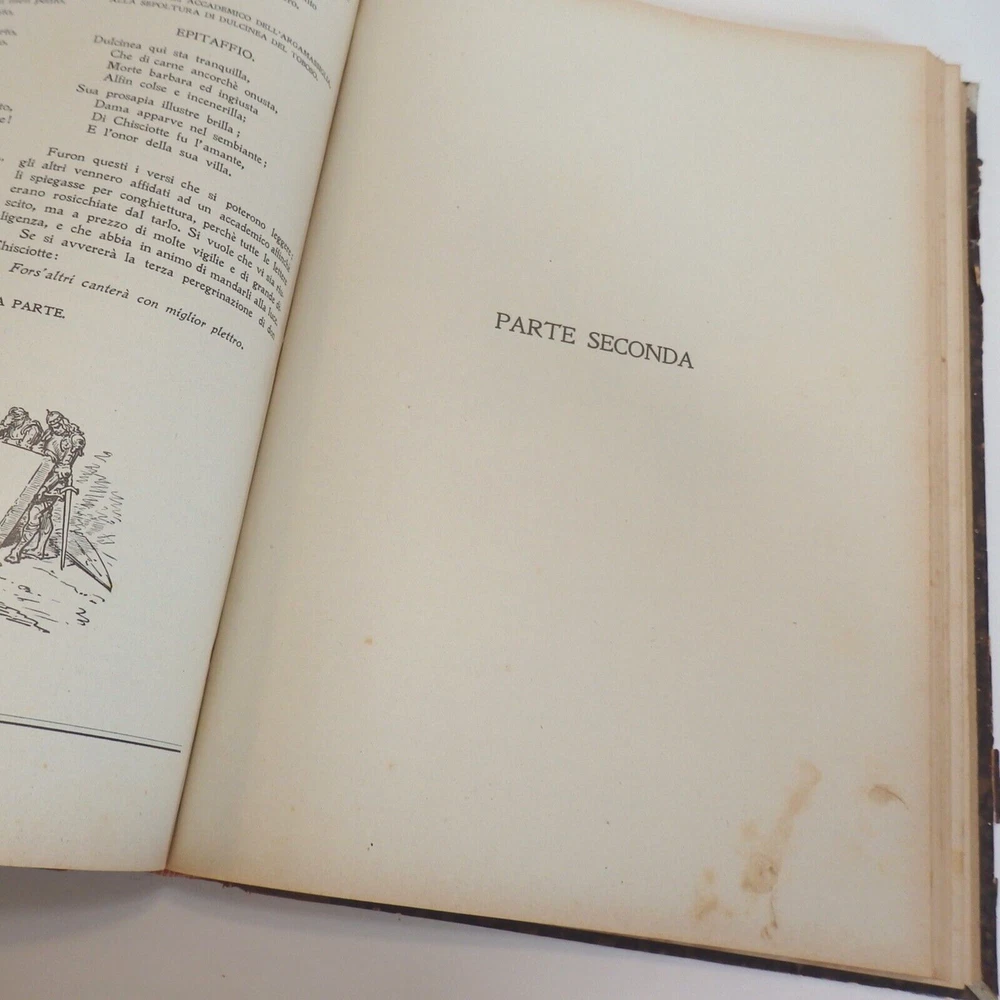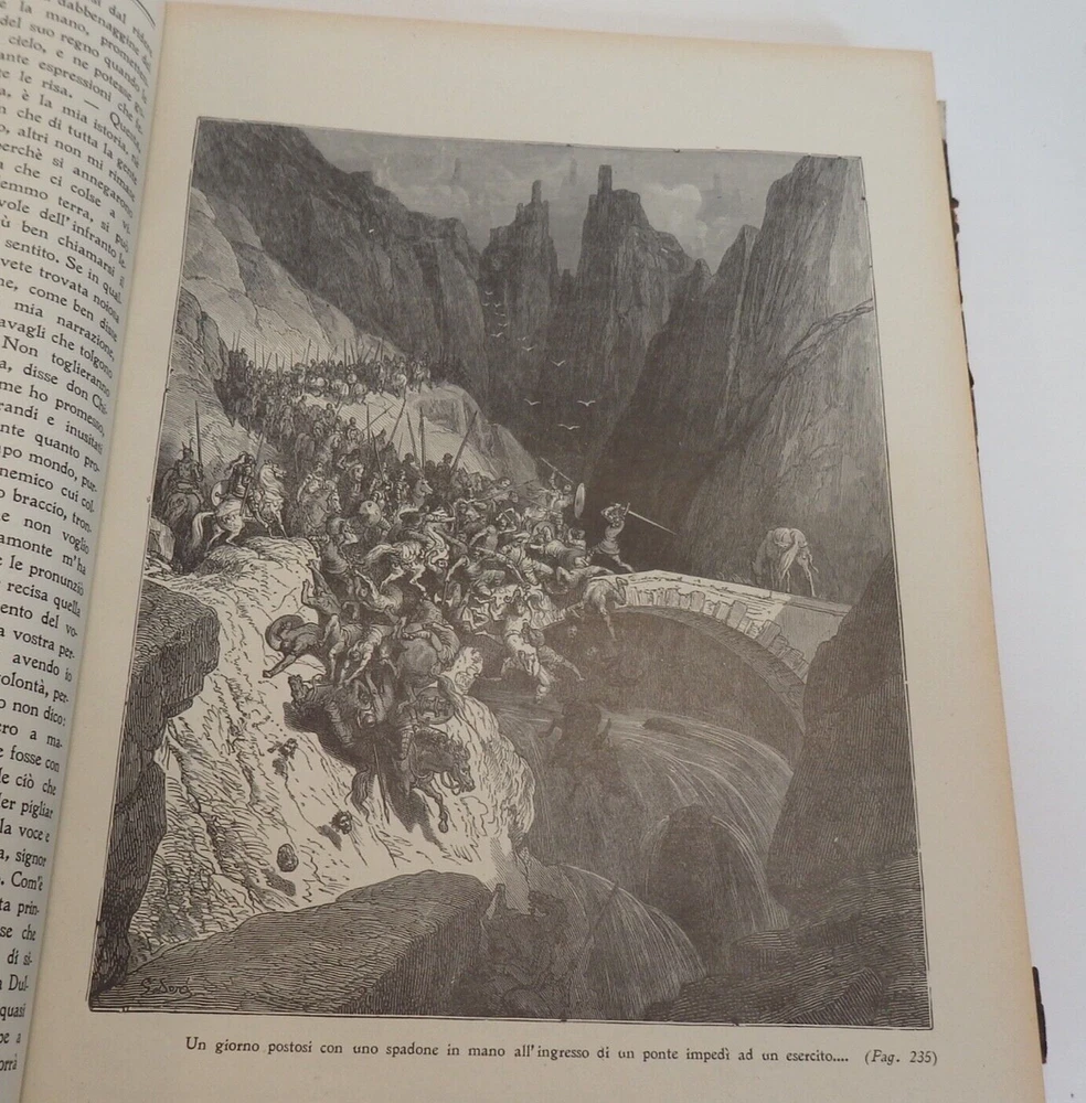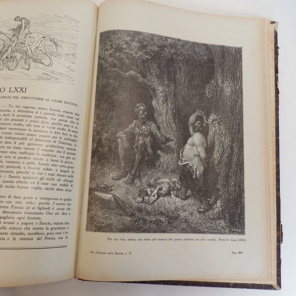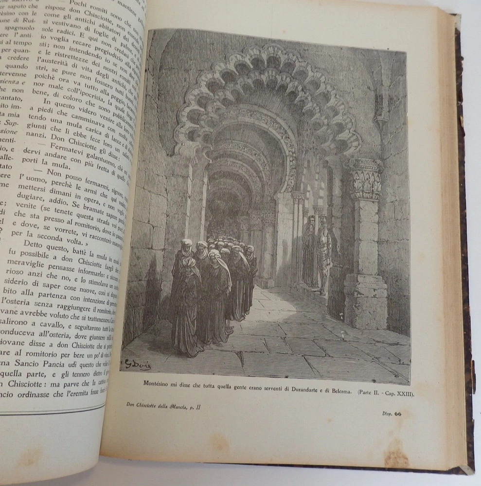 The famous Doré illustrated edition of Cervantes, in Italian. This is a lovely copy of this splendidly illustrated edition published in 1925. Gustave Dore is one of the most popular and greatest of all illustrators of Don Quixote. Doré went from being virtually unknown to being one of the most famous illustrators in the world. This edition of 808 pages has over 100 superb full page illustrations by Gustav Dore, whose depictions of the knight and his squire, Sancho Panza, have become so famous that they have influenced subsequent readers, artists, and stage and film directors' ideas of the physical "look" of the two characters. These pictures are romantic, dramatic, and very beautiful. Dore's original drawings were drawn in the 1800s were done as wood engravings. I accept returns. #BB