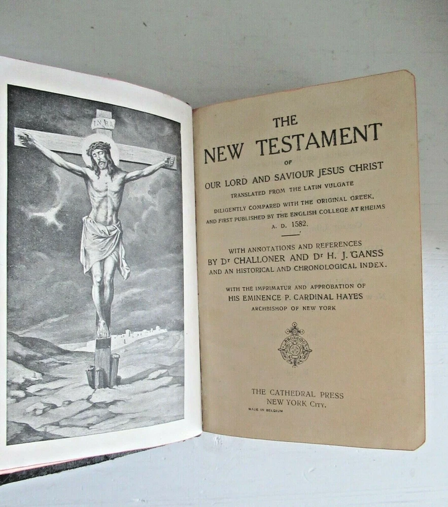 WE ARE NOT OFFERING GLOBAL OR INTERNATIONAL SHIPPING AT THIS TIME Antique Book Early 1929 "New Testament" Religious Leather Bound Publishers "The Cathedral Press" New York City, 687 Pages. With the Imprimatur and Approbation of His Eminence P. Cardinal Hayes, Archbishop of New York With Annotations and references by Dr. Challoner and Dr. H. Ganss and an Historical and Chronological Index. Written in English but made in Belgium. Copyright date in back of book, Feb. 1929 Approx measurement is 5" x 3-1/2" Excellent condition, little age related wear on outer edges but otherwise in good antique condition. Normal slight minimal yellowing of pages from age. We try to describe each item to the best of our ability. Feel free to inquire with questions before bidding. We will ANSWER THEM in a timely manner as best we can. We do not accept returned items so please review pictures and descriptions of items before bidding. Our goal is to describe all items to avoid problems later, But we are not experts on all subjects. See below for special shipping policy……See below for return policies and conditions... PAYMENT DUE AT AUCTION END PLEASE----IF THERE IS A PROBLEM HOLDING UP YOUR PAYMENT, PLEASE EMAIL US, WE WILL TRY TO WORK WITH YOU. WE UNDERSTAND LIFE ISSUES HAPPEN. Please Communicate with us, We cannot assist you if we do not hear from you!!! We only accept Payments THROUGH PAYPAL. You can make arrangements with PayPal on payment type. IF YOU DO NOT HAVE PAYPAL ACCOUNT YOU CAN STILL USE THE SERVICE, IT WILL GIVE YOU A CHOICE AS TO WHAT FORM OF PAYMENT TO USE. iT MAY TAKE A LITTLE LONGER FOR YOUR PAYMENT TO CLEAR. WE WILL HOLD ITEM FOR SHIPPING UNTIL WE HEAR FROM PAYPAL.. WE DO NOT ACCEPT RETURNED ITEMS--- we do not accept returns for items you have bid on due to buyer’s remorse, or changed your mind, or you did not read description and it is was not what you really wanted. RETURN SHIPPING COSTS ARE TO BE PAID BY BUYER. Only!! If our item description is grossly misstated, inaccurate, damaged, etc. will we consider accepting returned item. Postage & handling fee are Non-Refundable ++ 25% restocking fee of the item purchase price is the responsibility of Buyer, only after approval of Seller on all returned items. Once we receive the item returned we will calculate the amount based on the item and circumstances and refund to your PayPal account only. We will not do any other form of payment. Please inquire about items Before Bidding. POSITIVE FEEDBACK PLEASE— To gain the trust of our buyers. Our Goal is to Work for excellent Feedback. We strive to be honest and trust worthy with all ventures. Please leave a positive feedback as soon as possible after receiving your purchases . Thank you for your business and trust. Feedback Process is CRITICAL to all sellers& Buyers, it takes a lot of work and effort to strive to please all of our customers to keep good ratings. Please Do Not Threaten Negative Feedback to your advantage as a buyer to gain refunds. Please be mindful of leaving feedback for every item you order, we would greatly appreciate it. If there is a problem please contact us and give us a chance to correct the issue before filing unnecessary complaints. We know, no one is perfect and mistakes are made, including us. SHIPPING AND HANDLING--- HANDLING /SHIPPING TIME AFTER CLEARED PAYMENT IS RECEIVED. As soon as your payment is cleared with Pay Pal, please allow 1-2 handling/shipping week days to get into the mail. If payment is clear before then, we will do our best to ship as soon as possible. We try to ship day after payment received unless it is holiday or falls on a weekend. Average handling /shipping time is approx. 1-2 day, but cannot second guess the postal service. If your winning bid falls on a holiday or weekend, it may take an extra day or so to get it out to you. Some areas are slower than others.