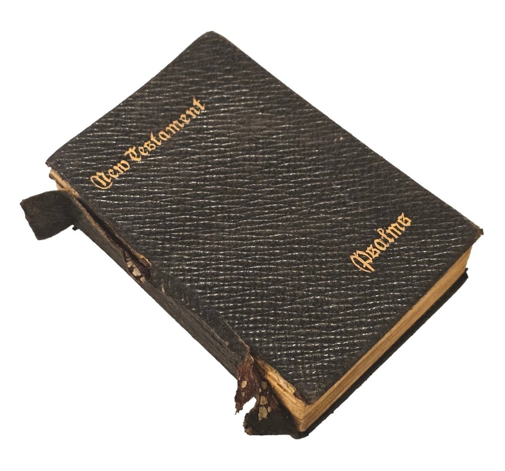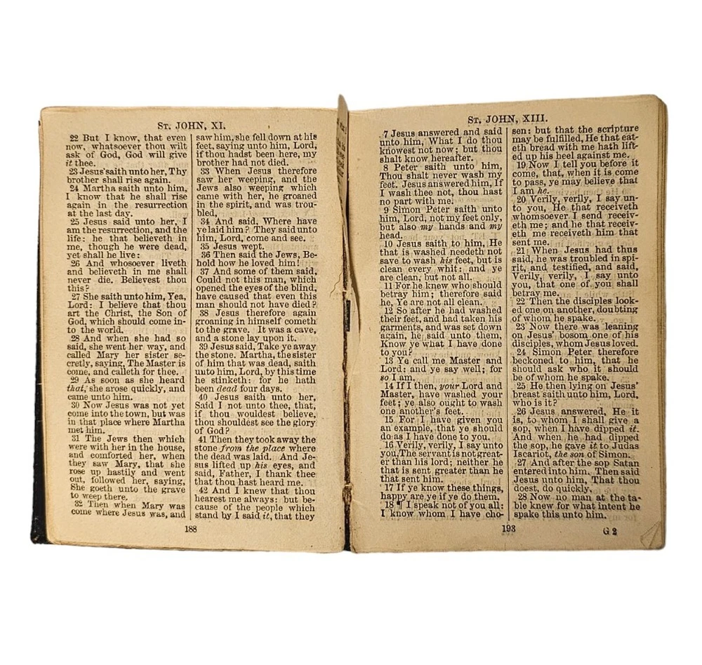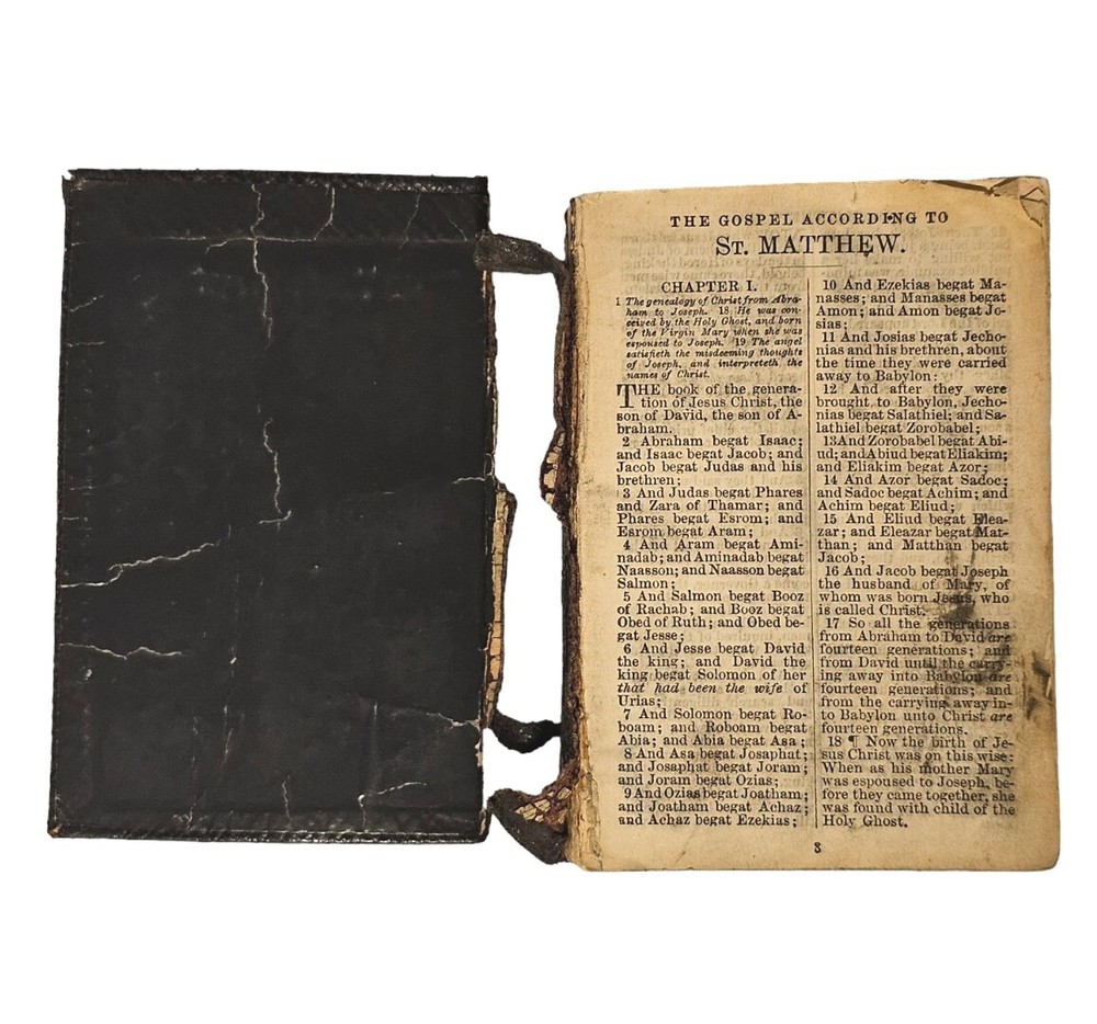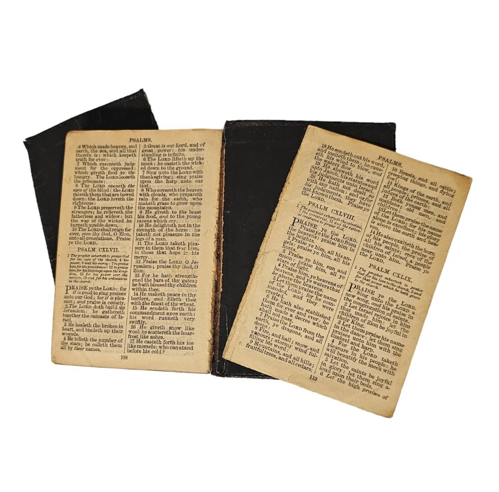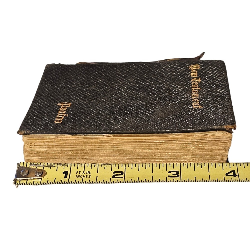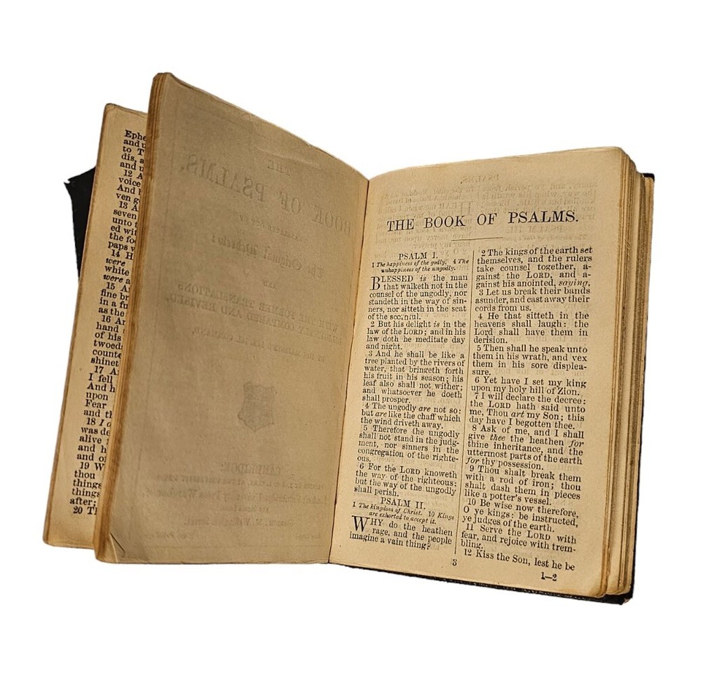 A vintage and antique Bible, this leather bound edition is from Cambridge University Press. The book contains the New Testament and Psalms in the King James translation, KJV. This compilation is perfect for those interested in religious and spiritual topics, specifically the Bible. The bible has a leather cover which has come apart from the front cover and is peeling at the binding as well. The pages are lined with gold trim. There are 2 pages missing from the book of John. Despite some damage, this book is in descent condition. All defects can be seen in the photos. Bible is sold as is seen in pictures. Please message with any questions before purchasing. Thanks for looking.