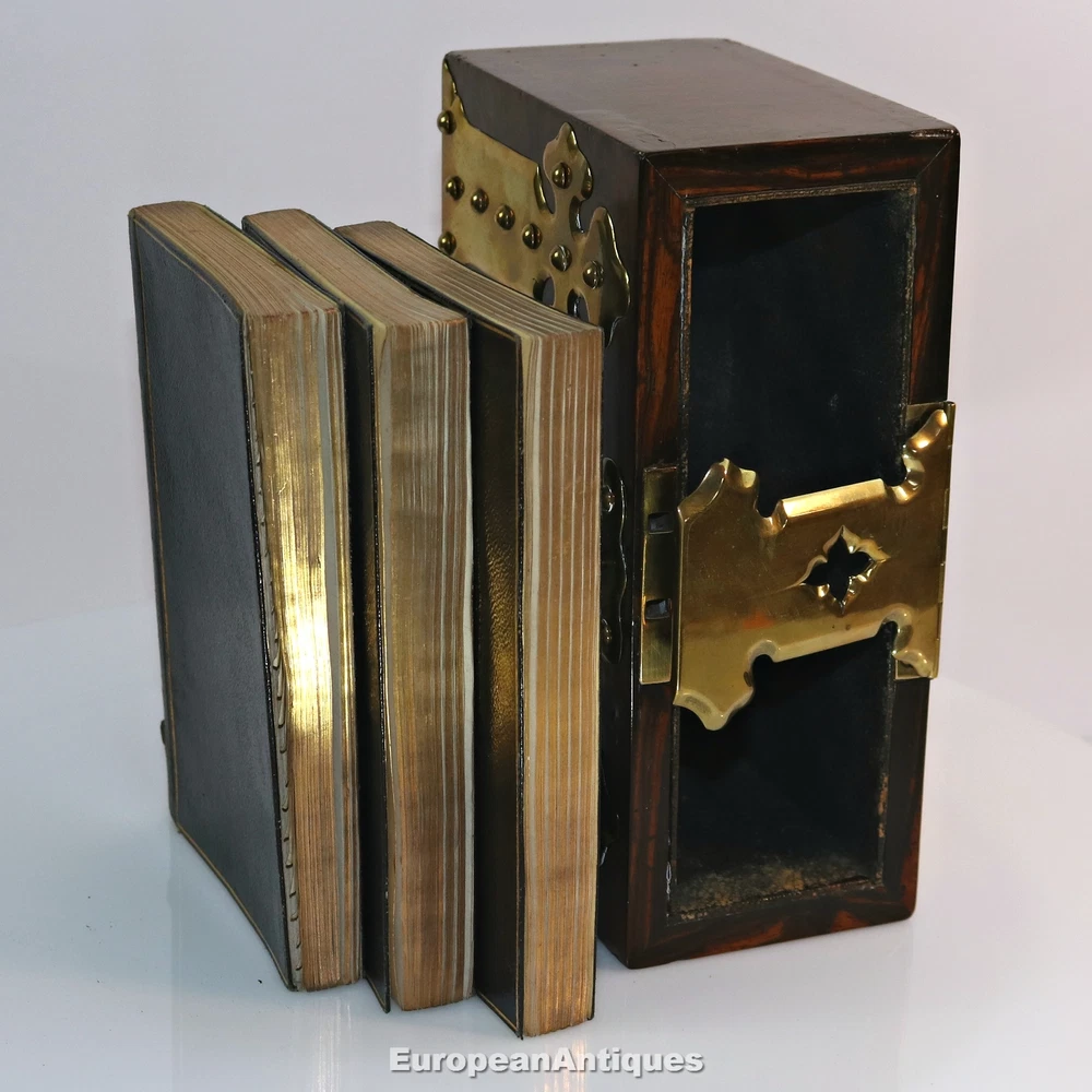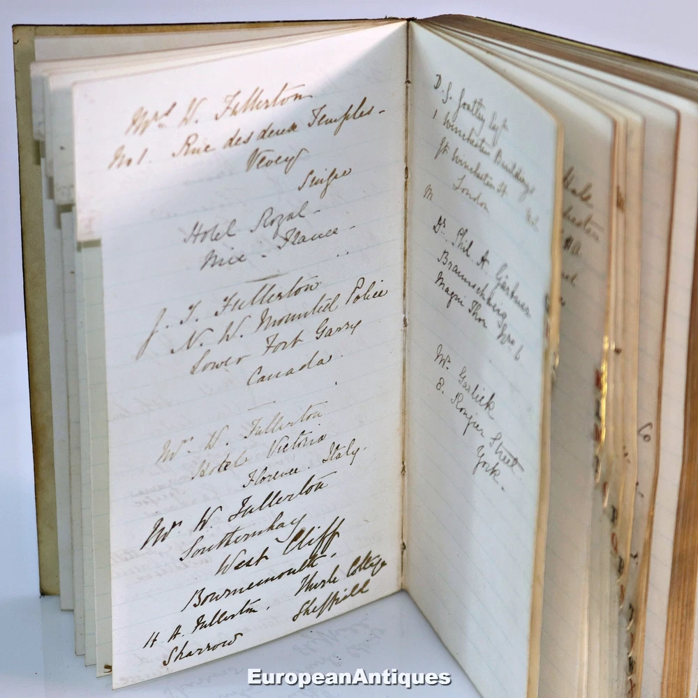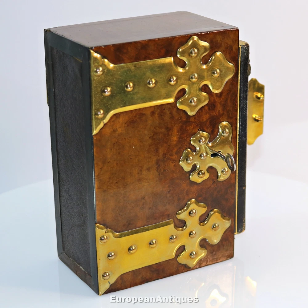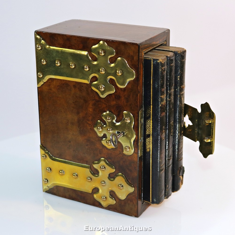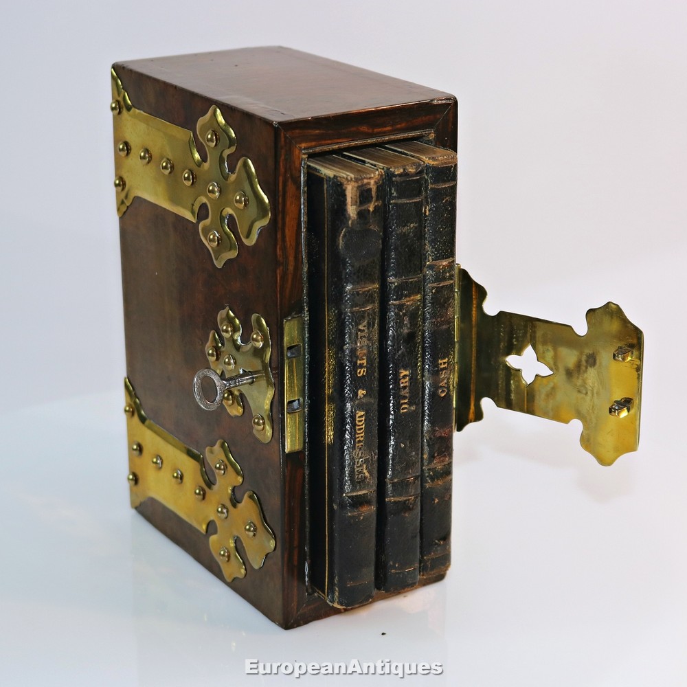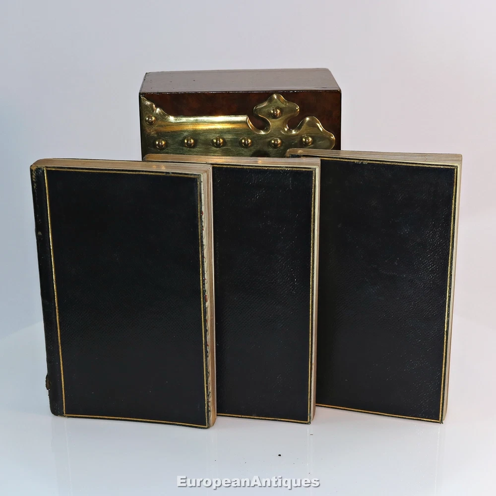 Antique English Burl Walnut Slipcase Book Box Cash, Diary, & Address Book London c.1860 Description: A wonderful Victorian book box made from Burl Walnut Veneer on top of Coromandel. Box is filled with a bank of three gilt edged leather-bound housekeeping books Cash, Diary, & Visits & Addresses. This example is made from exotic Burl Walnut Veneer overlaid on to Coromandel wood and beautifully brass bound with gothic cast brass straps, with a matching large brass escutcheon to the front which houses the working key. The key opens the heavy reticulated brass clasp to the top. The interior is finished in a deep blue leather lining and the base is sprung .. this would allow the books to be pressed down, the clasp shut and locked creating a tight fitting. The address book is the only book that was used of the 3 books. The other two books (Cash & Diary) remain blank. But the address book is filled with approximately 100 people and places living in Great Britain as well as people located all over the world. A great many of them are located in India, Canada, and Hong Kong. One of the many people listed is Major General Sir Lee Oliver Fitzmaurice Stack. (see pic. 5) (1868 – 19 November 1924) was a British army officer. Their are also many people listed with the last name of Fullerton (see pic. 6), leading us to believe that the owner was somehow related to that family. Dimensions: Approximately 7,5" tall x 2 3/4" wide x 4.5" deep Weight: 2 lbs. 7 ozs. Condition: Condition is very good for it's age and use. Lock is is good working order. Some chipping to the leather spines of the 3 books. Be sure to enlarge and zoom the image for a close up view. Please view all pictures for condition. View all photos to determine condition of item for yourself. We have been in business for over 20 years and travel to England & Europe several times per year on buying trips. Please check with us Frequently to see our newest items. Thank you. SHIPPING: I always package with care, as I am a collector myself. I ship all my items bubble wrapped & boxed. Item will Ship within 3 business day of cleared payment. Seller Inv. 5772