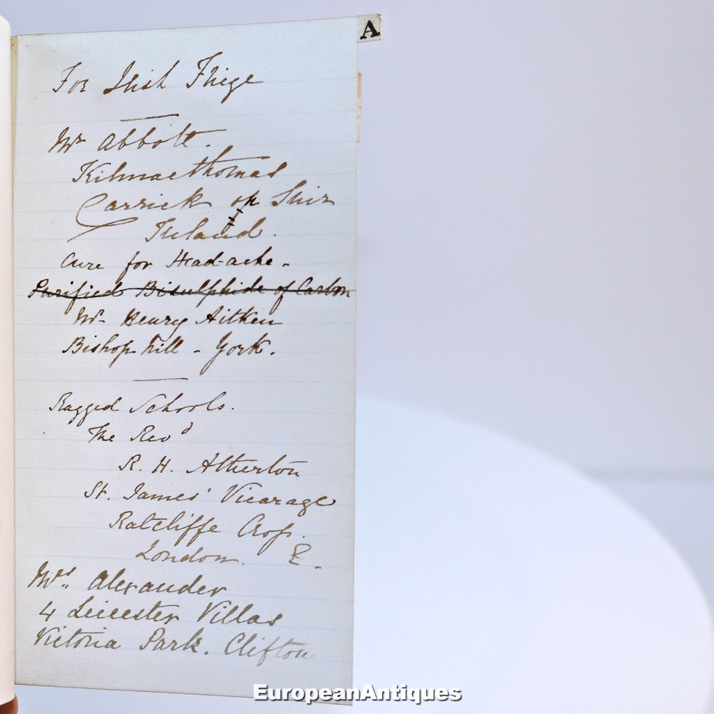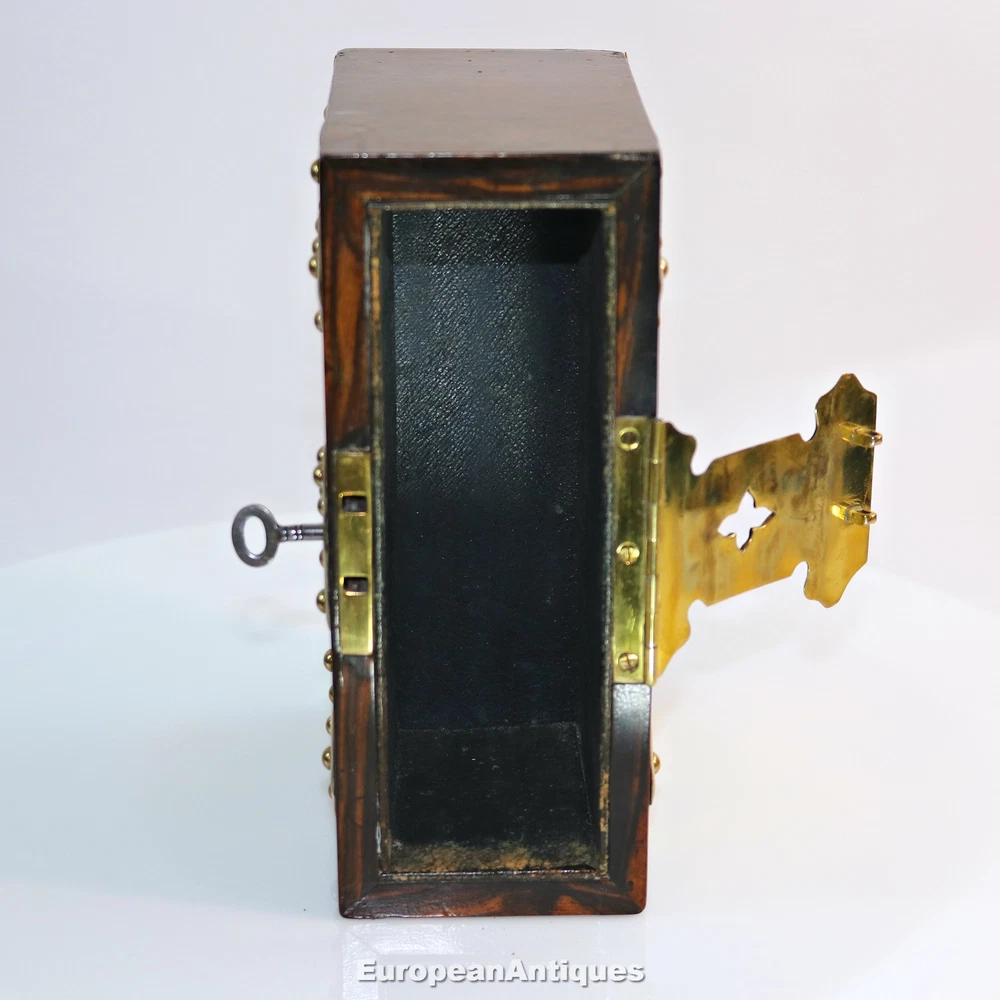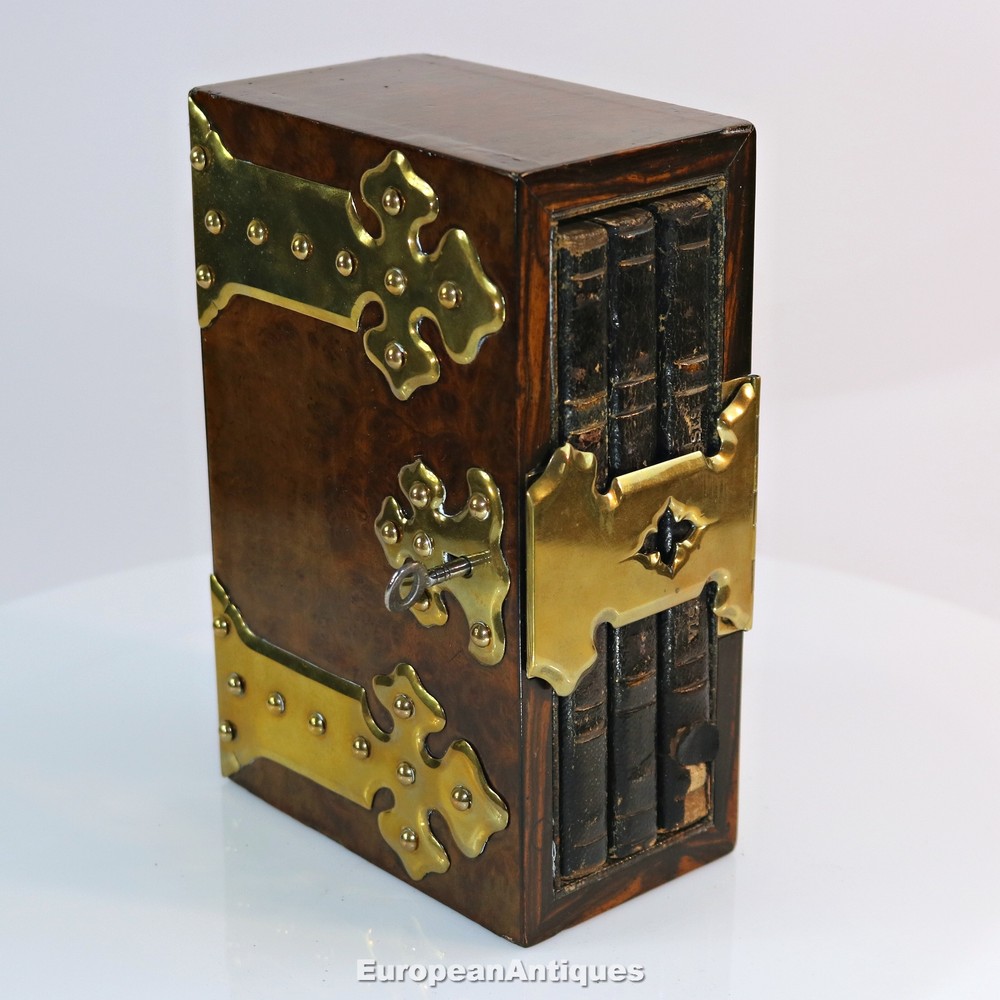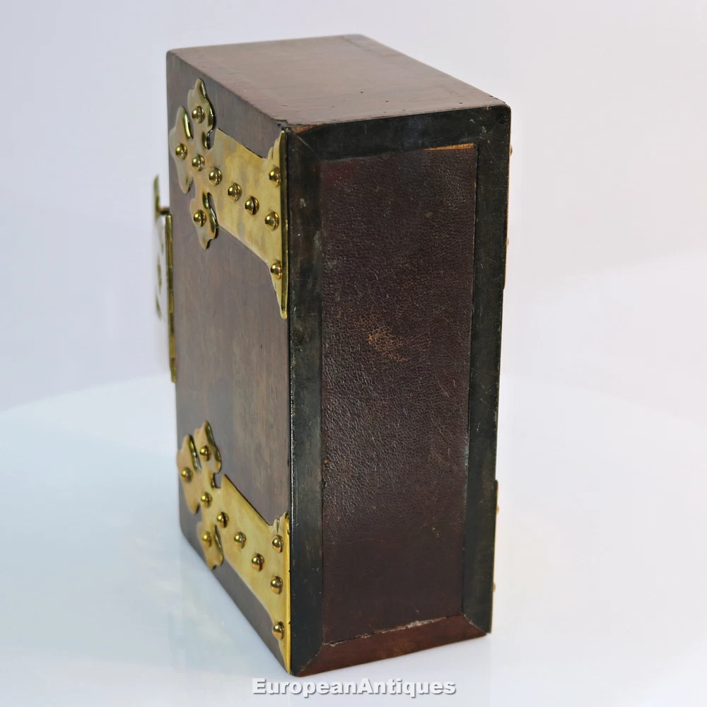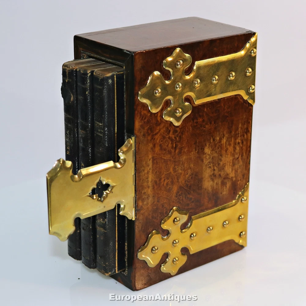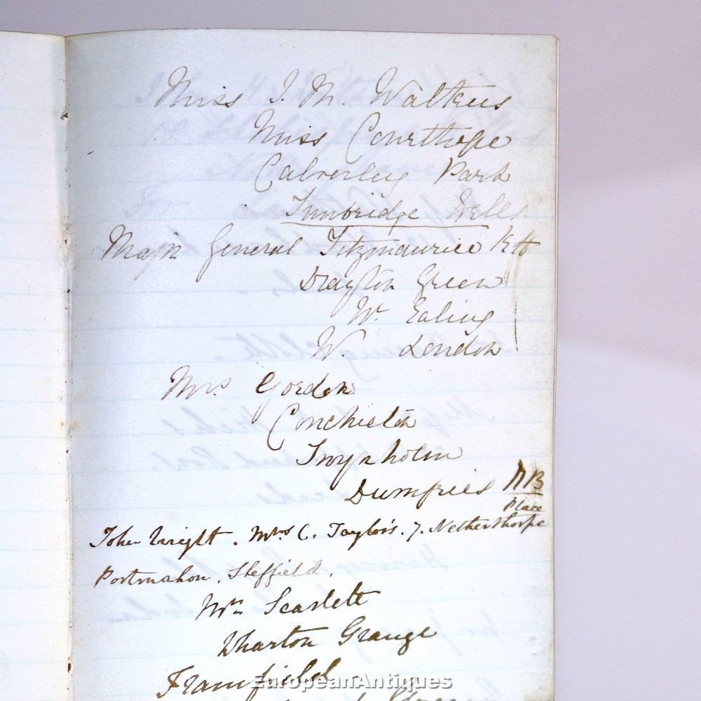 Antique English Burl Walnut Slipcase Book Box Cash, Diary, & Address Book London c.1860 Description: A wonderful Victorian book box made from Burl Walnut Veneer on top of Coromandel. Box is filled with a bank of three gilt edged leather-bound housekeeping books Cash, Diary, & Visits & Addresses. This example is made from exotic Burl Walnut Veneer overlaid on to Coromandel wood and beautifully brass bound with gothic cast brass straps, with a matching large brass escutcheon to the front which houses the working key. The key opens the heavy reticulated brass clasp to the top. The interior is finished in a deep blue leather lining and the base is sprung .. this would allow the books to be pressed down, the clasp shut and locked creating a tight fitting. The address book is the only book that was used of the 3 books. The other two books (Cash & Diary) remain blank. But the address book is filled with approximately 100 people and places living in Great Britain as well as people located all over the world. A great many of them are located in India, Canada, and Hong Kong. One of the many people listed is Major General Sir Lee Oliver Fitzmaurice Stack. (see pic. 5) (1868 – 19 November 1924) was a British army officer. Their are also many people listed with the last name of Fullerton (see pic. 6), leading us to believe that the owner was somehow related to that family. Dimensions: Approximately 7,5" tall x 2 3/4" wide x 4.5" deep Weight: 2 lbs. 7 ozs. Condition: Condition is very good for it's age and use. Lock is is good working order. Some chipping to the leather spines of the 3 books. Be sure to enlarge and zoom the image for a close up view. Please view all pictures for condition. View all photos to determine condition of item for yourself. We have been in business for over 20 years and travel to England & Europe several times per year on buying trips. Please check with us Frequently to see our newest items. Thank you. SHIPPING: I always package with care, as I am a collector myself. I ship all my items bubble wrapped & boxed. Item will Ship within 3 business day of cleared payment. Seller Inv. 5772