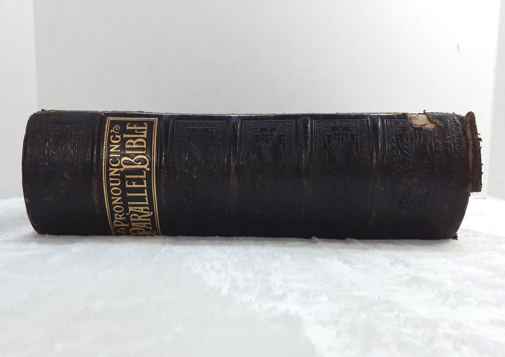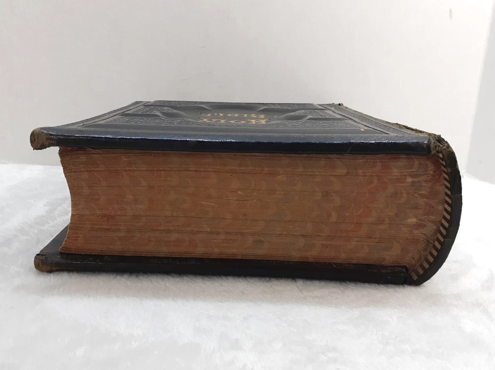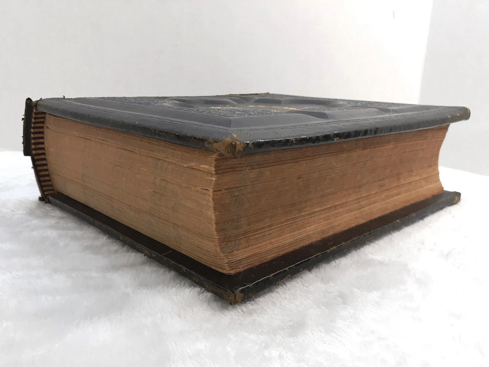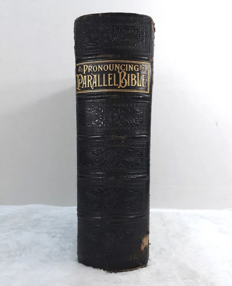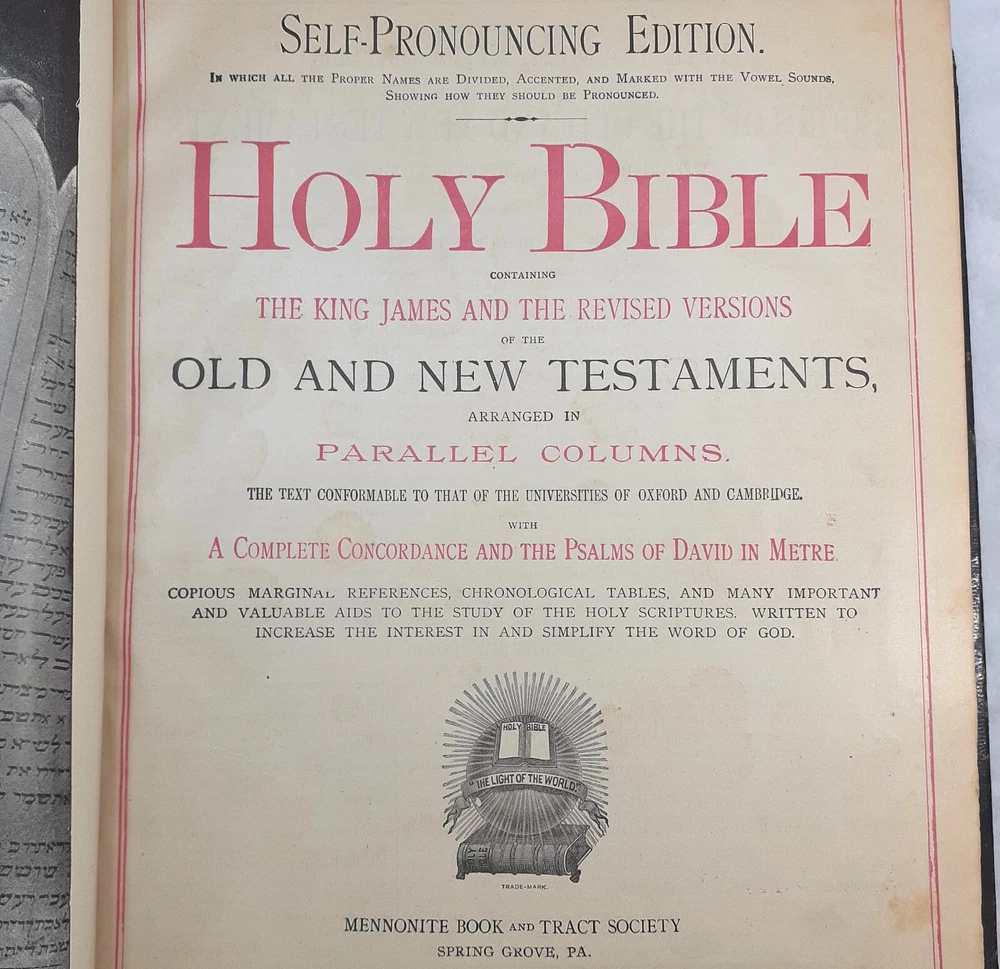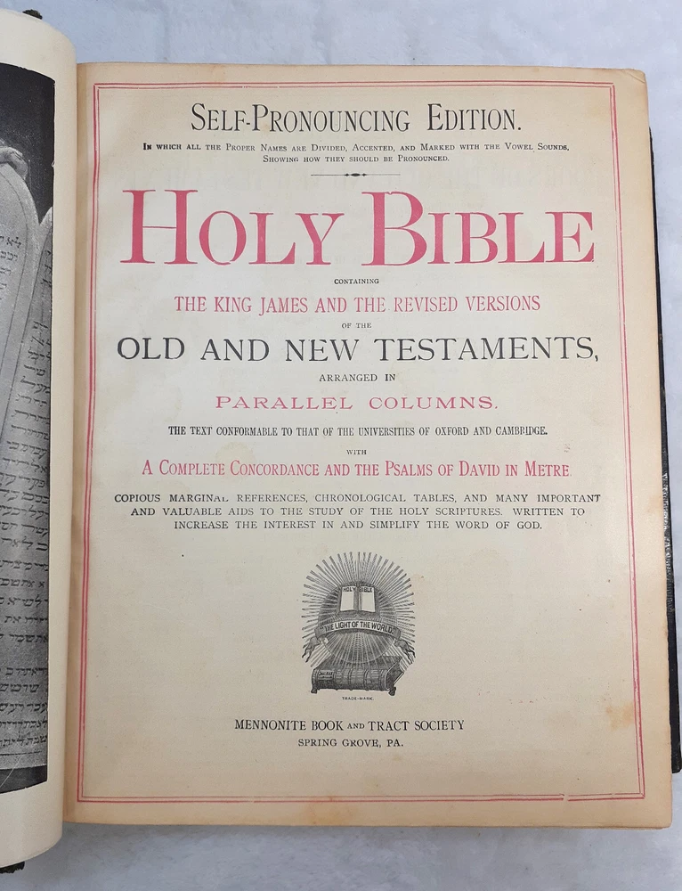Antique 1892 Family Self-Pronouncing Parallel Bible, Leather Bound, by Mennonite Book & Tract Society. Bible is in great condition for its age! Only a few folds and tears. Binding is pretty darn good for its age! Feature: - Illustrations - King James and Revised Versions - Concordance - Psalms of David in Metre - Old and New Testaments - Parables of Jesus - Family History Pages (marriages, births, deaths, temperance pledge) See more great antique, vintage and modern books in my store! Visit my store!