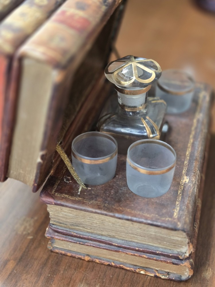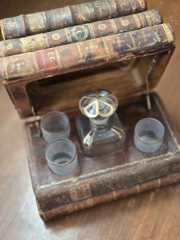 This beautiful antique piece has been in the family since 1930 but dates back much further. It is missing one of the small glasses. The hinge is the original. It is not metal. Very special piece.