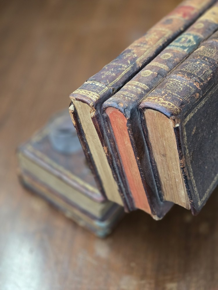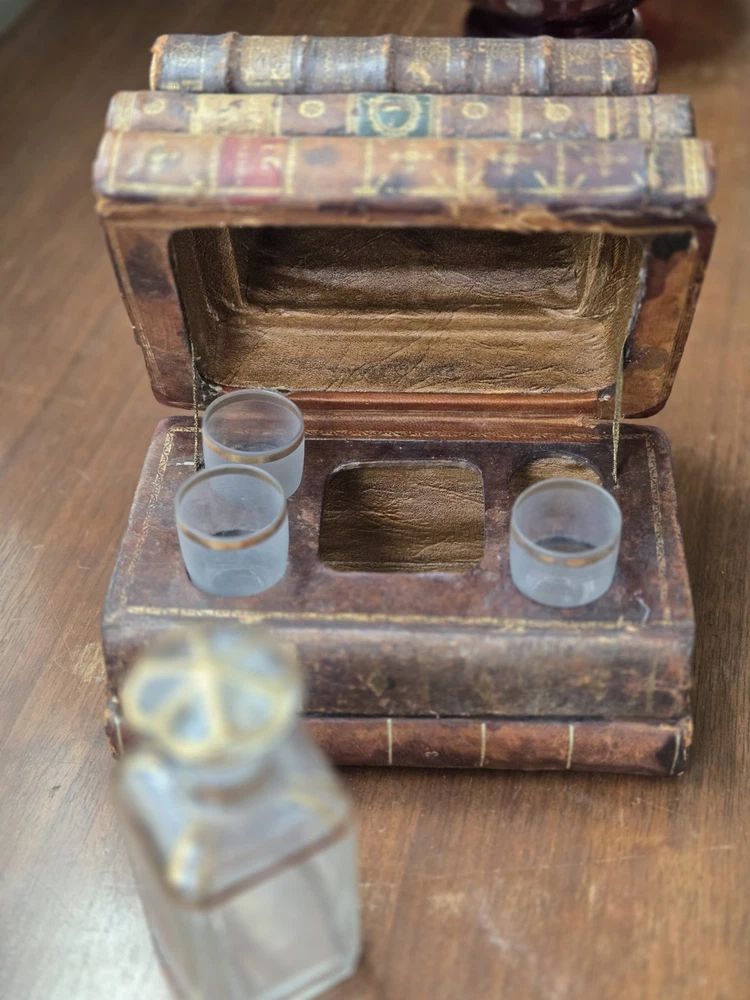 This beautiful antique piece has been in the family since 1930 but dates back much further. It is missing one of the small glasses. The hinge is the original. It is not metal. Very special piece....