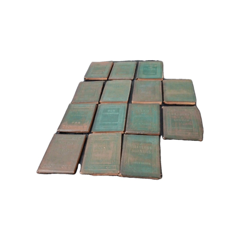 This antique leather library lot consists of 14 classic books from the 1920s, all bound in leather with a collector's edition design. The books are written in English by various authors and cover a range of topics within the classics genre. Each book is a miniature size, adding to their charm and appeal as a collector's item. These original editions are a unique addition to any literature enthusiast's collection, offering a glimpse into the literary works of the early 20th century.