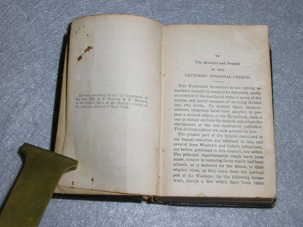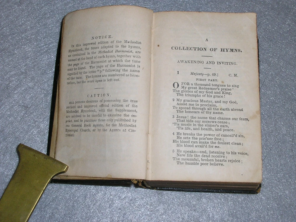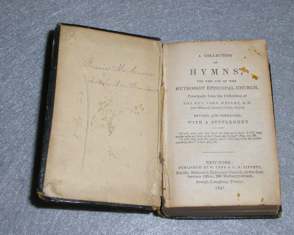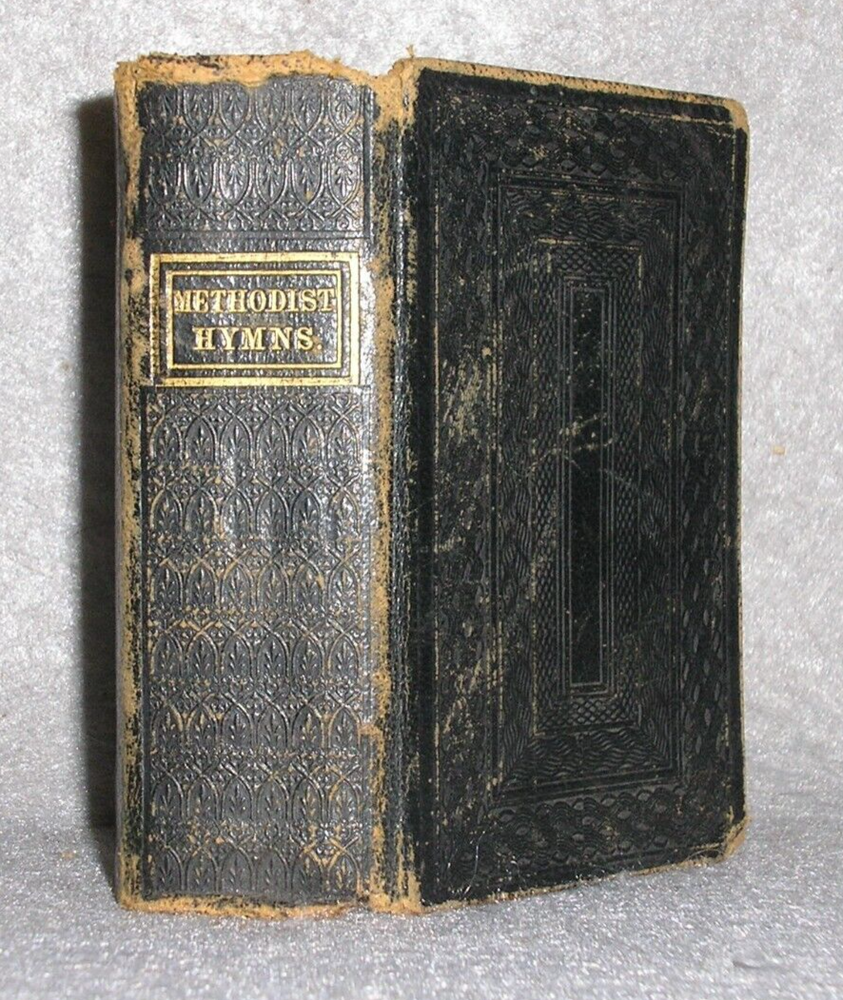 A Collection Of Hymns For the Use of The Methodist Episcopal Church, Principally from the Collection of The Rev. John Wesley Revised and Corrected. With a Supplement. New York: Published by G. Lane & C.B. Tippett, Joseph Longking, Printer. 1847. Antique, nearly two centuries old Methodist miniature or pocket edition hymnal bound in full decoratively worked leather in overall very good condition. Edges of the covers and spine show some rubbing to the leather, exterior is clean. Interior of the book shows some pencil notations as well as some scattered soiling, foxing and toning as well as a minor tatter or dog ear fold. Interior is very well intact with all text remaining legible. Binding is well intact and the book is complete with all pages present and none coming loose, detached or missing. Book totals 624 pages, measures approximately 4 x 2 1/2 x 1 1/8 inches and weighs about 1/4 of a pound.