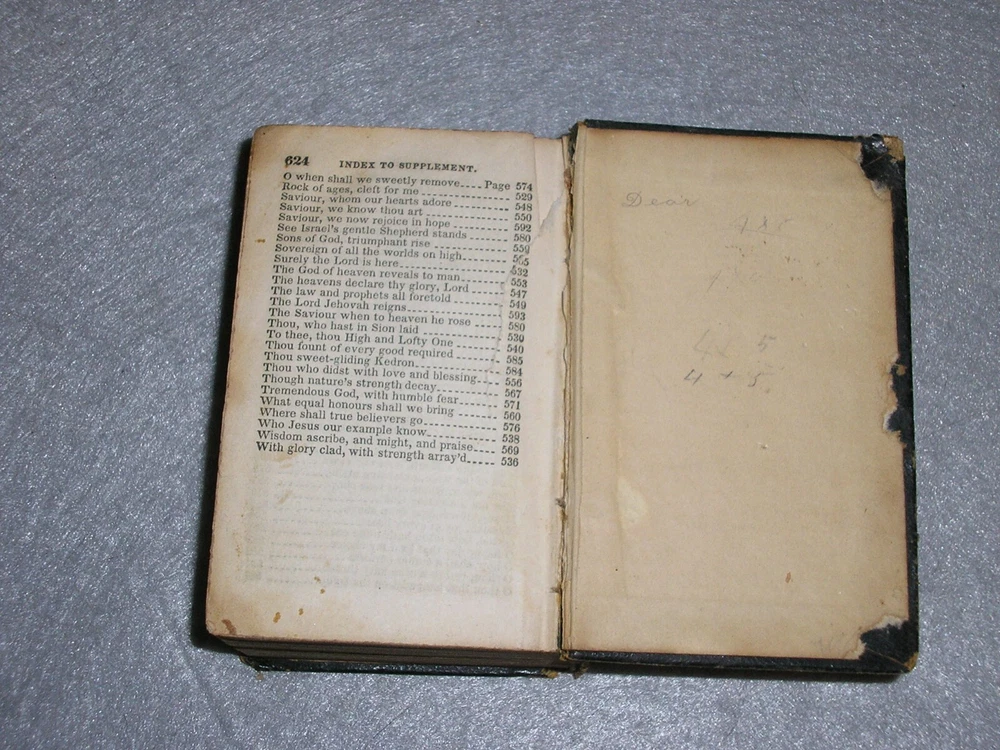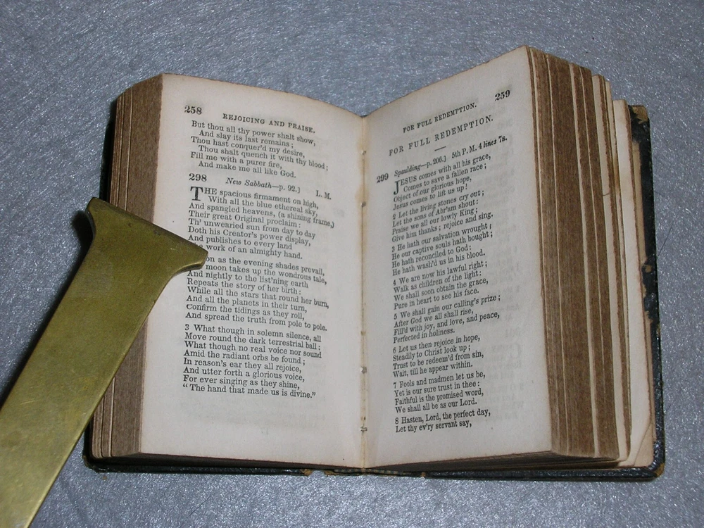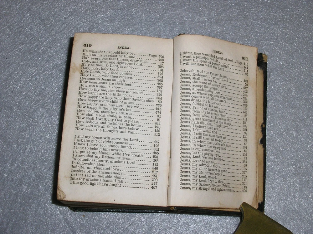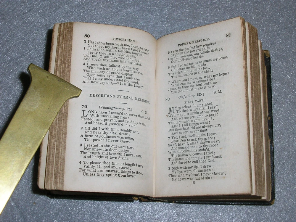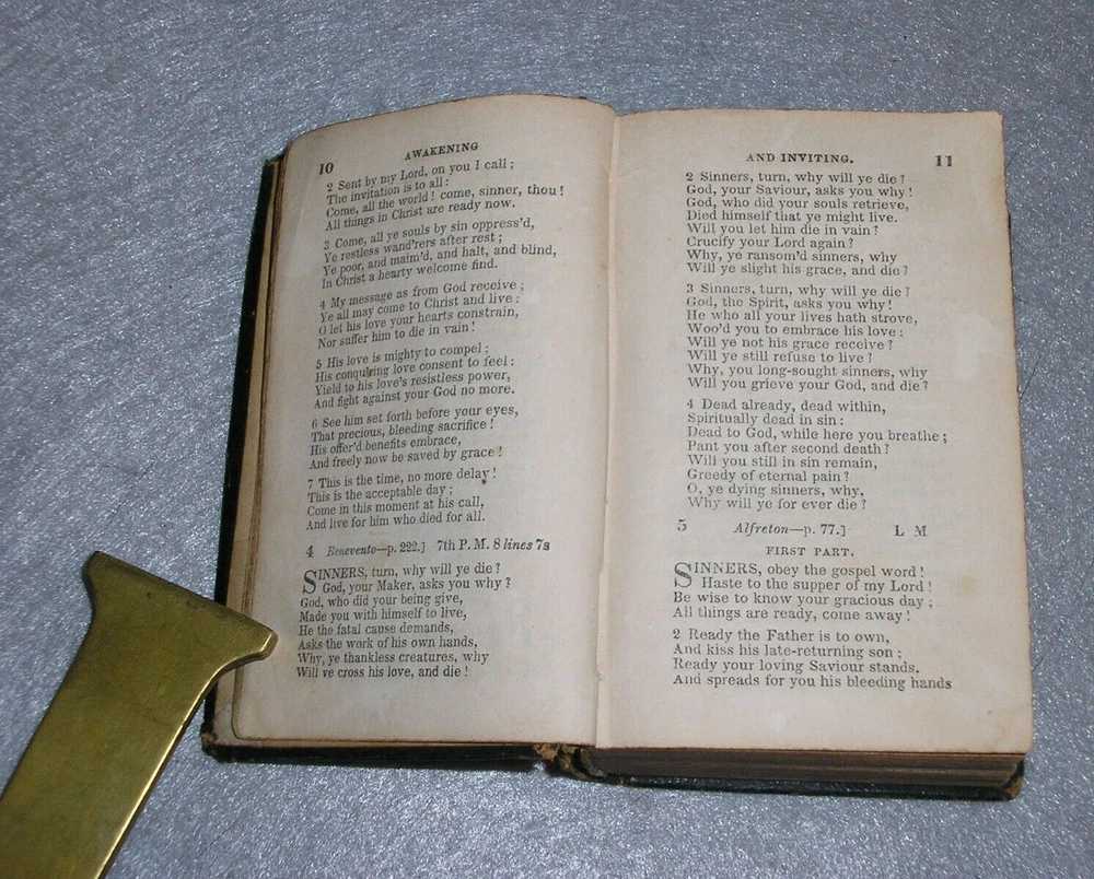 A Collection Of Hymns For the Use of The Methodist Episcopal Church, Principally from the Collection of The Rev. John Wesley Revised and Corrected. With a Supplement. New York: Published by G. Lane & C.B. Tippett, Joseph Longking, Printer. 1847. Antique, nearly two centuries old Methodist miniature or pocket edition hymnal bound in full decoratively worked leather in overall very good condition. Edges of the covers and spine show some rubbing to the leather, exterior is clean. Interior of the book shows some pencil notations as well as some scattered soiling, foxing and toning as well as a minor tatter or dog ear fold. Interior is very well intact with all text remaining legible. Binding is well intact and the book is complete with all pages present and none coming loose, detached or missing. Book totals 624 pages, measures approximately 4 x 2 1/2 x 1 1/8 inches and weighs about 1/4 of a pound.