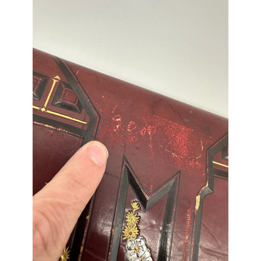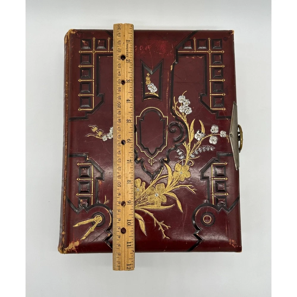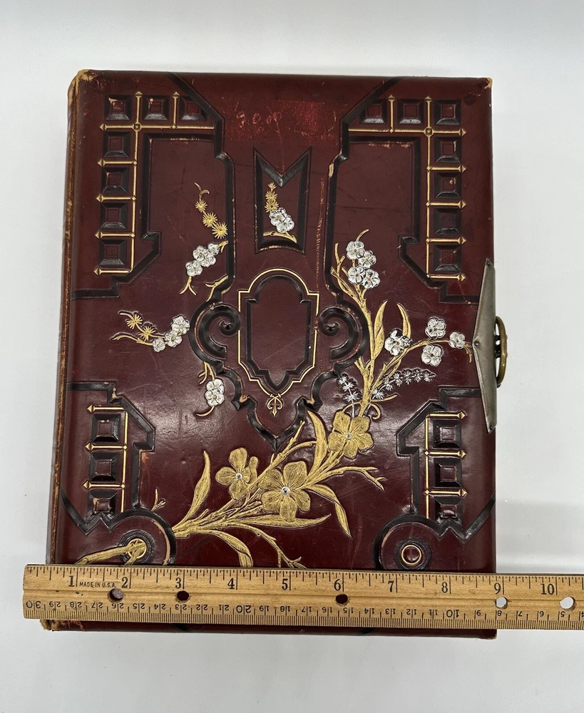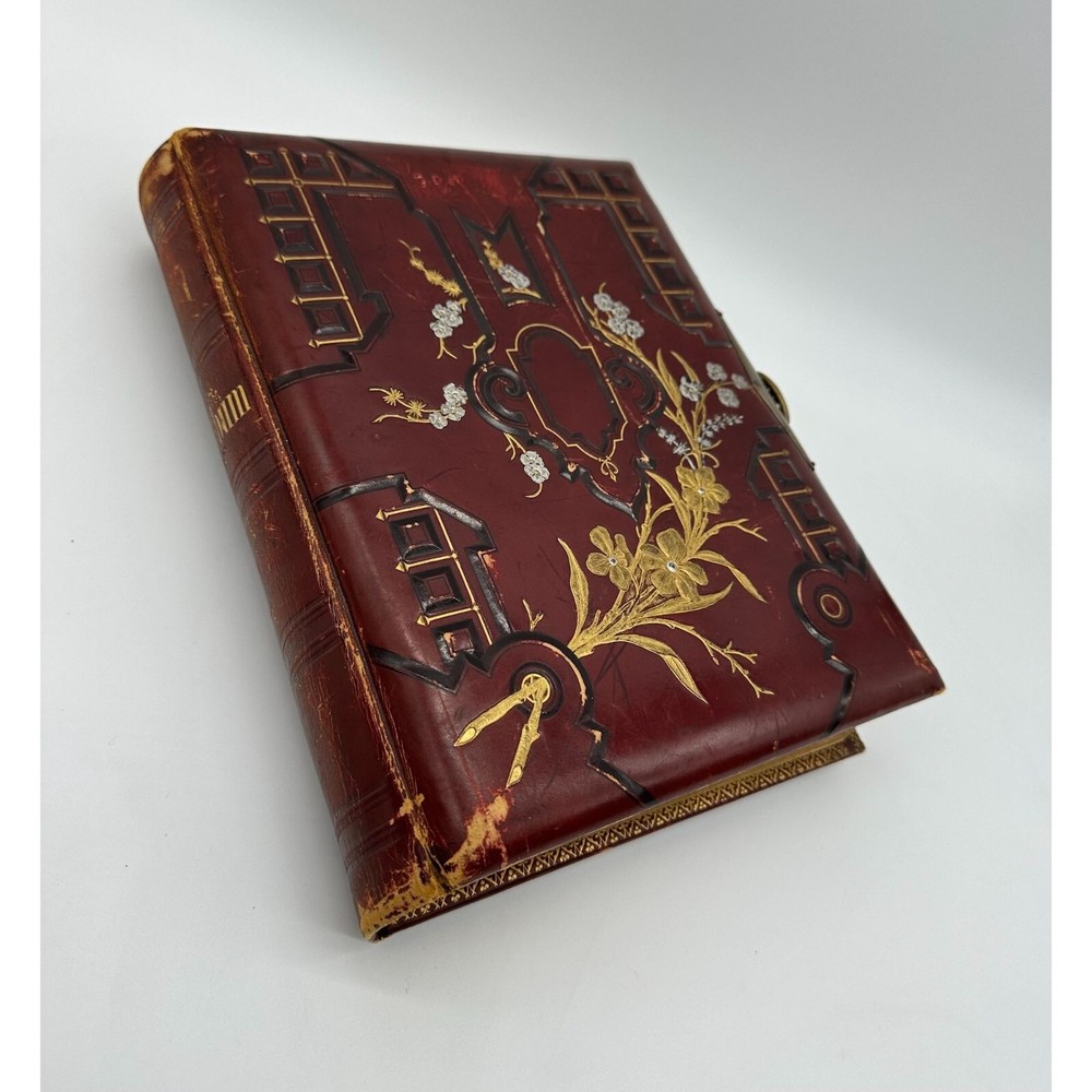 Antique Photo Album Tooled Leather Floral Gold Maroon Some Photos. This is a beautiful tooled leather bound photo album. It has the metal closure mechanism that does work. It is maroon with a floral motif and gold accents. It contains a total of 34 pages and there are 18 photographs on the inside. There is wear to the outside. There are some rips and tears, as well as a minor staining on the inside. Please see the pictures for the full description.