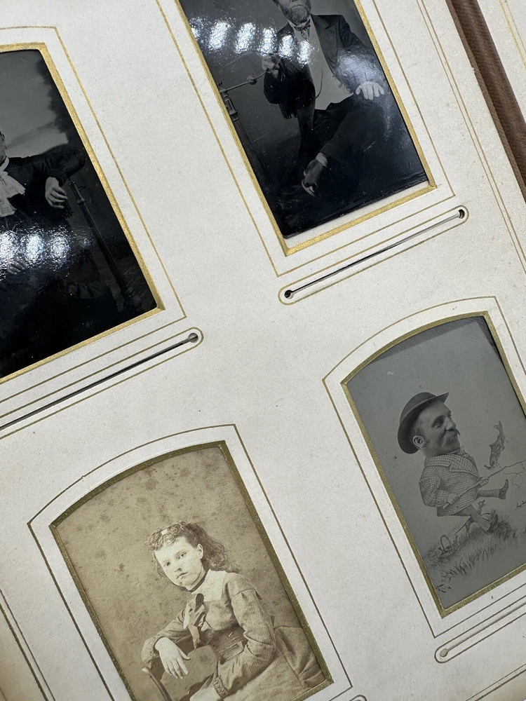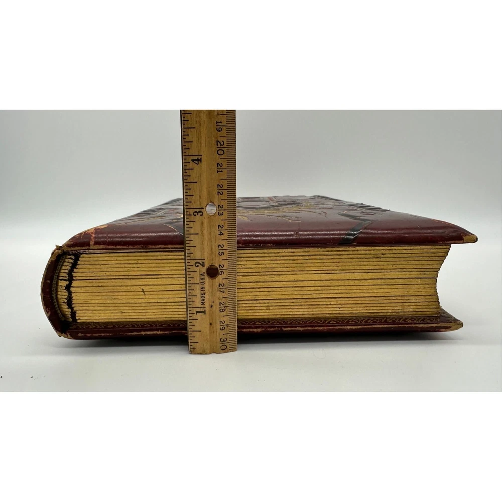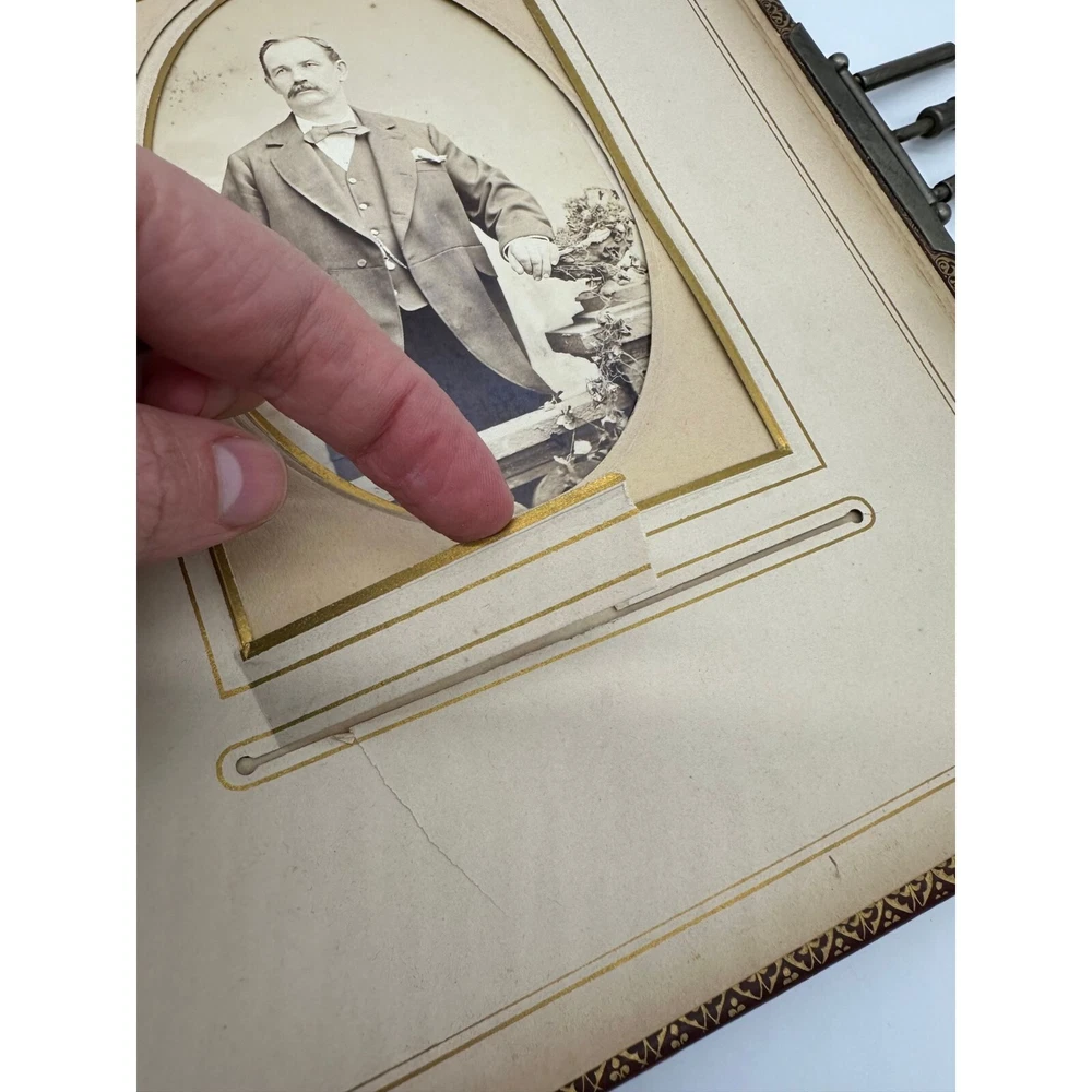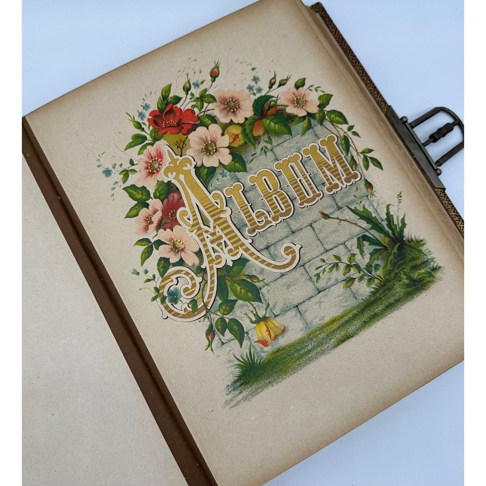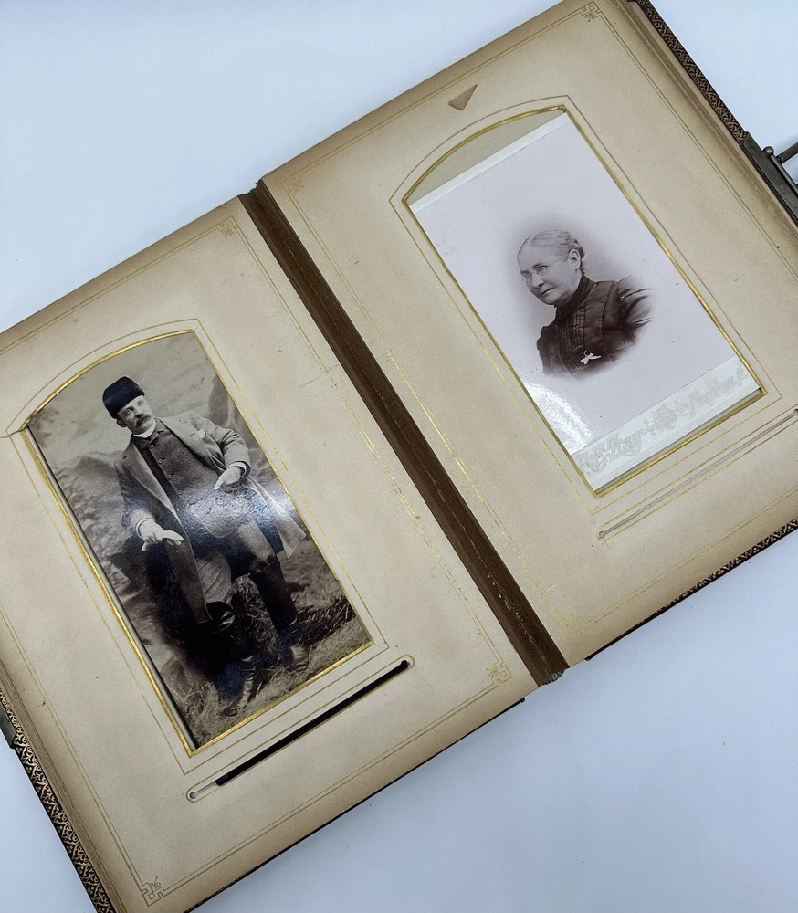 Antique Photo Album Tooled Leather Floral Gold Maroon Some Photos. This is a beautiful tooled leather bound photo album. It has the metal closure mechanism that does work. It is maroon with a floral motif and gold accents. It contains a total of 34 pages and there are 18 photographs on the inside. There is wear to the outside. There are some rips and tears, as well as a minor staining on the inside. Please see the pictures for the full description.