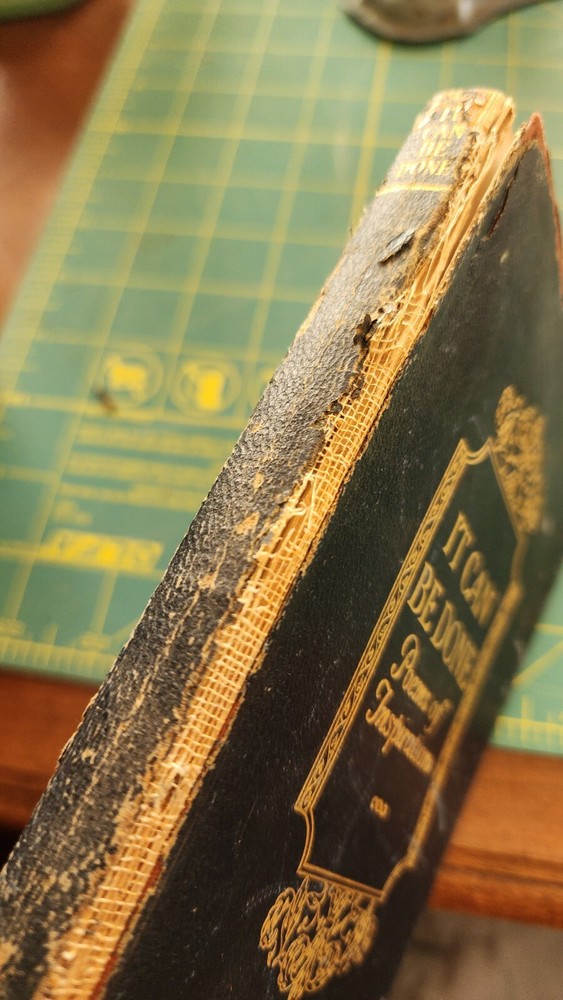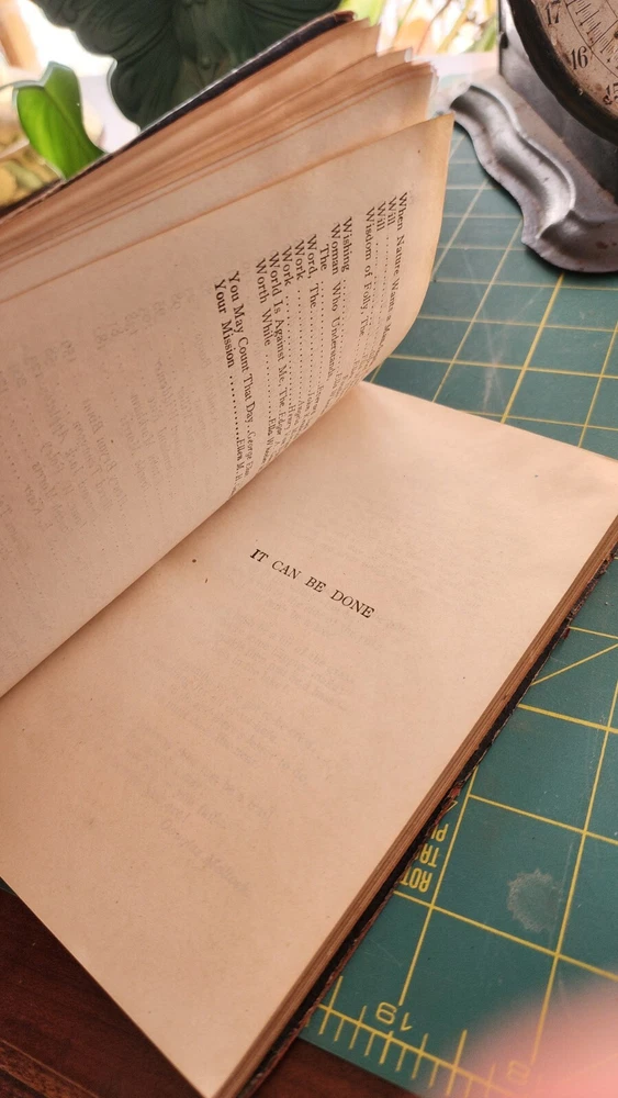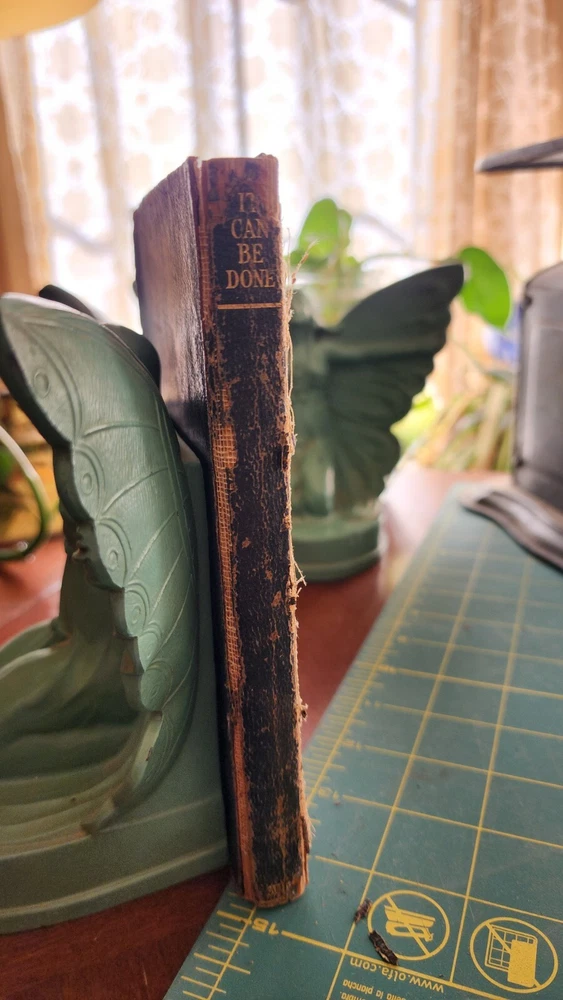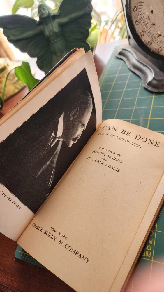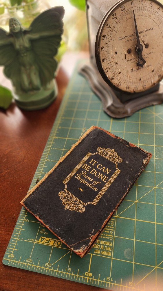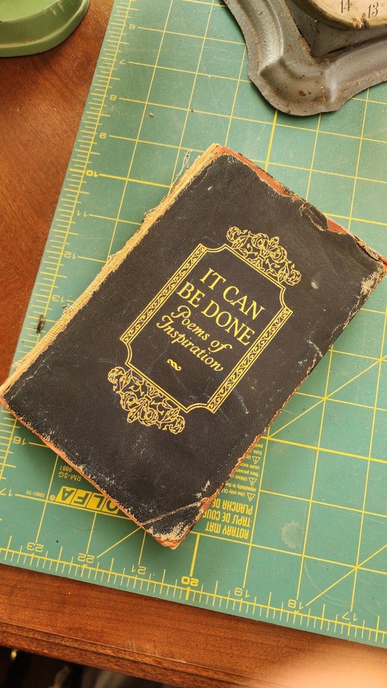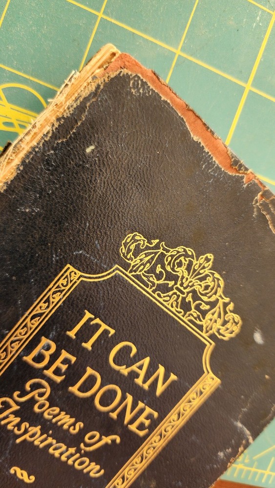Antique Poetry book, It Can Be Done, Poems of Inspiration, First Edition Leather -- A very tattered, first edition copy of collected poetry by Morris & Adams from various poets, printed in 1923 by Sully. Gold gilt luster shines on the front, leather cover motif of the cursive script title and the spine. Binding split at cover and netting exposed with loose, torn, gilted tipped leaves. Photographs of the poets and original tissues within (see pictures please). Free from strong odors. Ex-libres. 7" x 4" x 3/4" Ships wrapped in tissue, tied with string, and handmade, reusable tags then packed snugly in repurposed materials 'Waste not, want not' More nostalgic relics available in the Recent Era Antique Vintage Boutique