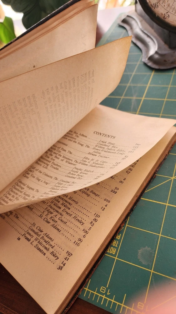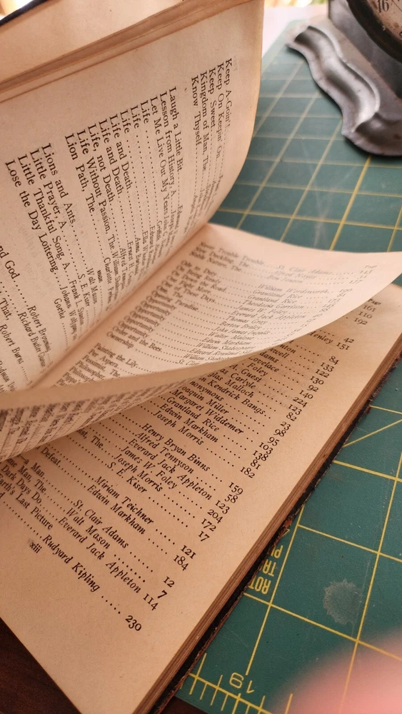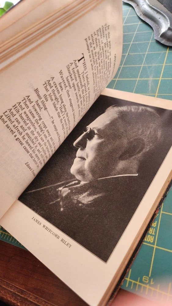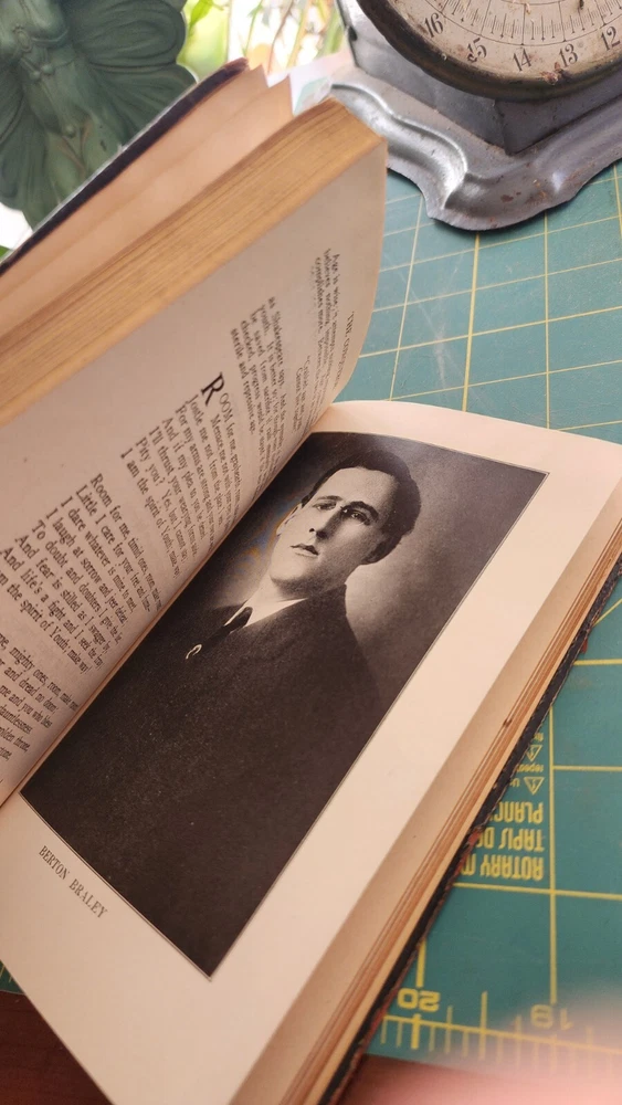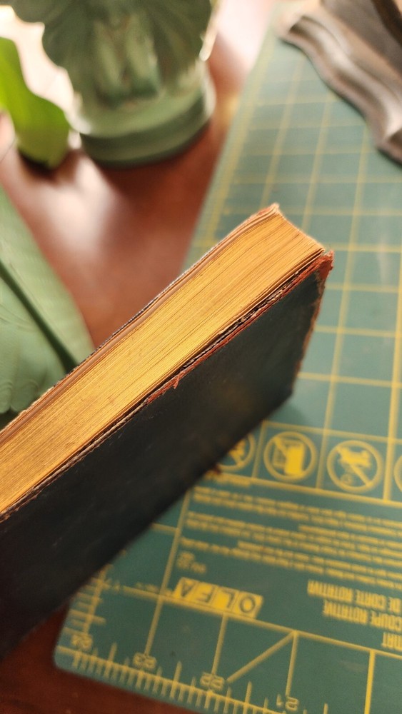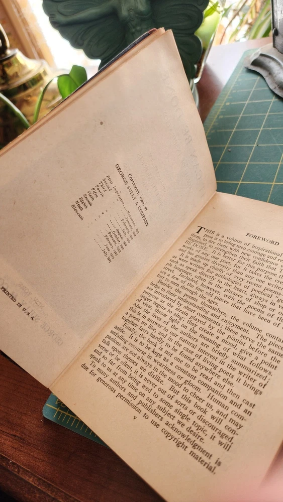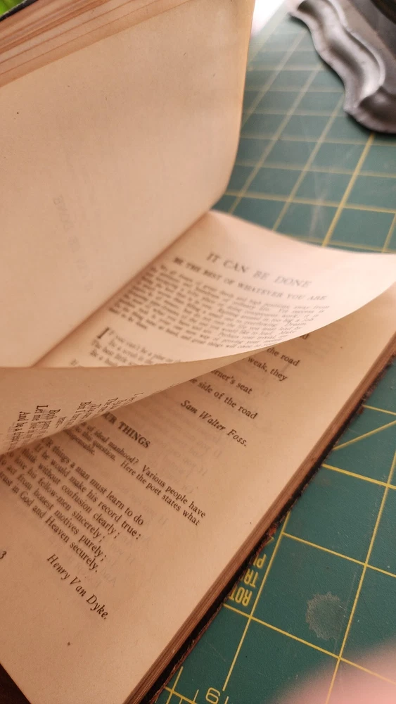 Antique Poetry book, It Can Be Done, Poems of Inspiration, First Edition Leather -- A very tattered, first edition copy of collected poetry by Morris & Adams from various poets, printed in 1923 by Sully. Gold gilt luster shines on the front, leather cover motif of the cursive script title and the spine. Binding split at cover and netting exposed with loose, torn, gilted tipped leaves. Photographs of the poets and original tissues within (see pictures please). Free from strong odors. Ex-libres. 7" x 4" x 3/4" Ships wrapped in tissue, tied with string, and handmade, reusable tags then packed snugly in repurposed materials 'Waste not, want not' More nostalgic relics available in the Recent Era Antique Vintage Boutique