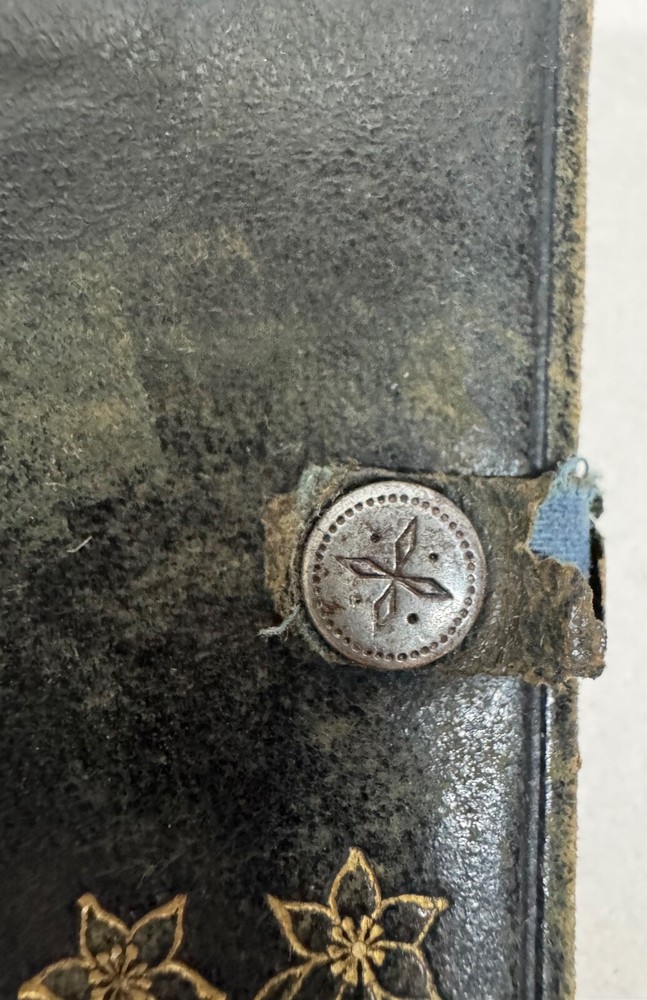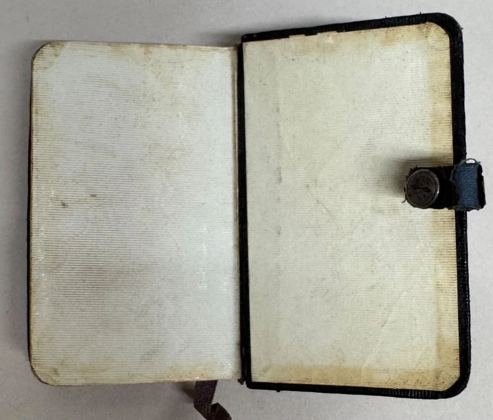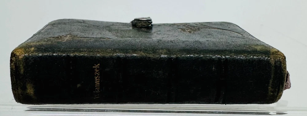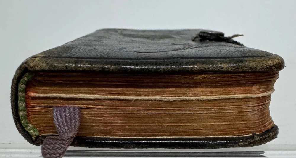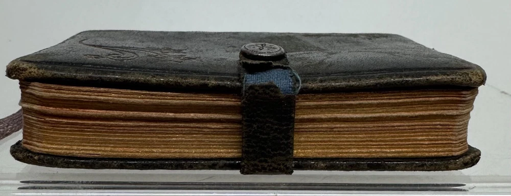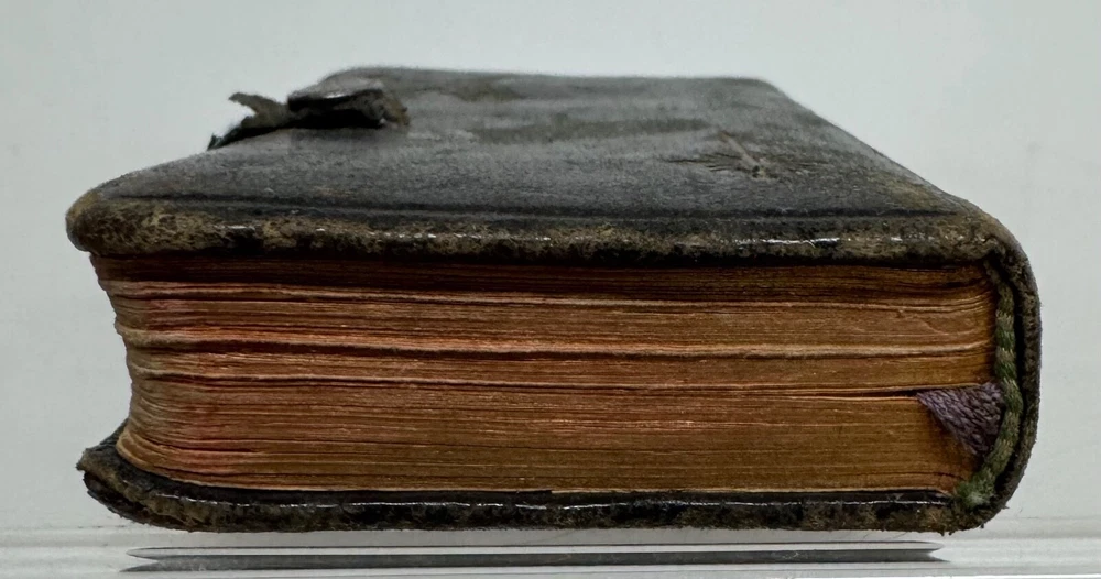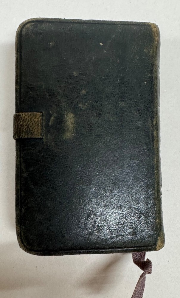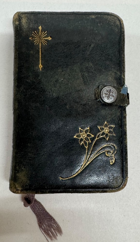 Some leather is worn off of the cover. There is some staining. There is writing on the inside cover page. The top piece of the crucifix is broken off. The binding is tight. No loose or missing pages. Approximately 3.5”x2.25”. Please see photos for condition. Thanks for looking!