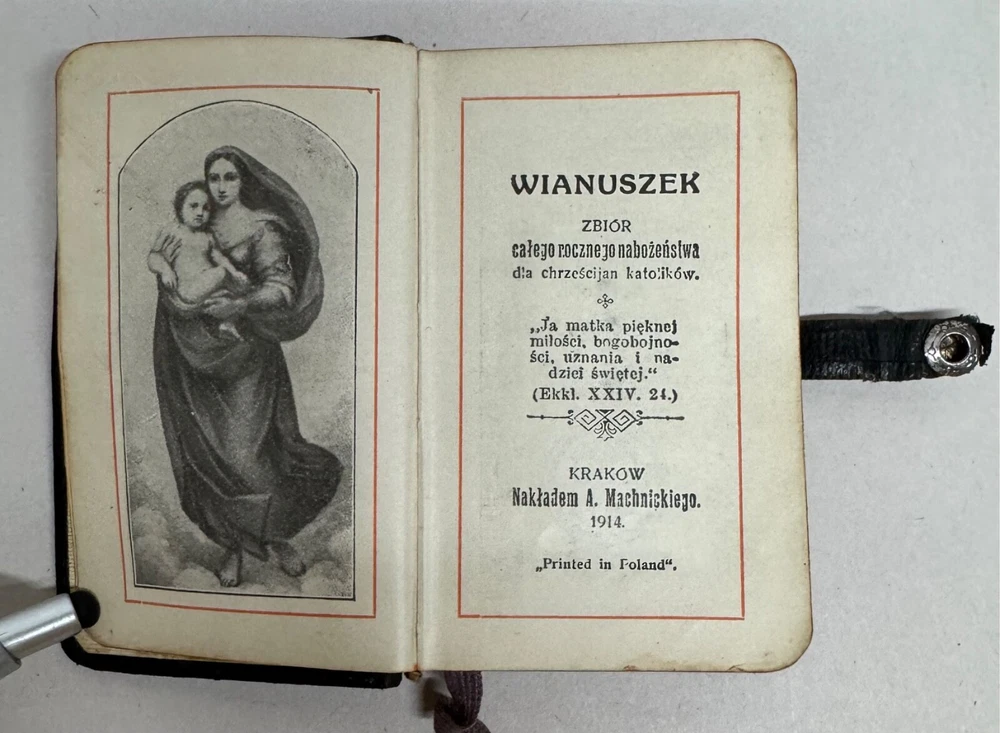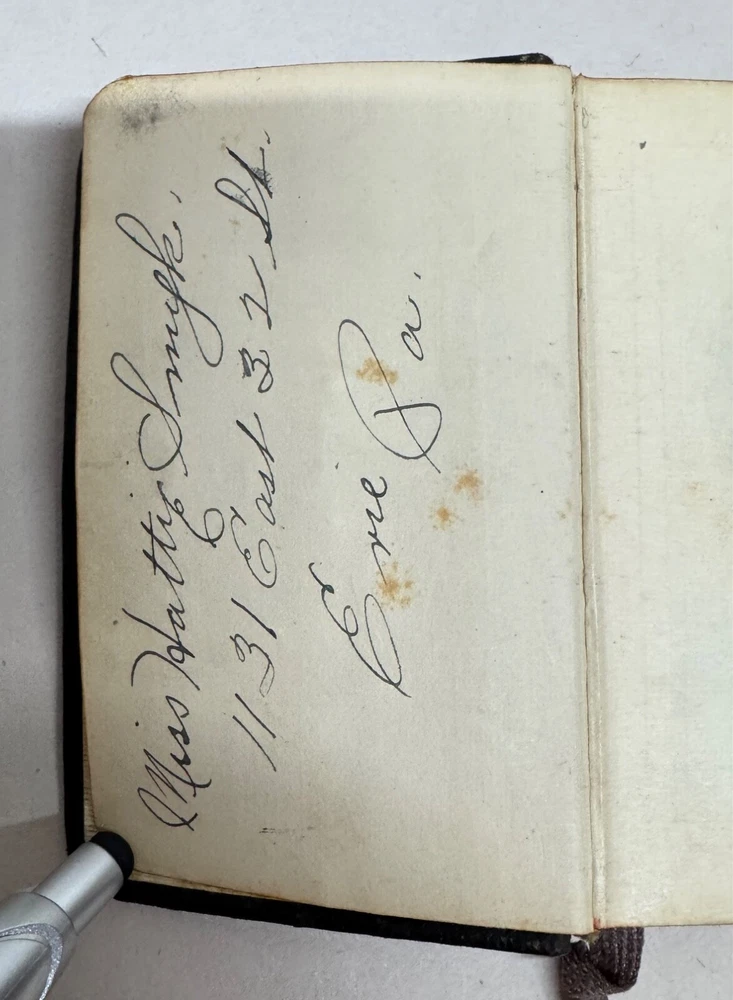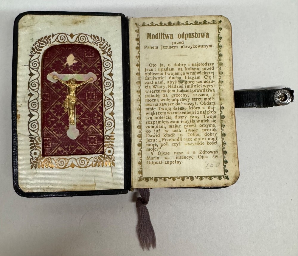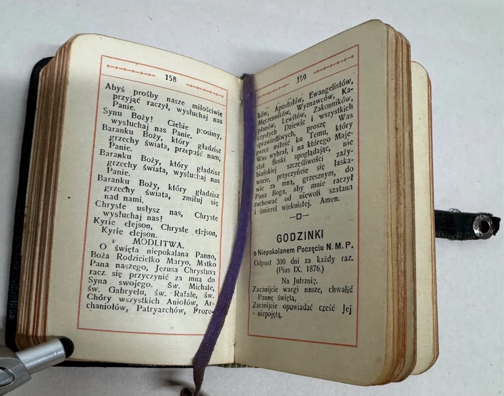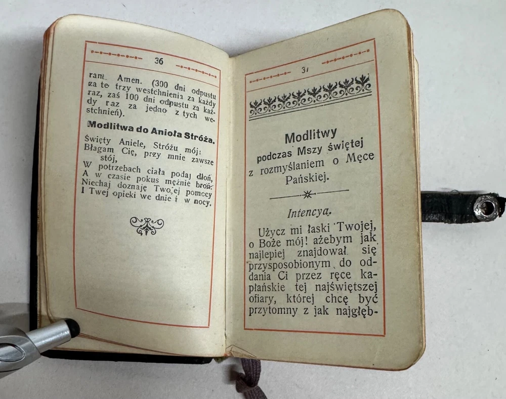 Some leather is worn off of the cover. There is some staining. There is writing on the inside cover page. The top piece of the crucifix is broken off. The binding is tight. No loose or missing pages. Approximately 3.5”x2.25”. Please see photos for condition. Thanks for looking!