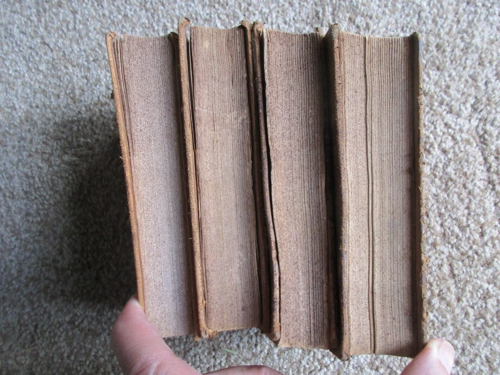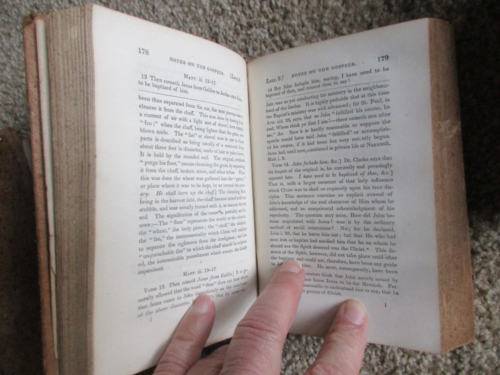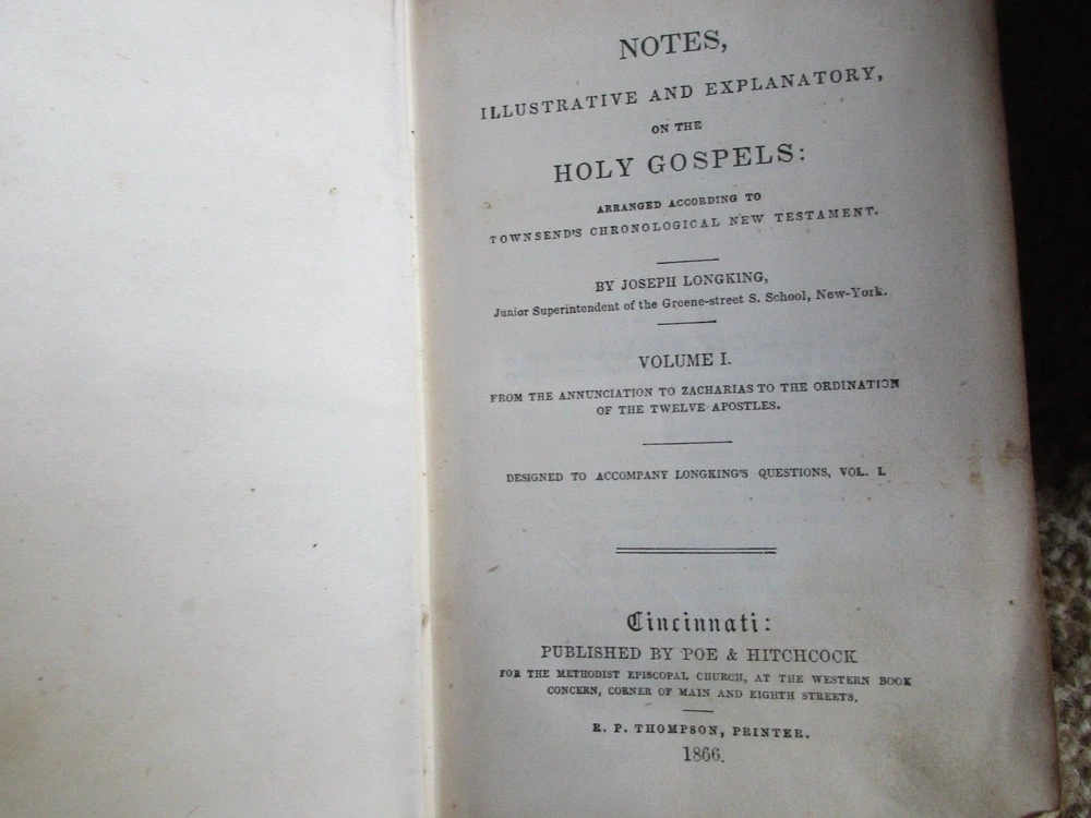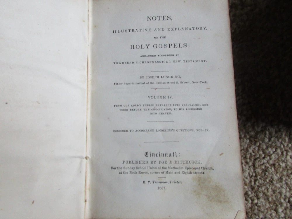 Antique Four Volume Set of LONGKING'S NOTES, ILLUSTRATIVE AND EXPLANATORY, ON THE HOLY GOSPELS by Joseph Longking, Range in date from 1861 to 1867 Published by Poe & Hitchcock, Cincinnati, OH USA Covers have wear. Bindings are intact but are failing. Text pages are good. Some yellowing of paper. A rare find! Four intact volumes! Estate item...needs a new caring home! BX-BK-5