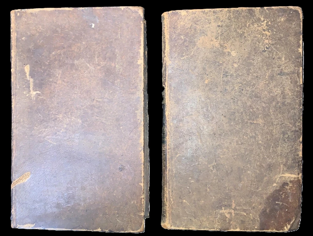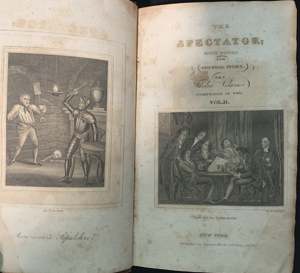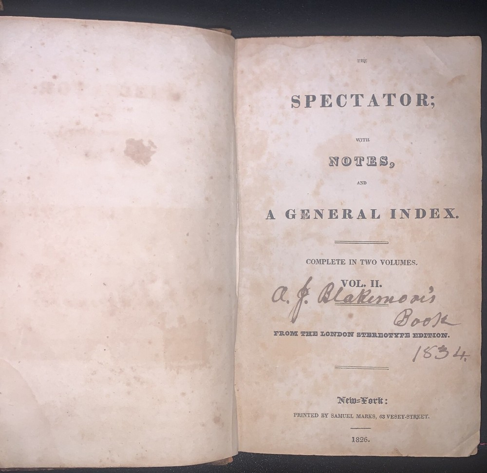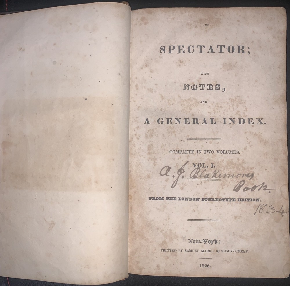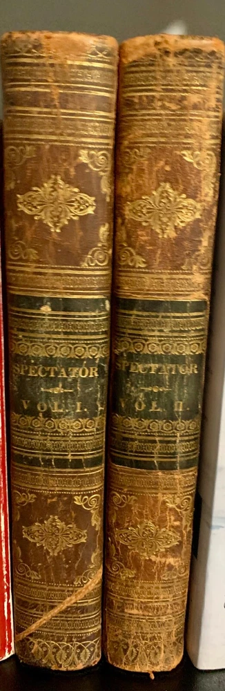 Rare two-volume set of "Spectator; with Notes, and A General Index," published in 1826 by Samuel Marks in New York. This set is a reprint of the famous periodical essays by Joseph Addison and Richard Steele, originally published in the early 18th century. These essays were influential in shaping public opinion and literary taste during the Enlightenment era, covering topics such as literature, morality, and society. There are handwritten inscriptions from 1834 in the front inside cover, adding a touch of history to these volumes. Details: Year: 1826 Publisher: Samuel Marks, New York Format: Two volumes, leatherbound with decorative gold gilded spines Condition: The books show signs of age and wear, as expected for their age. The leather bindings have some cracks and fading, and there is peeling on the spines. However, the bindings are still tight, and the books are structurally intact. The pages have yellowing and some staining, but the text is clear and legible throughout. This is an antique set, and it shows signs of wear consistent with its age. While it is not in perfect condition, it is still a complete and readable set with historical significance. Together, the books weigh roughly 2.5 pounds and measure about 8.9 x 5.5 x 2.75 inches. Please reach out if you'd like to view more photos or have any questions.