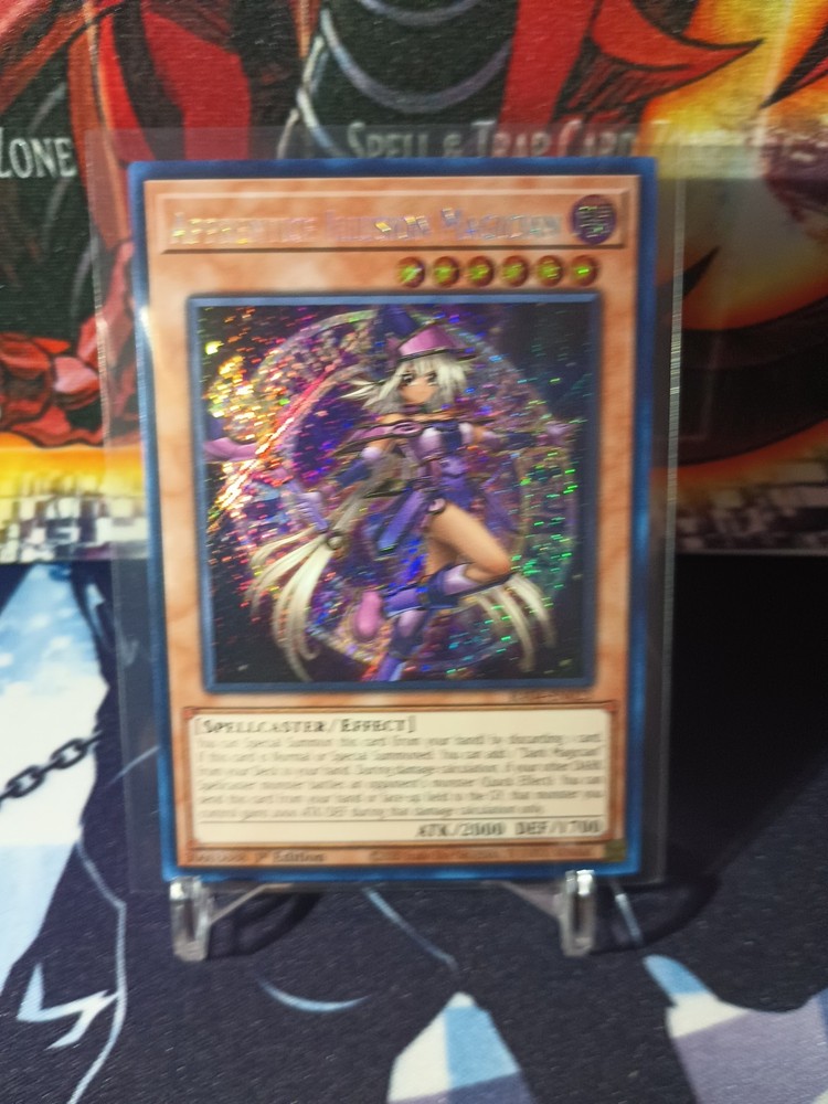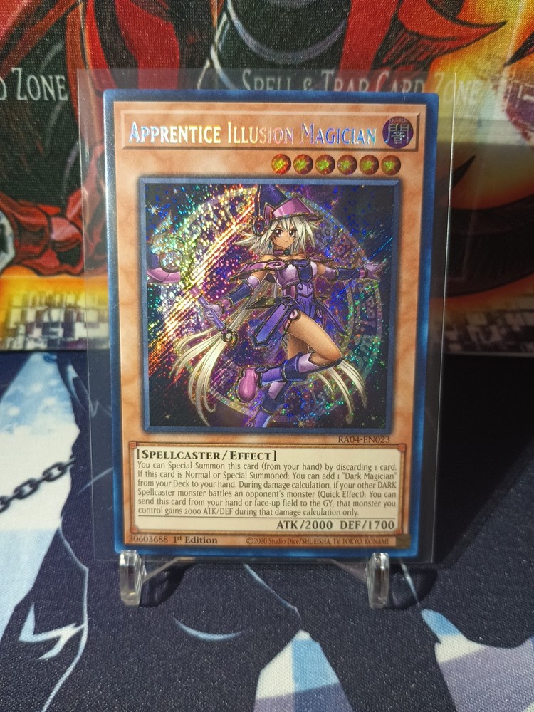 Delve into the mystical world of Yu-Gi-Oh! TCG with the Apprentice Illusion Magician card, a must-have for any spellcaster enthusiast. Boasting the title of Secret Rare, this card is a standout piece from the Quarter Century Stampede set, featuring the iconic duo Yami Yugi and Yugi Muto. The card, numbered RA04-EN023, is a 1st Edition effect card that adds a touch of darkness to your deck with its Dark attribute. The Apprentice Illusion Magician card is crafted with high-quality card stock and features a captivating Holo finish that enhances its appearance. With an attack power of 2000 and a defense toughness of 1700, this Spellcaster type card is not only a collector's gem but also a formidable contender in gameplay. Suitable for ages 6 and up and printed in English, it's a versatile addition to any Yu-Gi-Oh! collection.