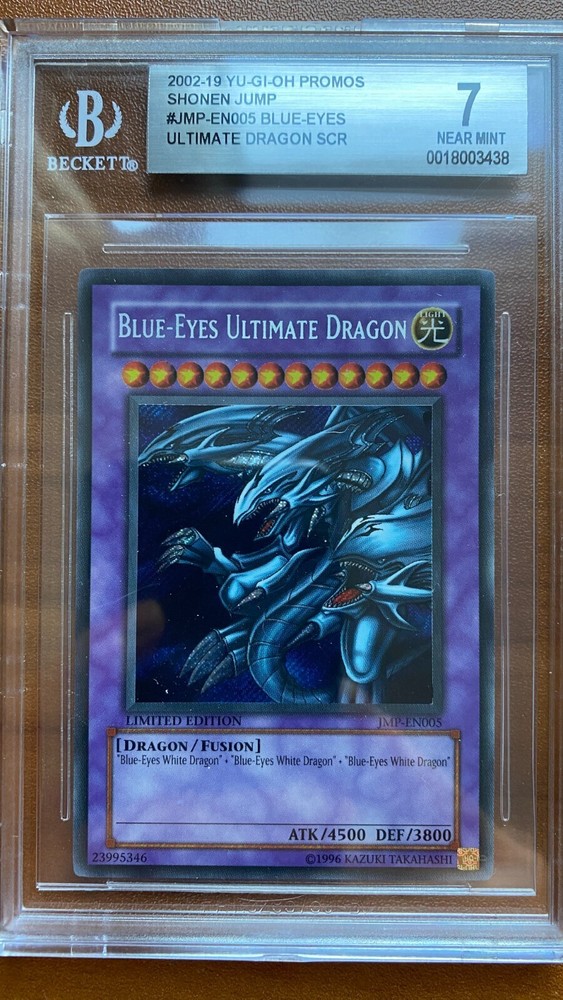 Elevate your Yu-Gi-Oh! TCG collection with the iconic Blue-Eyes Ultimate Dragon (JMP-EN005), a treasure from the Shonen Jump Magazine set. This card boasts the prestige of being a 1st Edition Secret Rare, featuring the formidable Blue-Eyes White Dragon in all its glory. The holographic finish captures the essence of this Warrior, Spellcaster, and Dragon type monster, making it a visually stunning piece. Released in 2005 and designed for players and collectors aged 4 and up, this English-language card is crafted from quality card stock and manufactured in the United States. Its rarity and exclusive nature, combined with its representation of classic Yu-Gi-Oh! characters such as Dark Magician and Seto Kaiba, make it a must-have for enthusiasts seeking to own a piece of the game's rich history.