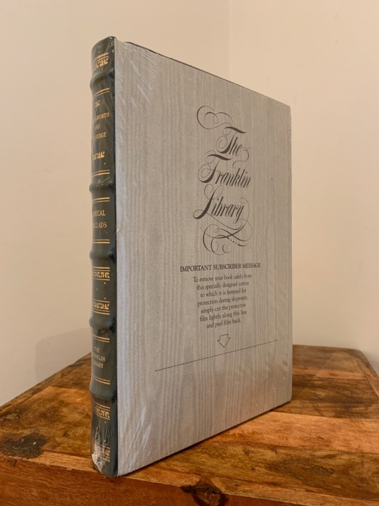 This is full genuine leather bound in new and sealed condition, never opened or read. The publisher’s notes booklet is inside the plastic wrap. The last photo is for exemplification only. This book is the perfect find, perhaps the last one to be found in plastic wrap. It laid in waiting for nearly 40 years to find its unique loving owner. 'Lyrical Ballads' by Wordsworth and Coleridge is one of Franklin Library's ‘100 Greatest Books of All Time’, with wonderful attributes: •Fully and tightly bound in genuine leather. •22kt gold accents deeply inlaid on the "hubbed" spine and covers. •Heavy duty binding boards enhance the book’s durability. •Superbly printed on acid-neutral paper that lasts for generations. •Sewn pages – not just glued like ordinary books. •Handsome moiré end pages and a satin-ribbon page marker. •Gold gilded page ends. •Rigorous inspection at every stage ensured adherence to exacting standards and the highest quality. •Superb craftsmanship and commitment to quality. The appeal for collecting Franklin Library comes from having these attributes taken way further into the exquisite quality, durability and craftmanship, than Easton Press and Folio Society managed with their productions. This book is the perfect companion out on a park bench with a hot cup of coffee or snuggled up in front of the fireplace. Despite its all-inclusive nature it still feels very light and compact at a size of 3.5 x 16 x 24cm. Wonderful to hold and excellent reading experience.