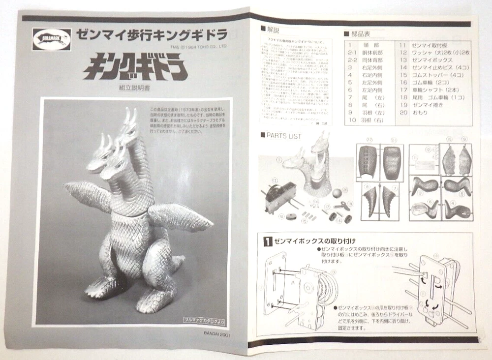 Bandai Bullmark monster King Ghidorah Wind up Model kit from Japan Rare Vintage Description ■ Product specifications BRAND : BANDAI , Bullmark CONDITION : NEW Actual: Made of Plastic . King Ghidorah Wind Up Model Bullmark Reissue Includes T-Shirt Box opened but model not assembled All plastic pieces still in plastic Parts are unopened GREAT CONDITION (See Photos) I got one that was in pretty good condition. Please check the photos for the condition of the product. It's a Model kit. If you like it, we recommend that you take this opportunity to collect it. Since I have inventory, handling time is same day or 1 business day. Regarding delivery time, we use FedEX, so delivery time is approximately 3 days. If you want to get the product right away, we recommend that you use my shop. Payment Payments managed by ebay. Shipping Free shipping! We will ship your item on the same day or within 1 business days, after your payment. Terms of Sale Returns are accepted 60 days. saler pays for return shipping. International Buyers - Please Note: Import duties, taxes, and charges are not included in the item price or shipping cost. These charges are the buyer's responsibility. Please check with your country's customs office to determine what these additional costs will be prior to bidding or buying. * These charges are normally collected by the delivering freight (shipping) company or when you pick the item up - do not confuse them for additional shipping charges. * We do not mark merchandise values below value or mark items as "gifts" - US and International government regulations prohibit such behavior.