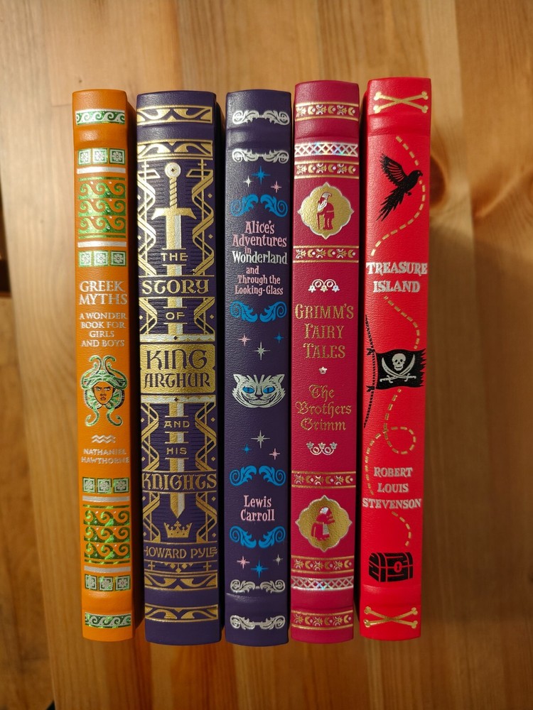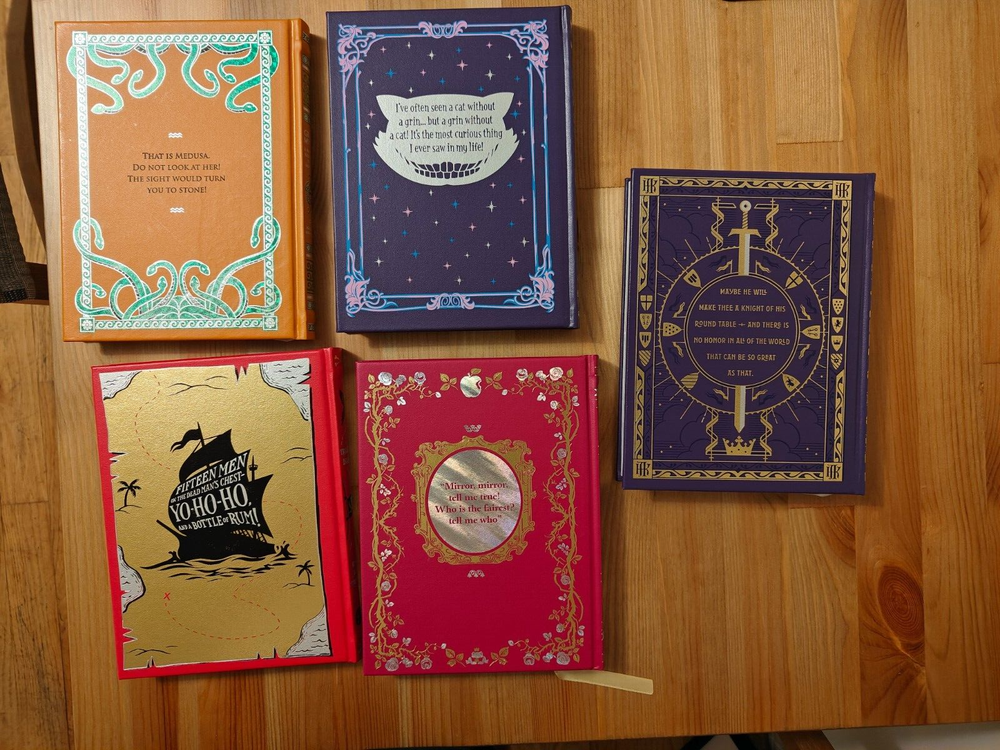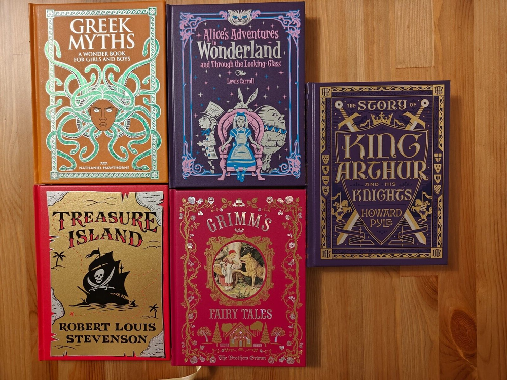 Barnes and Noble collectible edition box set of illustrated children's classics. Includes Treasure Island, Alice in Wonderland, King Arthur and His Knights, and Greek Myths. Missing Peter Pan. Most unread and as new. King Arthur read once and has some rubbing to silver page edges. Otherwise no flaws.