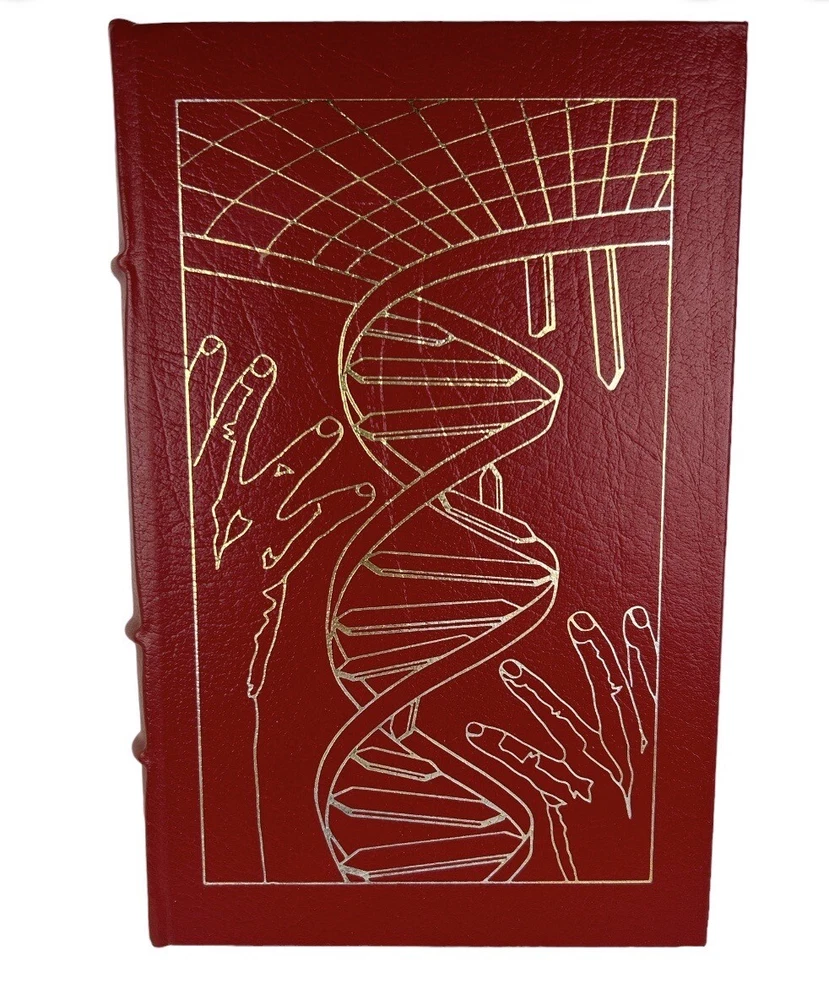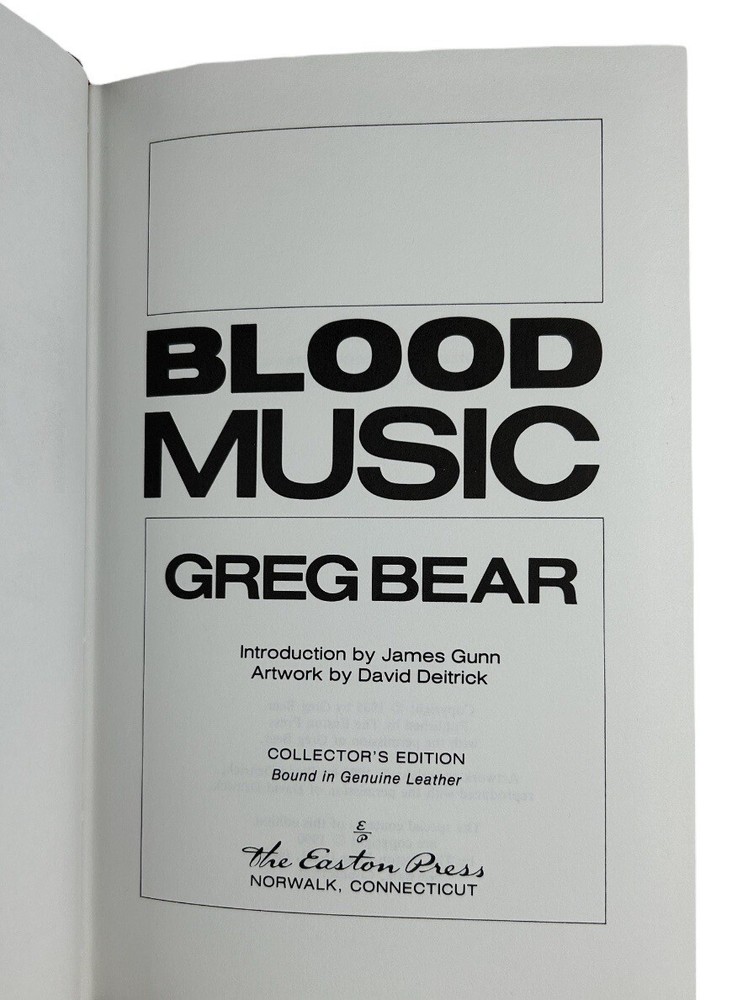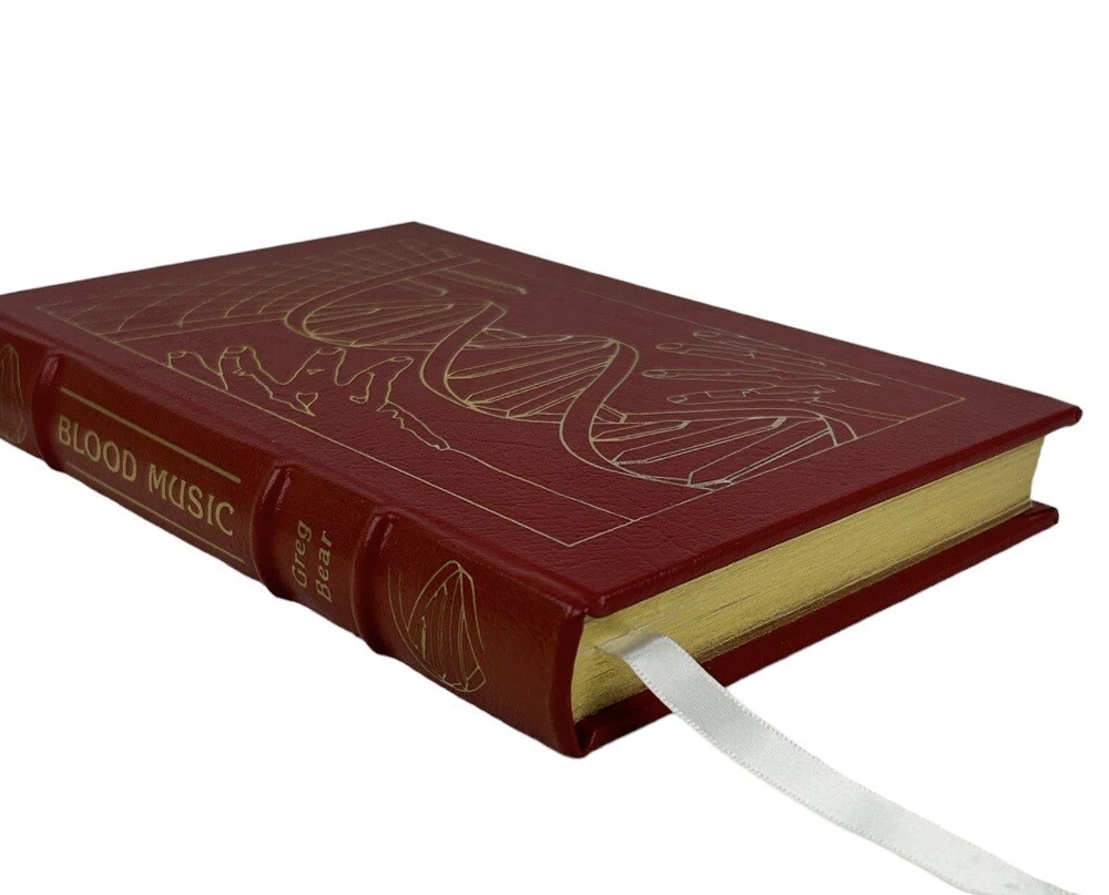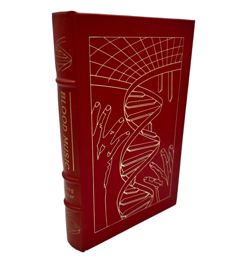 Very good condition. Complete pages and red leather bound cover, secure binding, gold accents (some fading on cover), gilt edges, hubbed spine, fabric end sheets, attached silk ribbon. does not include Collector's Notes. ** See photo details Blood Music by Greg Bear Introduction by James Gunn Artwork by Dave Deitrick The Easton Press, c1990 Collector's Edition Master's of Science Fiction Approx: 8.75" x 5.75" x 1" 262 pages Vergil Ulam , anthropic principle