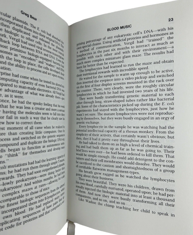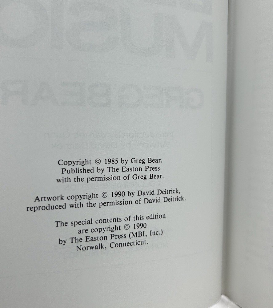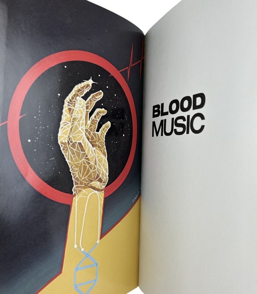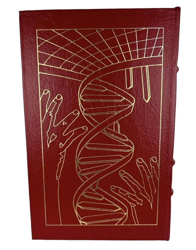 Very good condition. Complete pages and red leather bound cover, secure binding, gold accents (some fading on cover), gilt edges, hubbed spine, fabric end sheets, attached silk ribbon. does not include Collector's Notes. ** See photo details Blood Music by Greg Bear Introduction by James Gunn Artwork by Dave Deitrick The Easton Press, c1990 Collector's Edition Master's of Science Fiction Approx: 8.75" x 5.75" x 1" 262 pages Vergil Ulam , anthropic principle