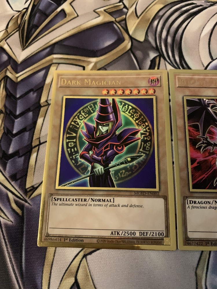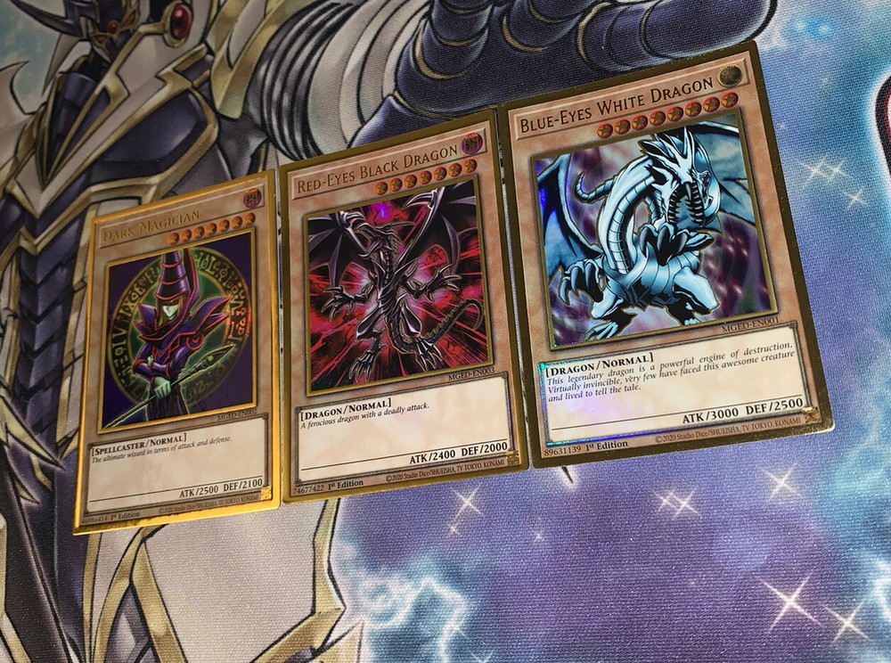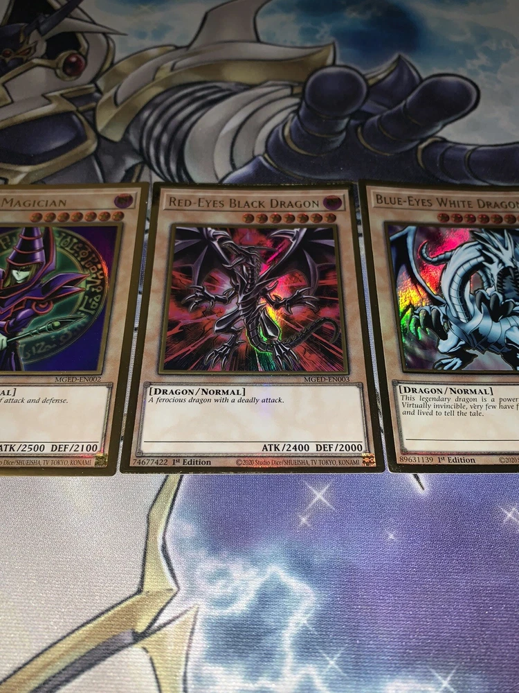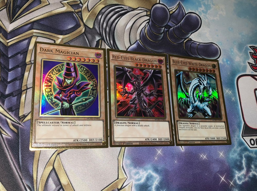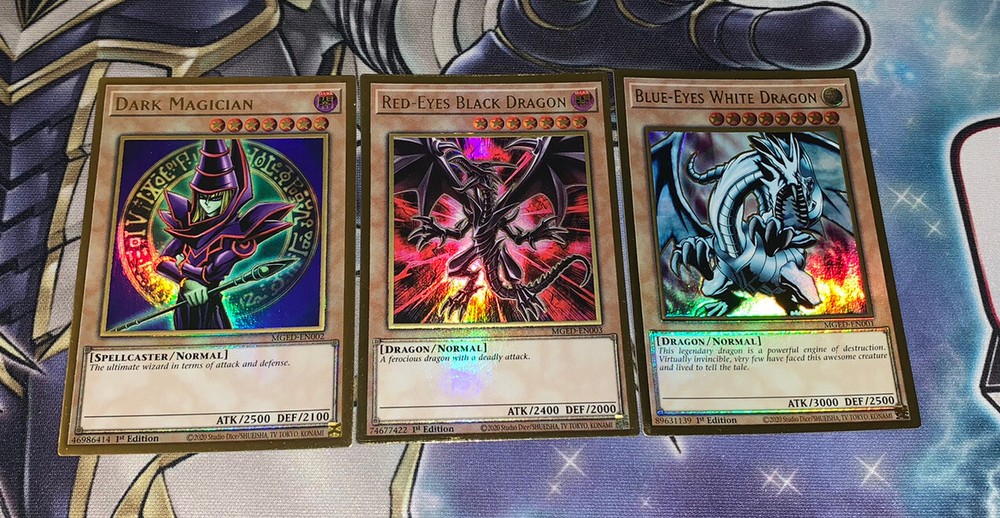 Blue Eyes White Dragon Red-Eyes Black Dragon Dark Magician NM Yugioh Mged Gold. Blue Eyes White Dragon + Red-Eyes Black Dragon + Dark Magician NM Yugioh Mged. Shipped within bubblemailer mailer and top loader for protection! Best deal on eBay! Perfect for any collection! Look amazing! Please message us with any questions you might have we are happy to help :) happy buying!