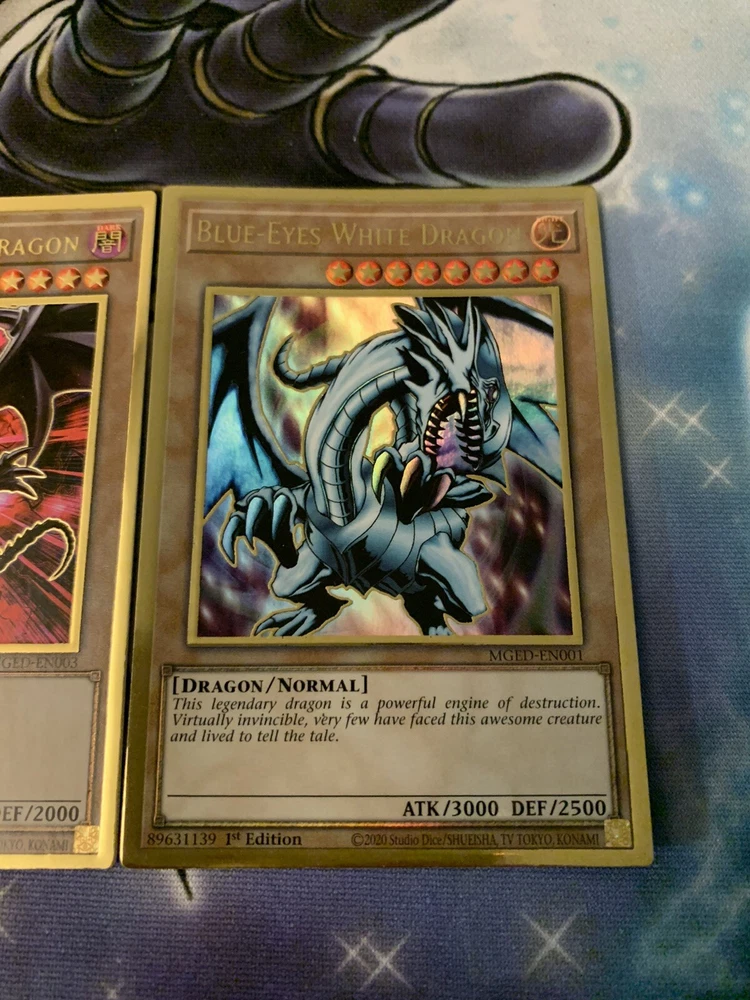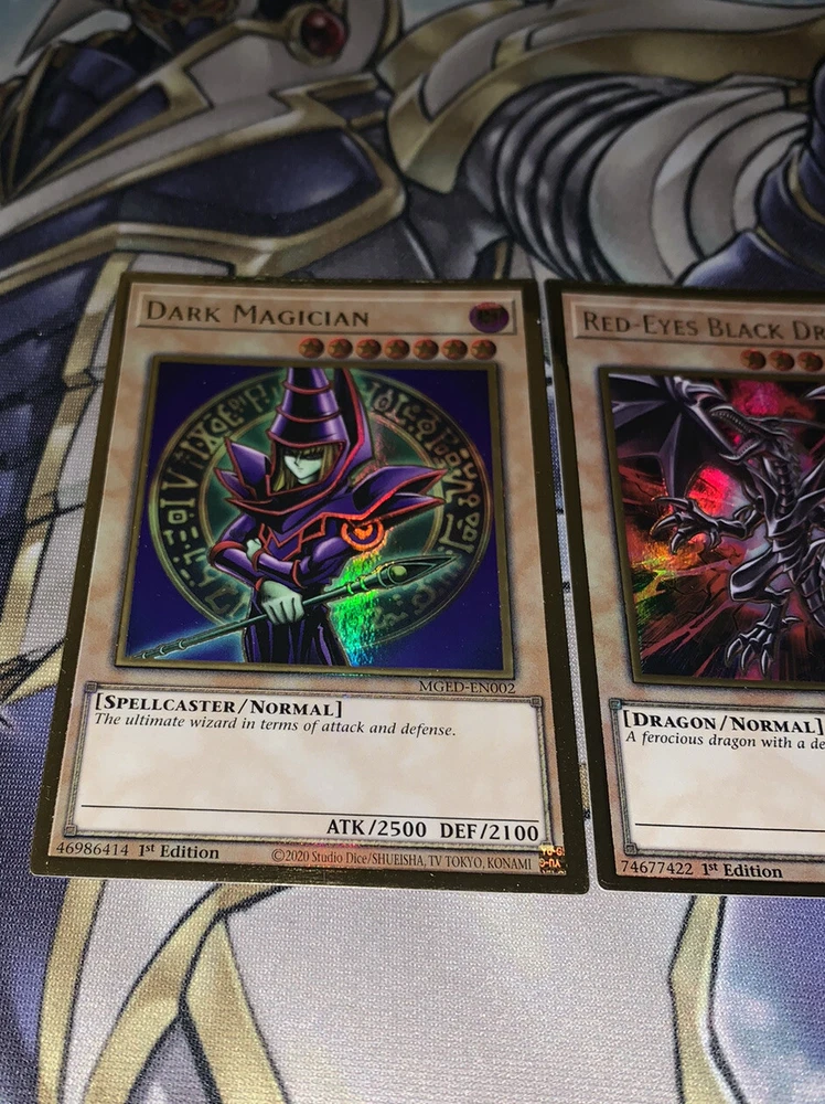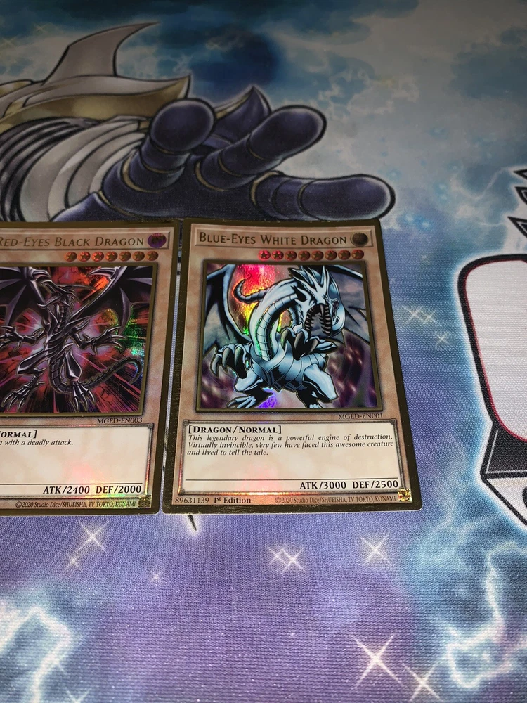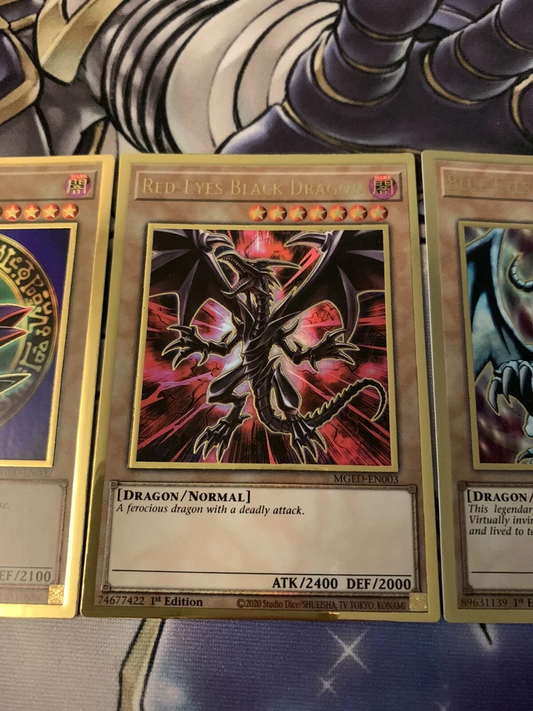 Blue Eyes White Dragon Red-Eyes Black Dragon Dark Magician NM Yugioh Mged Gold. Blue Eyes White Dragon + Red-Eyes Black Dragon + Dark Magician NM Yugioh Mged. Shipped within bubblemailer mailer and top loader for protection! Best deal on eBay! Perfect for any collection! Look amazing! Please message us with any questions you might have we are happy to help :) happy buying!