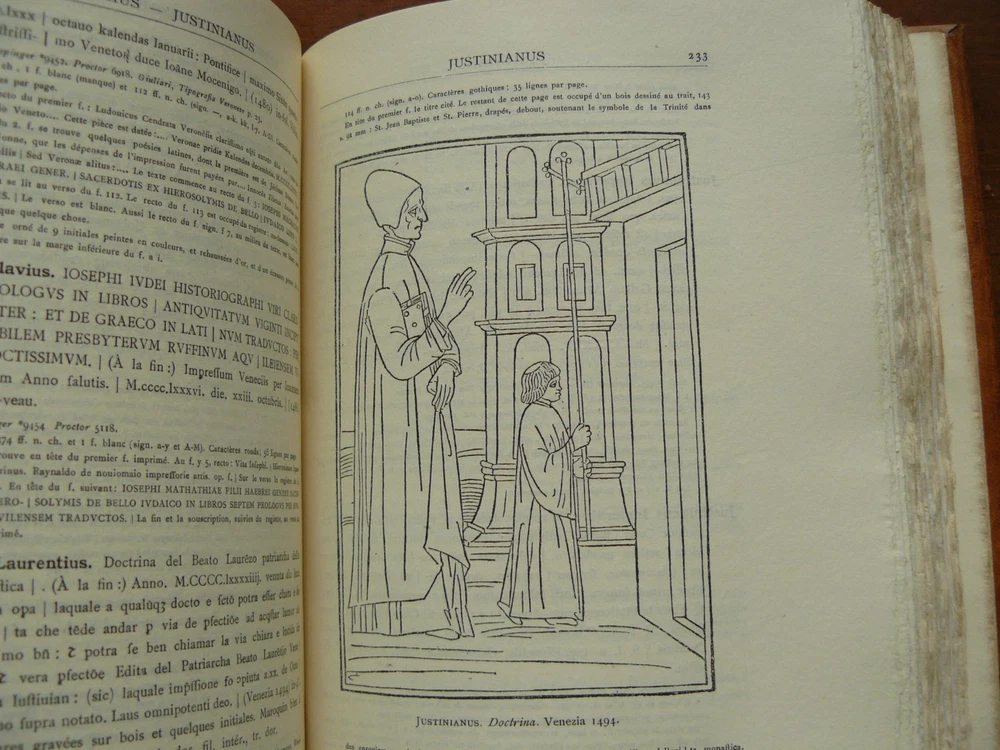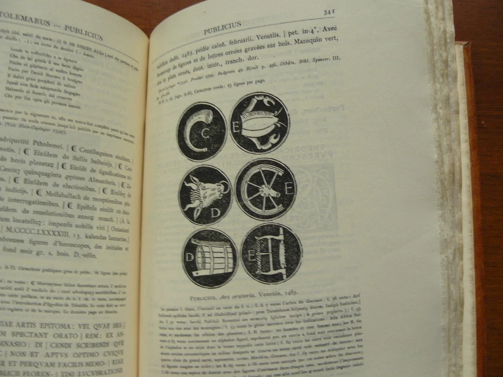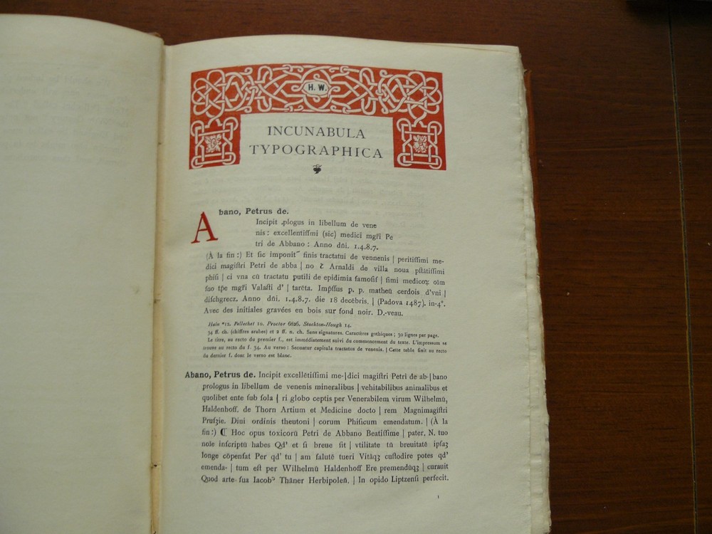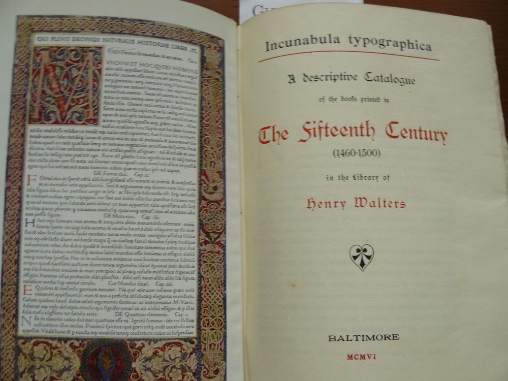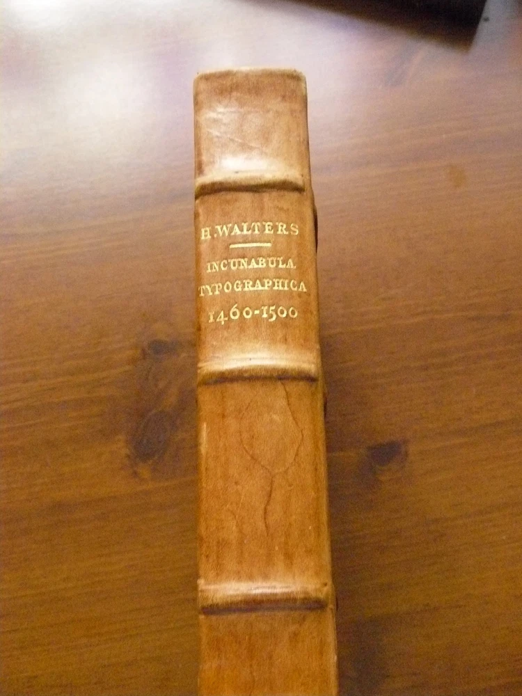 Here is a truly superb book about books, incunabula. It is an early 20th century catalogue of books in the Henry Walters collection in Baltimore. It is finely illustrated. The cover is hand tooled leather with raised bands on the spine. The cover features a "strap hinges" design as found on the wooden doors of Gothic cathedrals. I've owned this volume for 39 years and it still looks as new as when it was printed in 1906. Please see the photos. If you are an incunabula collector, or simply love books about books, then this genuine beauty belongs in your library. This offer is open only to US bidders.