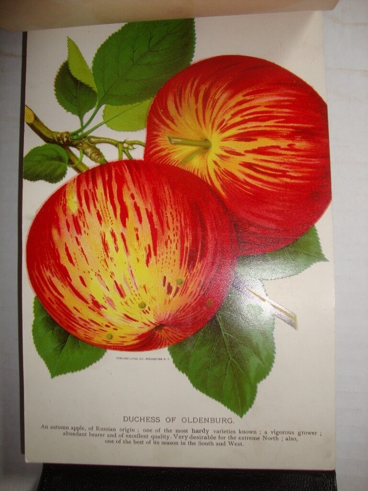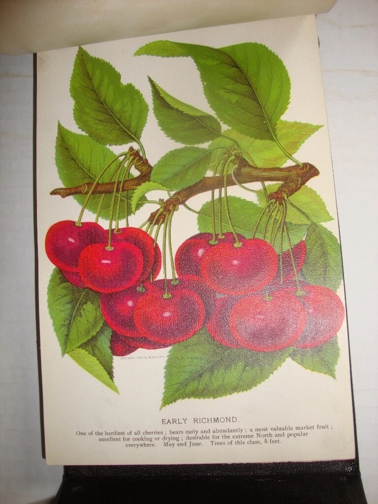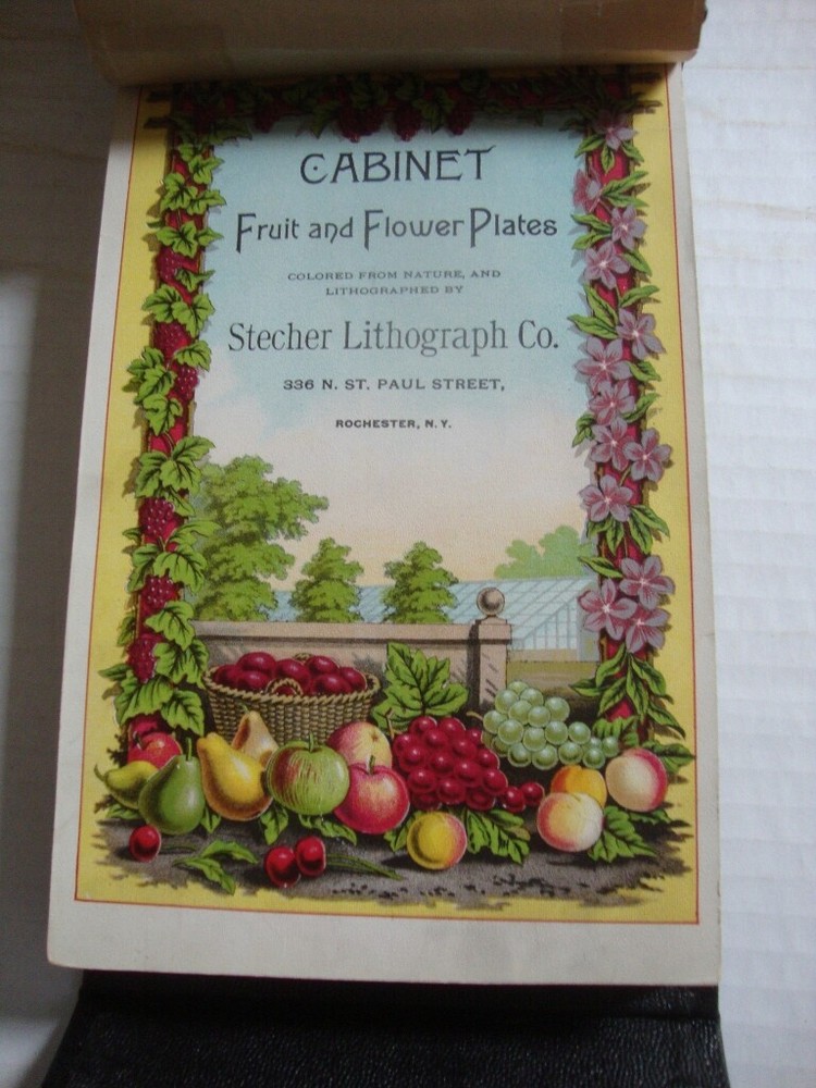 C I R Q L A R Original antique prints, books, maps and atlases Name Of Work Cabinet Fruit And Flower Plates Colored From Nature... Author/Artist Stecher Lithograph Co. Rochester NY . Date of Publication Published c. 1880. Type of Print Original color lithograph plates bound into a contemporary salesmans sample binding. There is a reference to S.N. Kidd Landscape Gardener, Butler PA on the front cover. Size of Image App. 6" X 9". Condition In overall very good to excellent condition. Newly/recently rebound with new marbleized end pages. The front end page has some old tape on verso and one plate is detached but fully present. Description We are pleased to offer this beautiful and complete bound volume of a salesmans sample of ca. 115 fruit and flower plates published by the Stecher Lithograph Co, Rochester NY. Please note that the 115 quantity could be off either way by one or two. In the latter half of the nineteenth century, Rochester, New York, was a leading American nursery center. Auxiliary to the nursery businesses, there developed allied enterprises, one of which was the production of colored fruit and flower prints designed to aid nurserymen and their travelling salesmen sell plants. This business in nurserymen's plates, as these prints were also termed, flourished until changes in marketing nursery products and the increasing use of colored illustrations in nursery catalogues caused its decline. By the early years of this century, the production and use of these plates was ending. A typical nurserymen's color plate was approximately 9 by 12 inches or the smaller "pocket size" of 6 by 9 inches, which was introduced in the early 1870's. Each pictured a specimen of fruit, flower, shrub, ornamental tree, or, occasionally, a hardy vegetable such as rhubarb. Under the illustration would be its name, perhaps a brief description of its attributes (as much for the benefit of the salesman as the potential customer), and the name (and often city) of the producer of the plate. These plates were generally printed on heavy paper stock to withstand wear. A nursery firm or salesman could purchase plates in a variety of ways: individually, as bound assortments, or as collections in portfolios. If he wished he could select an assortment illustrating the stock he was selling and have it bound. Often he would select plates produced by various firms. If he wished to change the assortment or replace worn or damaged plates, special bindings could be had that made such substitutions easy. The earlier plates were either hand-colored lithographs or a variation of the theorem technique of using stencils with details added freehand. All of these plates were bright and colorful; some had simplified designs which were almost abstract in quality. The first Rochester chromolithographic company began in 1871, and sometime thereafter local firms began to use this method to produce less expensive plates. For at least a part of the 1870's D. M. Dewey carried a small line of inexpensive wood engravings printed in colors by George Frauenberger. By the end of the century, plates were also created by the photomechanical reproduction of photographs. Fruit and flower plates were not inexpensive. In 1860, for example, Thomas Wright was charging 35¢ each for lots of 100. In 1872, Dewey's plates were 25¢ and 37½¢ each for the regular-size plate (9 by 11½ inches) which could be trimmed to smaller sizes, such as 6 by 8 inches. In the Rochester Lithographing and Printing Company's large 1888 catalogue (essentially D. M. Dewey's last catalogue), "hand-made" (stencilled) plates cost 18¢ in the large size (9 x 11 inches) and 8¢ in the pocket size (6 by 9 inches). Chromolithographic plates cost 5¢, and the company's few "photograph" plates ("a decided novelty in fruit plates") cost 12¢ each. They would create plates from a supplied specimen at $1 for the first copy and the "regular price for all after." Their "Cheap Plate Book" contained 40 plates and sold for $3.50, while their regular plate books contained 70 plates and sold for $7. Although fruit and flower plates were produced in other places, Rochester appears to have been a center for the business. D. M. Dewey laid claim to originating the concept in the late 1850's by adapting, as he later said, "the colored fruit plate to the practical use of nurserymen, in selling their stock." By the 1880's and into the 1890's, more than a half dozen firms were active in Rochester. Some, such as J. W. Thompson & Co., produced only one type of plate, while others such as the Rochester Lithographing Company produced plates using several of the techniques. The major nineteenth-century Rochester plate firms were D. M. Dewey, the Rochester Lithographing and Printing Company (with which Dewey merged in 1888), and the Stecher Lithographing Company. A second group of somewhat smaller firms was (in roughly chronological order) E. Darrow & Brother, D. W. Sargent, J. W. Thompson & Co., George Frauenberger, W. H. Medcalf & Co., C. M. Search & Co., Karle & Co., Charles F. Nicholson, M. Brunswick & Co., and Vredenburg & Co. A third group (of which some were perhaps just distributors)-Lorenzo Kellogg, Thomas Wright, Mrs. Julia Van De Mark, George T. Fish, and Austin P. Baldwin & Co.-was so small that it is difficult to evaluate their role today. In the following section a short historical sketch is given for each of the producers/distributors listed in the three groups above. The Rochester city directories have been invaluable in compiling this section, for beginning in 1871 and continuing into the twentieth century their classified business section contained the entry "Fruit Plates" and, usually, the entry "Nurserymen's Plates." The alphabetical entries and advertisements in the directories have also been invaluable. Useful too have been the microfilms of Rochester newspapers at the Rochester Public Library and the University of Rochester Library, the several guides to Rochester industries th