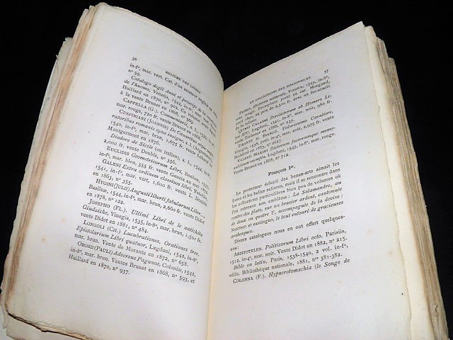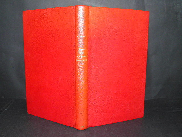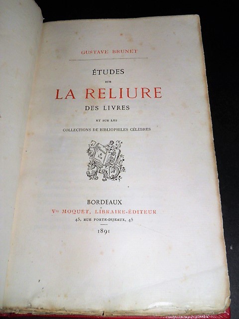 Please consult the conditions of sale at the end of the description before purchasing. BRUNET, Gustave. Studies on Book Binding and on the Collections of Famous Bibliophiles. Bordeaux, Veuve Moquet, Bookseller-Publisher, 1891. In-8 - 23.5x15cm. Later binding in full red shagreen , smooth spine, gilt title, date at the tail, covers preserved. VI, 173pp, 1ff. Second edition considerably enlarged. Limited edition 250 copies. Copy on Laid to form or Hollande Van Ghelder. The preserved covers are very damaged, with gaps, otherwise very nice copy. ___ Bookstore L’Art et la Manner 19 Route de Pithiviers 45300 BOYNES France Member of SLAM and LILA ( National Union of Ancient and Modern Bookstores / International League of Old Booksellers) ILAB (International League of Antiquarian Booksellers) English spoken Please don't hesitate to contact us if you have any inquiry The greatest care is taken in the description of the works, however, unintentional errors may be made. Do not hesitate to inform us, including after receipt of your purchase. Regarding shipping: The choice is yours! So that you can benefit from the best services and the most advantageous quality/price ratio, the bookstore offers you: Hand delivery by appointment, in Boynes, near Pithiviers, or in Paris on Saturday mornings or during old book fairs. Sending by the Post Office : by letter for folds less than 3 cm thick (packaging included) or by colissimo. Deposit in Relay Point . The bookstore practices group shipments . If you make multiple purchases in our store, u A new claim for payment with adjusted postage costs will be sent to you within a maximum period of 24 hours . THE insurance is optional (option not available for Relay Point shipments). For shipments to Overseas , please contact us beforehand to find out the exact amount of postal costs. Although packaging costs are offered, packages are reinforced and prepared with great care. The Librairie l'Art et la Manière is always on the lookout for rare and old works, to purchase individually or in batches. We travel primarily in Loiret (45), Paris (75) and the south of Ile-de-France (91, 77, 78, 92, 94) as well as in Yonne (89) and Eure-et-Loir (28). If you would like to sell some, do not hesitate to contact us. Just type “Librairie l’Art et la Manière” into your favorite search engine! Hand delivery by appointment, in Boynes, near Pithiviers, or in Paris on Saturday mornings or during old book fairs. Sending by the Post Office : by letter for folds less than 3 cm thick (packaging included) or by colissimo. The bookstore practices group shipments. If you make multiple purchases in our store, uA new claim for payment with adjusted postage costs will be sent to youwithin a maximum period of 24 hours. The Librairie l'Art et la Manière is always on the lookout for rare and old works, to purchase individually or in batches. We travel primarily in Loiret (45), Paris (75) and the south of Ile-de-France (91, 77, 78, 92, 94) as well as in Yonne (89) and Eure-et-Loir (28). If you would like to sell some, do not hesitate to contact us. Just type “Librairie l’Art et la Manière