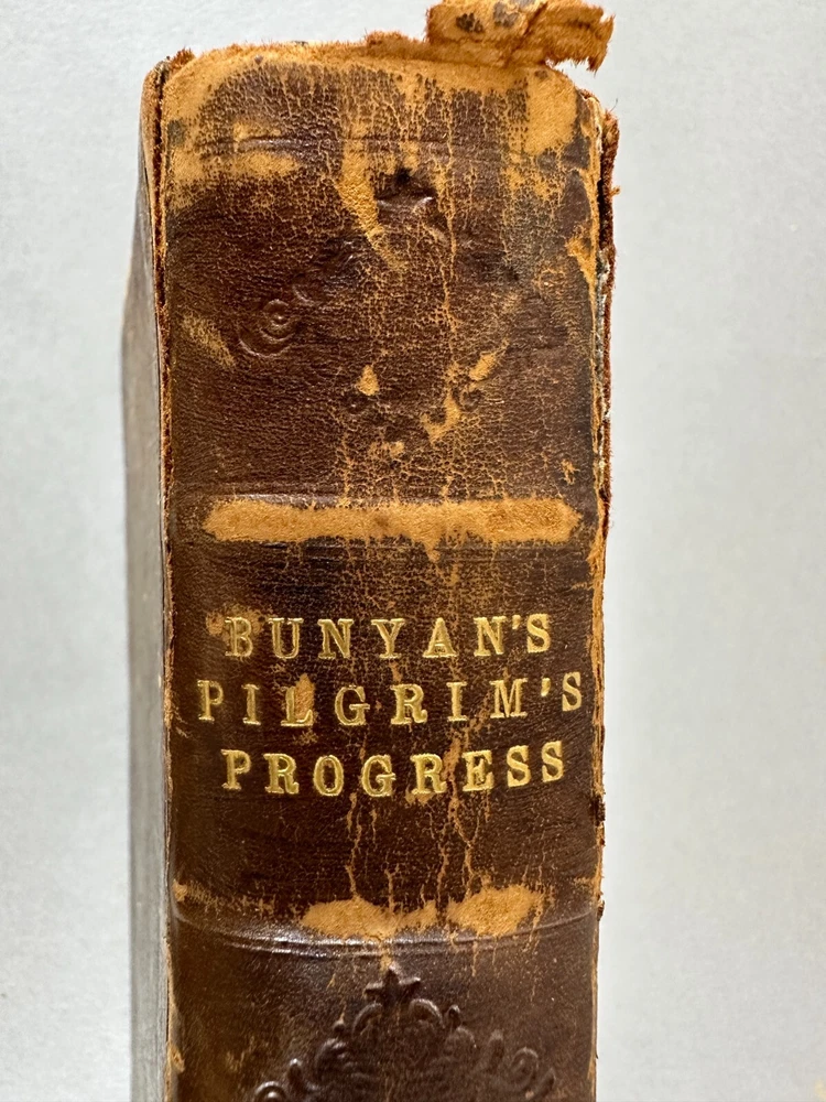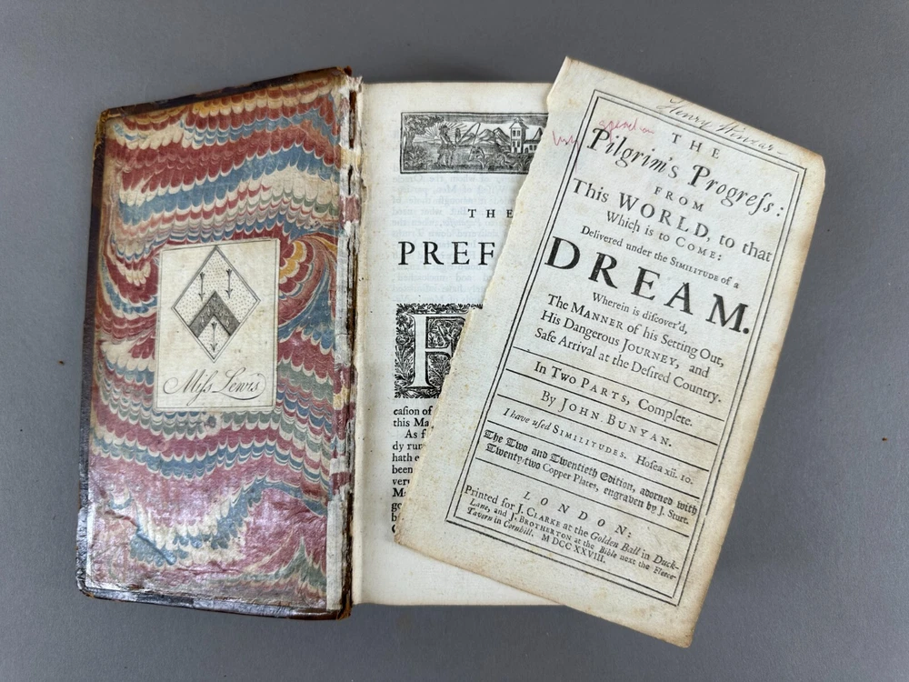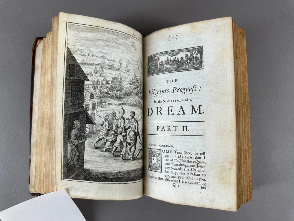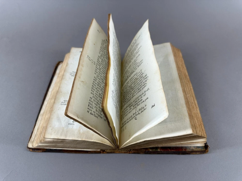 This listing is for an incredibly rare 1728 edition of Bunyan's Pilgrim's Progress, featuring: Leather wrapped Hardbound covers; Gilt Seal embossed on cover "Sigillum AcademiÆ DummerianÆ 1763"; tight spine; marbled end papers; ex-libris imprint Mifs Lewis; 22 copper plate engravings, two and twentith edition; in very nice condition with minor surface wear but the first page has separated from the binding. Size: 8" x 5" x 1-1/2". This is the first complete edition to be published as a fine book, containing two parts, and the first edition to feature John Stuart’s Illustrations. Bunyan died in 1688, so this edition was printed just 40 years after his death. The Pilgrim's Progress from This World, to That Which Is to Come is a 1678 Christian allegory written for John Bunyan. It is regarded as one of the most significant works of theological fiction in English literature and a progenitor of the narrative aspect of Christian media. It has been translated into more than 200 languages and has never been out of print. It appeared in Dutch in 1681, in German in 1703 and in Swedish in 1727. The first North American edition was issued in 1681. It has also been cited as the first novel written in English. According to literary editor Robert McCrum, "there's no book in English, apart from the Bible, to equal Bunyan's masterpiece for the range of its readership, or its influence on writers as diverse as William Hogarth, C. S. Lewis, Nathaniel Hawthorne, Herman Melville, Charles Dickens, Louisa May Alcott, George Bernard Shaw, William Thackeray, Charlotte Bronte, Mark Twain, John Steinbeck and Enid Blyton." The lyrics of the hymn "To be a Pilgrim" are based on the novel. Bunyan began his work while in the Bedfordshire county prison from 1660 to 1672 (right after he had written his spiritual autobiography Grace Abounding to the Chief of Sinners) for violations of the Conventicle Act 1664, which prohibited the holding of religious services outside the auspices of the established Church of England. Title: The Pilgrim's Progress, From This World to that Which is to Come, Delivered under the Similitude of a Dream, Wherein is discover'd The Manner of his Setting Out, His Dangerous Journey, and Safe Arrival at the Desired Country, In Two Parts, Complete, The Two and Twentieth Edition, adorned with Twenty-Two Copper Plates, engraved by J. Sturt, London, 1728; The Pilgrim's Progress From This World to that which is to Come, Part 11, Delivered under the Similitude of a Dream, Wherein is set forth, The Manner of the Setting out of Christian's Wife and Children, their Dangerous Journey, and Safe Arrival at the Desired Country, London, Printed for John Clarke, at the Golden Ball in Duck Lane, 1727 Author: BUNYAN (John), . Publisher: Printed for J. Clarke at the Golden Ball in Duck-Lane and J. Brotherton at the Bible next the Fleece-Tavern in Cornhill - 1727 The entire book is presented as a dream sequence narrated by an omniscient narrator. The allegory's protagonist, Christian, is an everyman character, and the plot centres on his journey from his hometown, the "City of Destruction" ("this world"), to the "Celestial City" ("that which is to come": Heaven) atop Mount Zion. Christian is weighed down by a great burden—the knowledge of his sin—which he believed came from his reading "the book in his hand" (the Bible). This burden, which would cause him to sink into Hell, is so unbearable that Christian must seek deliverance. He meets Evangelist as he is walking out in the fields, who directs him to the "Wicket Gate" for deliverance. Since Christian cannot see the "Wicket Gate" in the distance, Evangelist directs him to go to a "shining light", which Christian thinks he sees. Christian leaves his home, his wife, and children to save himself: he cannot persuade them to accompany him. Obstinate and Pliable go after Christian to bring him back, but Christian refuses. Obstinate returns disgusted, but Pliable is persuaded to go with Christian, hoping to take advantage of the Paradise that Christian claims lies at the end of his journey. Pliable's journey with Christian is cut short when the two of them fall into the Slough of Despond, a boggy mire-like swamp where pilgrims' doubts, fears, temptations, lusts, shames, guilts, and sins of their present condition of being a sinner are used to sink them into the mud of the swamp. It is there in that bog where Pliable abandons Christian after getting himself out. After struggling to the other side of the slough, Christian is pulled out by Help, who has heard his cries and tells him the swamp is made out of the decadence, scum, and filth of sin, but the ground is good at the narrow Wicket Gate.