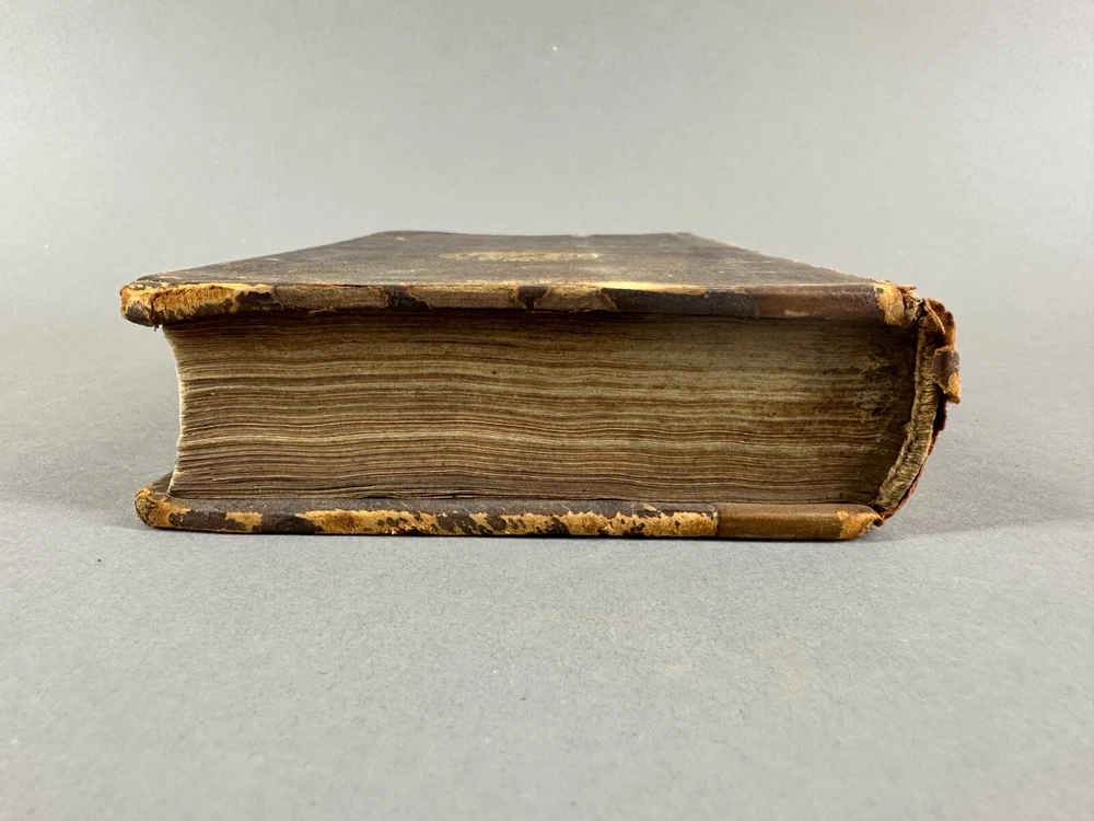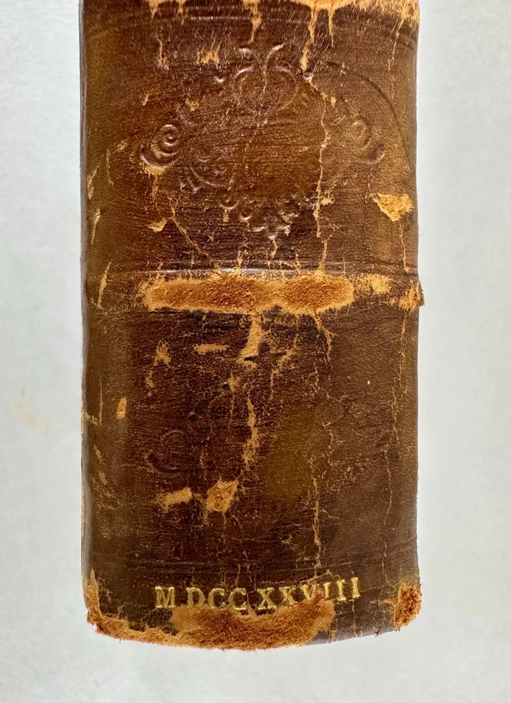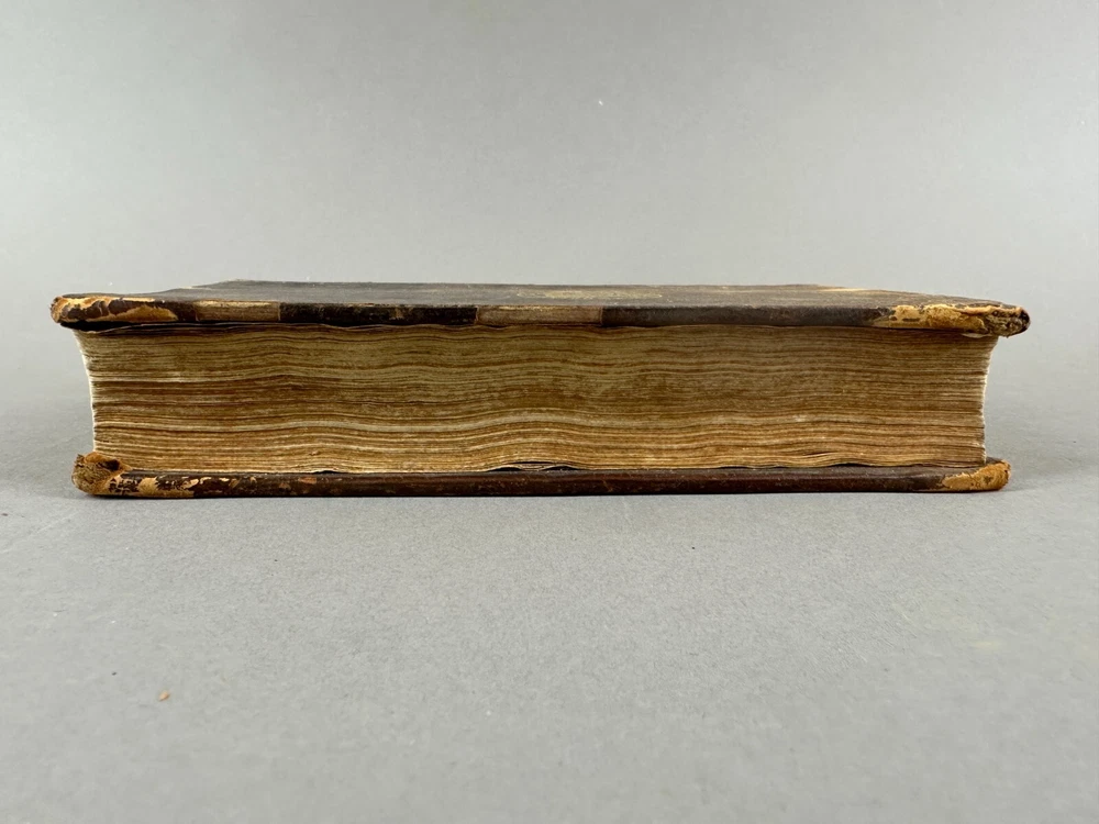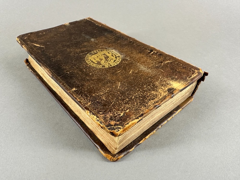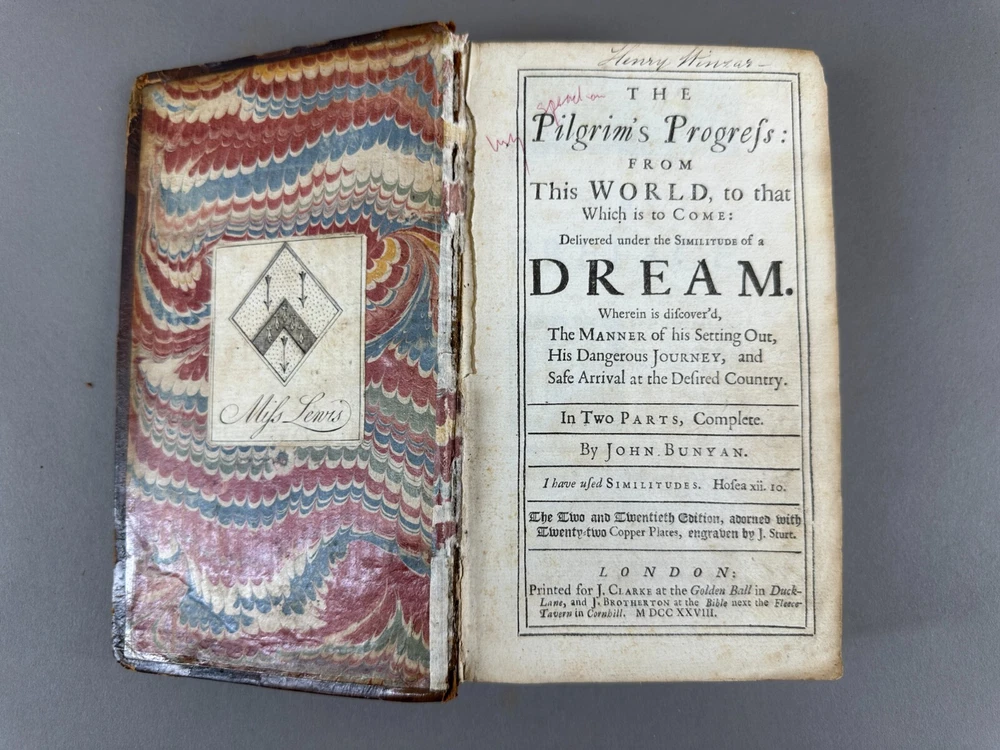 This listing is for an incredibly rare 1728 edition of Bunyan's Pilgrim's Progress, featuring: Leather wrapped Hardbound covers; Gilt Seal embossed on cover "Sigillum AcademiÆ DummerianÆ 1763"; tight spine; marbled end papers; ex-libris imprint Mifs Lewis; 22 copper plate engravings, two and twentith edition; in very nice condition with minor surface wear but the first page has separated from the binding. Size: 8" x 5" x 1-1/2". This is the first complete edition to be published as a fine book, containing two parts, and the first edition to feature John Stuart’s Illustrations. Bunyan died in 1688, so this edition was printed just 40 years after his death. The Pilgrim's Progress from This World, to That Which Is to Come is a 1678 Christian allegory written for John Bunyan. It is regarded as one of the most significant works of theological fiction in English literature and a progenitor of the narrative aspect of Christian media. It has been translated into more than 200 languages and has never been out of print. It appeared in Dutch in 1681, in German in 1703 and in Swedish in 1727. The first North American edition was issued in 1681. It has also been cited as the first novel written in English. According to literary editor Robert McCrum, "there's no book in English, apart from the Bible, to equal Bunyan's masterpiece for the range of its readership, or its influence on writers as diverse as William Hogarth, C. S. Lewis, Nathaniel Hawthorne, Herman Melville, Charles Dickens, Louisa May Alcott, George Bernard Shaw, William Thackeray, Charlotte Bronte, Mark Twain, John Steinbeck and Enid Blyton." The lyrics of the hymn "To be a Pilgrim" are based on the novel. Bunyan began his work while in the Bedfordshire county prison from 1660 to 1672 (right after he had written his spiritual autobiography Grace Abounding to the Chief of Sinners) for violations of the Conventicle Act 1664, which prohibited the holding of religious services outside the auspices of the established Church of England. Title: The Pilgrim's Progress, From This World to that Which is to Come, Delivered under the Similitude of a Dream, Wherein is discover'd The Manner of his Setting Out, His Dangerous Journey, and Safe Arrival at the Desired Country, In Two Parts, Complete, The Two and Twentieth Edition, adorned with Twenty-Two Copper Plates, engraved by J. Sturt, London, 1728; The Pilgrim's Progress From This World to that which is to Come, Part 11, Delivered under the Similitude of a Dream, Wherein is set forth, The Manner of the Setting out of Christian's Wife and Children, their Dangerous Journey, and Safe Arrival at the Desired Country, London, Printed for John Clarke, at the Golden Ball in Duck Lane, 1727 Author: BUNYAN (John), . Publisher: Printed for J. Clarke at the Golden Ball in Duck-Lane and J. Brotherton at the Bible next the Fleece-Tavern in Cornhill - 1727 The entire book is presented as a dream sequence narrated by an omniscient narrator. The allegory's protagonist, Christian, is an everyman character, and the plot centres on his journey from his hometown, the "City of Destruction" ("this world"), to the "Celestial City" ("that which is to come": Heaven) atop Mount Zion. Christian is weighed down by a great burden—the knowledge of his sin—which he believed came from his reading "the book in his hand" (the Bible). This burden, which would cause him to sink into Hell, is so unbearable that Christian must seek deliverance. He meets Evangelist as he is walking out in the fields, who directs him to the "Wicket Gate" for deliverance. Since Christian cannot see the "Wicket Gate" in the distance, Evangelist directs him to go to a "shining light", which Christian thinks he sees. Christian leaves his home, his wife, and children to save himself: he cannot persuade them to accompany him. Obstinate and Pliable go after Christian to bring him back, but Christian refuses. Obstinate returns disgusted, but Pliable is persuaded to go with Christian, hoping to take advantage of the Paradise that Christian claims lies at the end of his journey. Pliable's journey with Christian is cut short when the two of them fall into the Slough of Despond, a boggy mire-like swamp where pilgrims' doubts, fears, temptations, lusts, shames, guilts, and sins of their present condition of being a sinner are used to sink them into the mud of the swamp. It is there in that bog where Pliable abandons Christian after getting himself out. After struggling to the other side of the slough, Christian is pulled out by Help, who has heard his cries and tells him the swamp is made out of the decadence, scum, and filth of sin, but the ground is good at the narrow Wicket Gate.