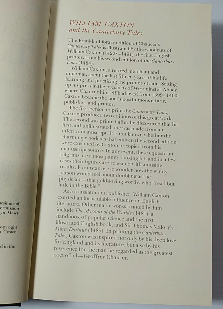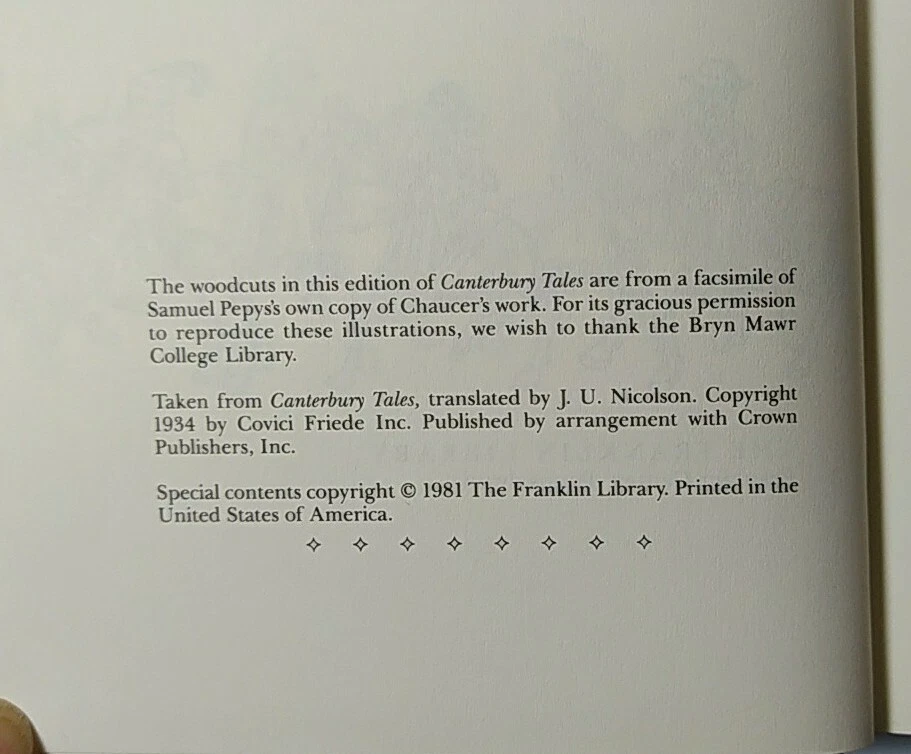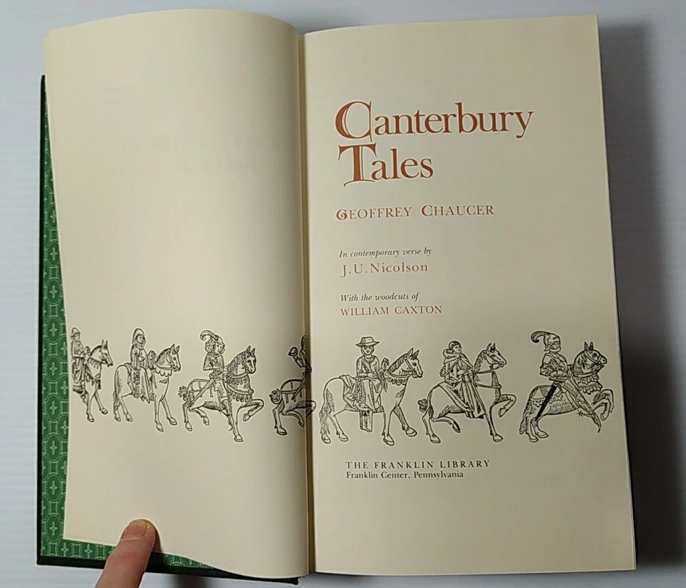 CANTERBURY TALES by GEOFFREY CHAUCER Leather Bound Franklin Library The 1981 Franklin Library edition of Geoffrey Chaucer's *The Canterbury Tales*, encased in a luxurious leather binding, stands as a captivating collector's item. This rendition of one of English literature's most renowned works features 24 narratives recounted by a group of pilgrims en route to Canterbury Cathedral, encompassing a diverse array of genres such as romance, comedy, tragedy, and satire. The esteemed reputation of the Franklin Library, celebrated for its exquisite bindings and intricate illustrations, is upheld through this volume. Gilded with gold leaf, the leather cover boasts an embossed design, while the pages are adorned with gilt edging. Enhancing the allure are the 24 full-color illustrations by Arthur Rackham that grace the book's pages. Whether you're an enthusiast of Geoffrey Chaucer's literary prowess or a connoisseur of fine books, acquiring the 1981 Franklin Library edition of *The Canterbury Tales* becomes an undeniable imperative.