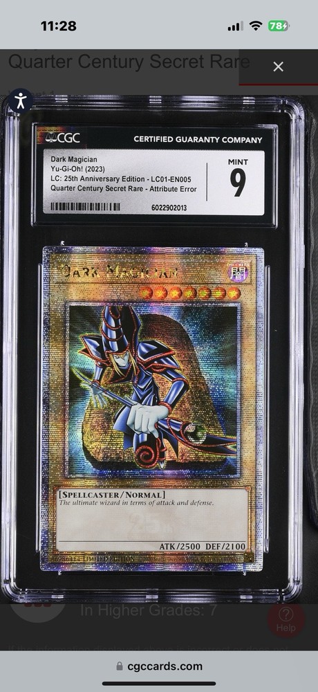 This Dark Magician card is a true gem for any collector! The Quarter Century Secret Rare finish makes it shine, and the CGC 9 grade ensures top-notch condition. The unique attribute misprint adds extra rarity, making it a standout piece from the 25th Anniversary set. With its powerful stats and stunning artwork, this limited edition card is a must-have for Yu-Gi-Oh! enthusiasts. Definitely worth the investment for both play and display!