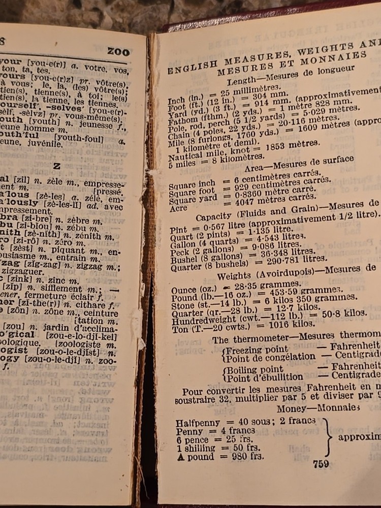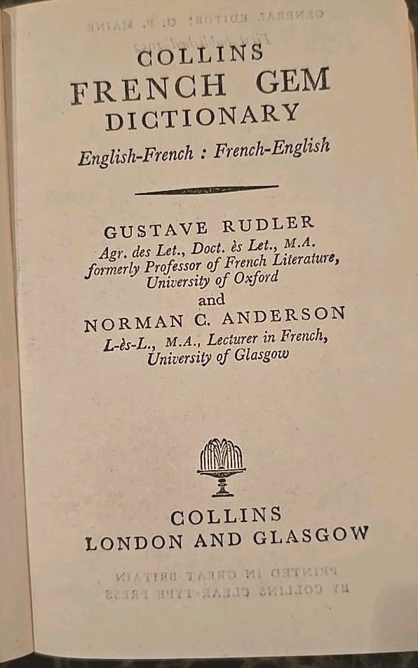 The Collins French Gem Dictionary from 1952 is a valuable resource for language study, specifically focusing on the English and French languages. This leather-bound bilingual dictionary, authored by Isopel May, contains 759 pages filled with essential vocabulary and phrases. Perfect for language enthusiasts or students looking to expand their language skills, this mini collection offers a comprehensive look at both English and French in a convenient and durable format.