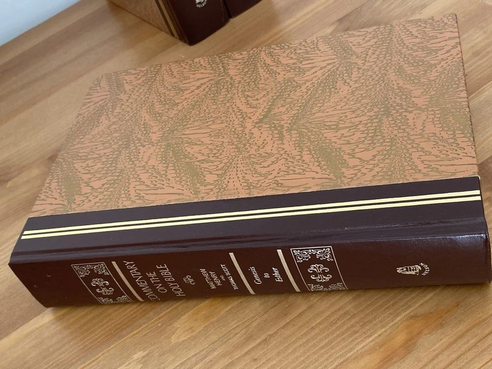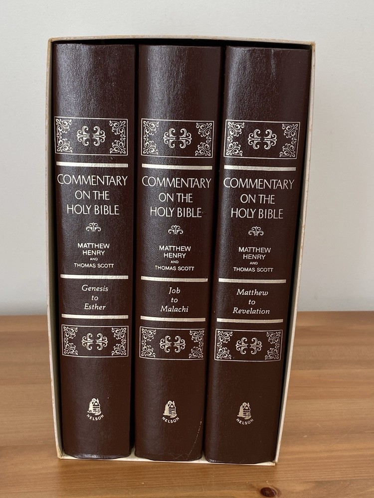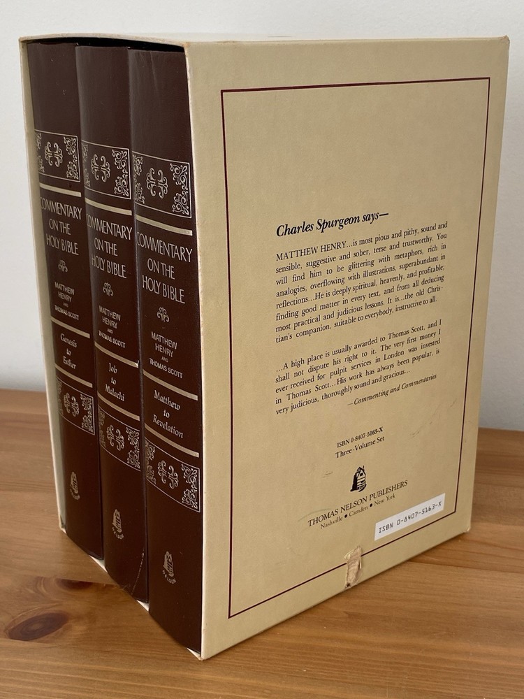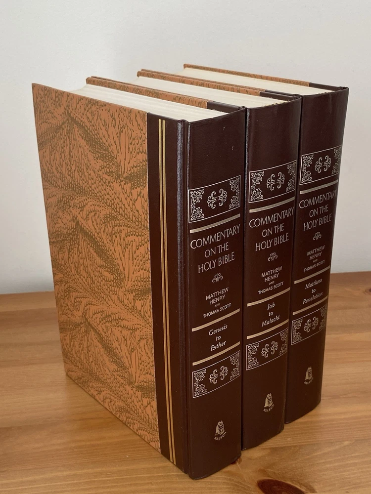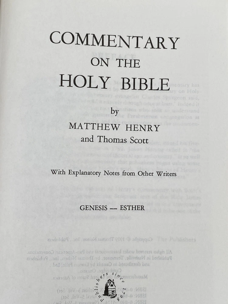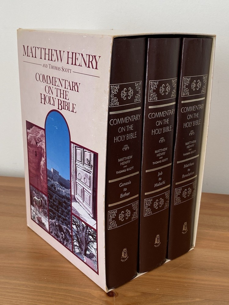 COMMENTARY ON THE HOLY BIBLE Matthew Henry Thomas Scott 3 Book SET & Slipcase Very good vintage condition with light wear on edges. Wear as noted on the slip case. NOTE: One page in the last volume has a manufacturing defect as shown in the photo. Otherwise all pages are clean and binding are tight.
