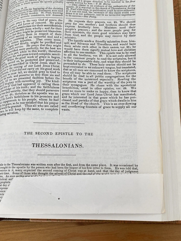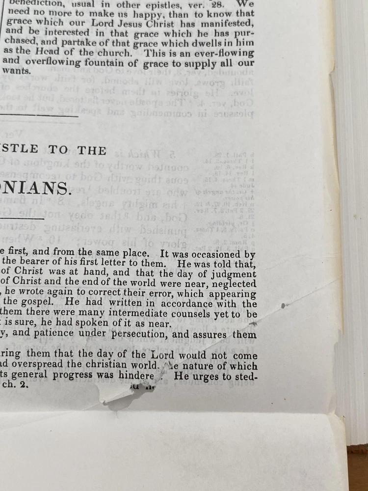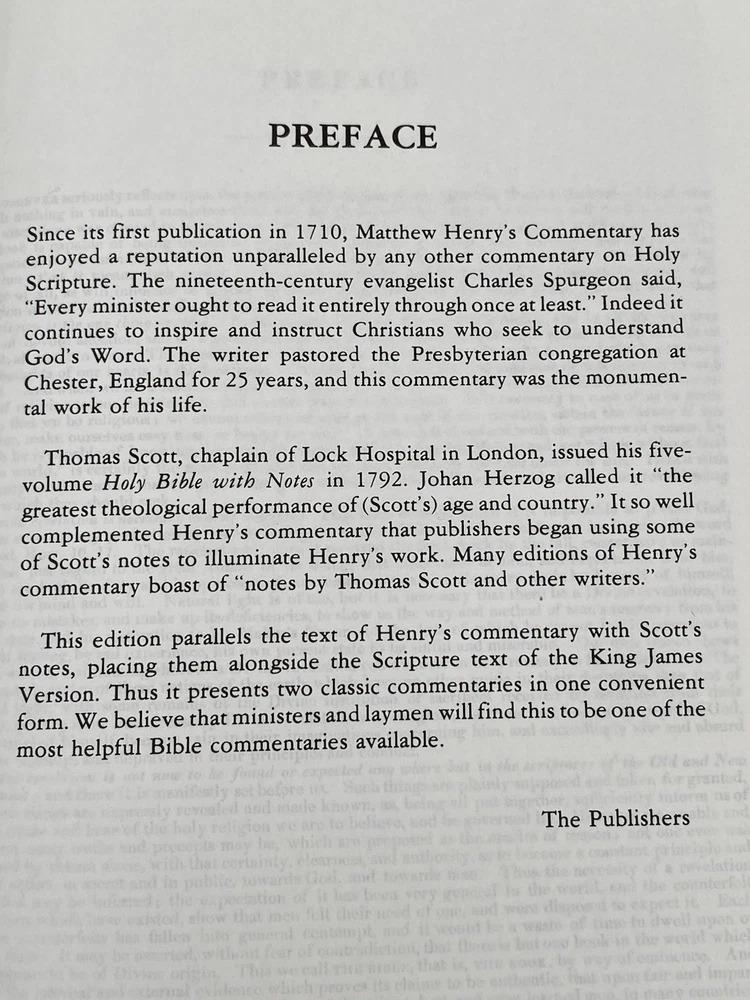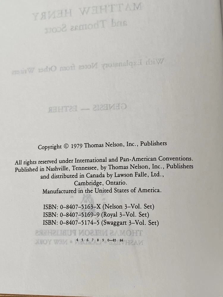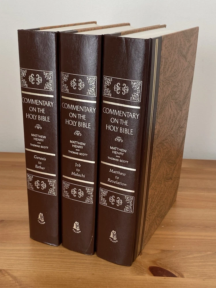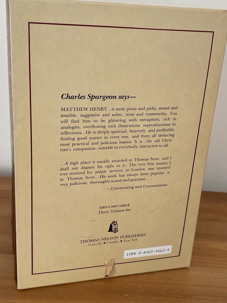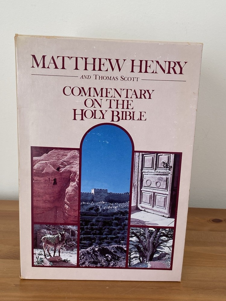 COMMENTARY ON THE HOLY BIBLE Matthew Henry Thomas Scott 3 Book SET & Slipcase Very good vintage condition with light wear on edges. Wear as noted on the slip case. NOTE: One page in the last volume has a manufacturing defect as shown in the photo. Otherwise all pages are clean and binding are tight.