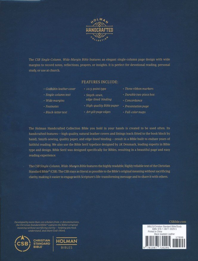 The CSB Single-Column Wide-Margin Bible features an elegant single-column page design with wide margins to record notes, reflections, prayers, or insights. It is perfect for devotional reading, personal study, or use at church. FEATURES: Premium goatskin leather cover Single-column text format Wide margins for notes, reflections, prayers, and insights Smyth-sewn, lay-flat, edge-lined binding meant to last a lifetime Art gilt page edges High-quality Bible paper Black-letter text for easy readability 10-point type size Footnotes Three ribbon markers for easy referencing between pages Elegant two-piece gilded gift box Concordance Presentation page for gift-giving Full-color maps 6.875" x 9" page size This Holman Handcrafted Collection Bible is created to be used often. Its handcrafted features--high quality, natural leather covers and linings (each fit to the book block by hand), Smyth-sewing, quality paper, and edge-lined binding--result in a Bible built to endure years of faithful reading. The Bible Serif typeface used was created by 2K Denmark, leading experts in Bible type and design, resulting in a beautiful page and easy reading experience. The CSB Single-Column Wide-Margin Bible features the highly readable, highly reliable text of the Christian Standard Bible® (CSB) . The CSB stays as literal as possible to the Bible's original meaning without sacrificing clarity, making it easier to engage with Scripture's life-transforming message and to share it with others., The CSB Single-Column Wide-Margin Bible features an elegant single-column page design with wide margins to record notes, reflections, prayers, or insights. It is perfect for devotional reading, personal study, or use at church. FEATURES: Premium goatskin leather cover Single-column text format Wide margins for notes, reflections, prayers, and insights Smyth-sewn, lay-flat, edge-lined binding meant to last a lifetime Art gilt page edges High-quality Bible paper Black-letter text for easy readability 10-point type size Footnotes Three ribbon markers for easy referencing between pages Elegant two-piece gilded gift box Concordance Presentation page for gift-giving Full-color maps 6.875" x 9" page size This Holman Handcrafted Collection Bible is created to be used often. Its handcrafted features--high quality, natural leather covers and linings (each fit to the book block by hand), Smyth-sewing, quality paper, and edge-lined binding--result in a Bible built to endure years of faithful reading. The Bible Serif typeface used was created by 2K Denmark, leading experts in Bible type and design, resulting in a beautiful page and easy reading experience. The CSB Single-Column Wide-Margin Bible features the highly readable, highly reliable text of the Christian Standard Bible(R) (CSB) . The CSB stays as literal as possible to the Bible's original meaning without sacrificing clarity, making it easier to engage with Scripture's life-transforming message and to share it with others., The CSB Single-Column Wide-Margin Bible features an elegant single-column page design with wide margins to record notes, reflections, prayers, or insights. It is perfect for devotional reading, personal study, or use at church. This Holman Handcrafted Collection Bible is created to be used often. Its handcrafted features--high quality, natural leather covers and linings (each fit to the book block by hand), Smyth-sewing, quality paper, and edge-lined binding--result in a Bible built to endure years of faithful reading. The Bible Serif typeface used was created by 2K Denmark, leading experts in Bible type and design, resulting in a beautiful page and easy reading experience. |