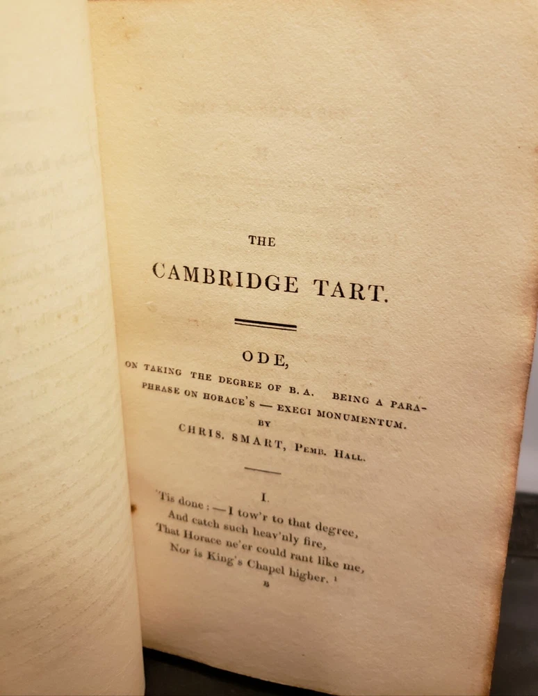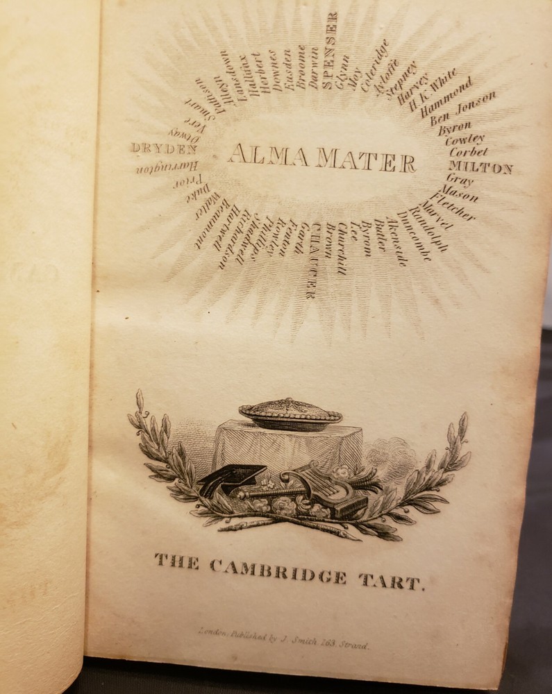 Cambridge Text Epigrammatic And Satiric-Poetical Effusions; &c, &c, Dainty Morsels, Served Up by Cantabs, on various occasions. Dedicated to the members of the University of Cambridge, by Socius. London: Published by James Smith, 163, Strand. and J. Anderson, 40, West-Smithfield.1st 1823. Fine Binding. Condition is Very Good. Shipped with USPS media Mail. Dark brown leather over marbled boards. The spine is decorated with extra Gilt with a gilt title on a brown label. Top edge Gilt. endpapers marbled. 289pp plus a couple extra of additional blanks. The book is clean and tight.