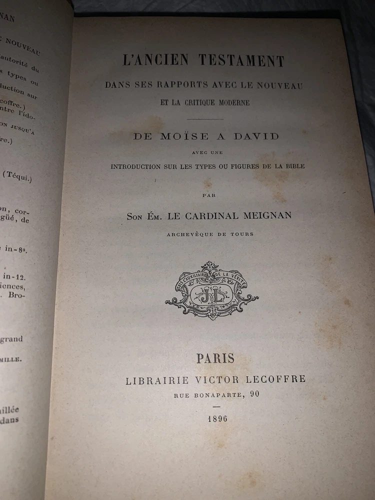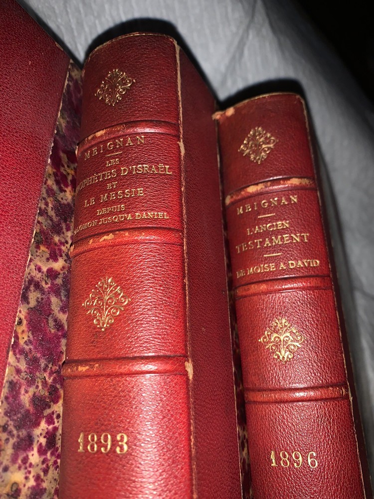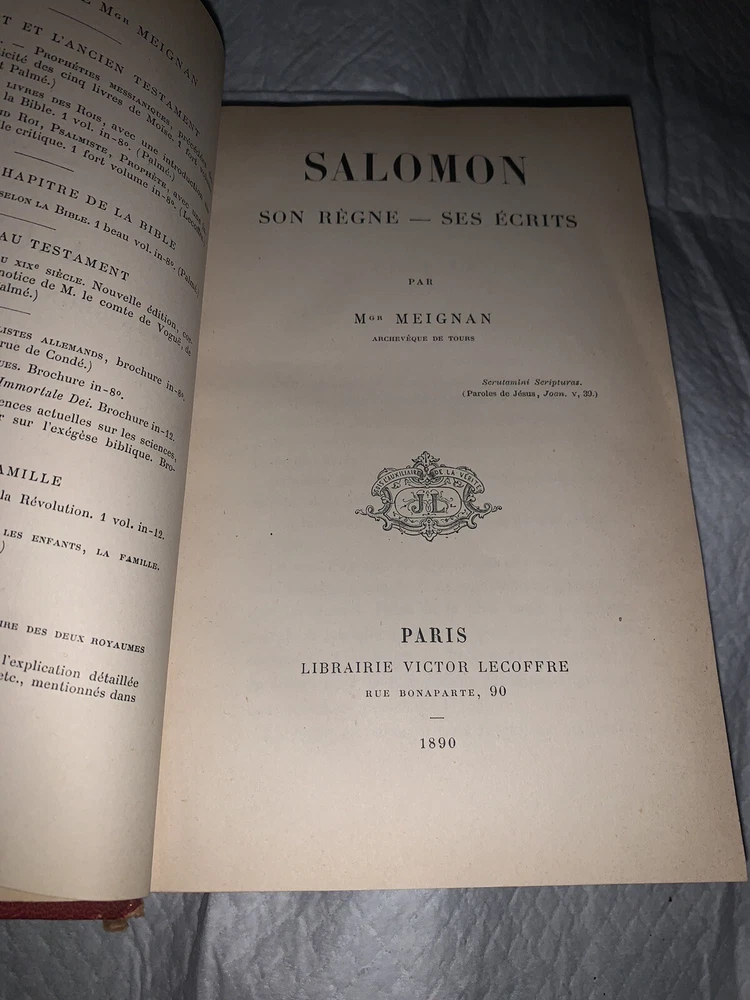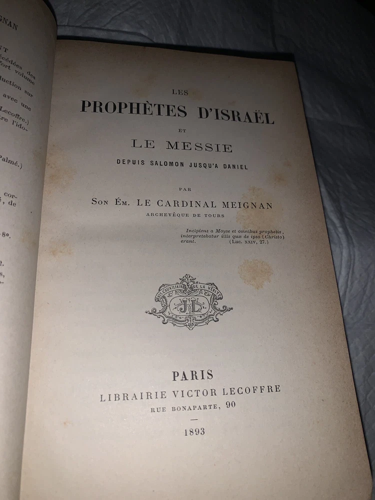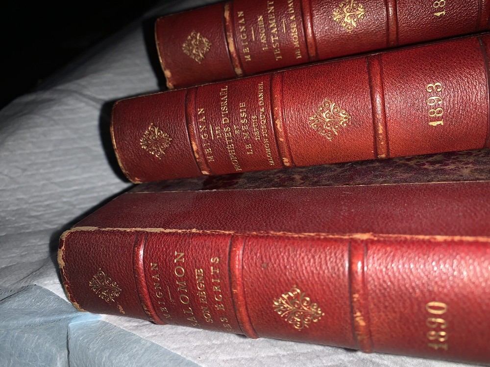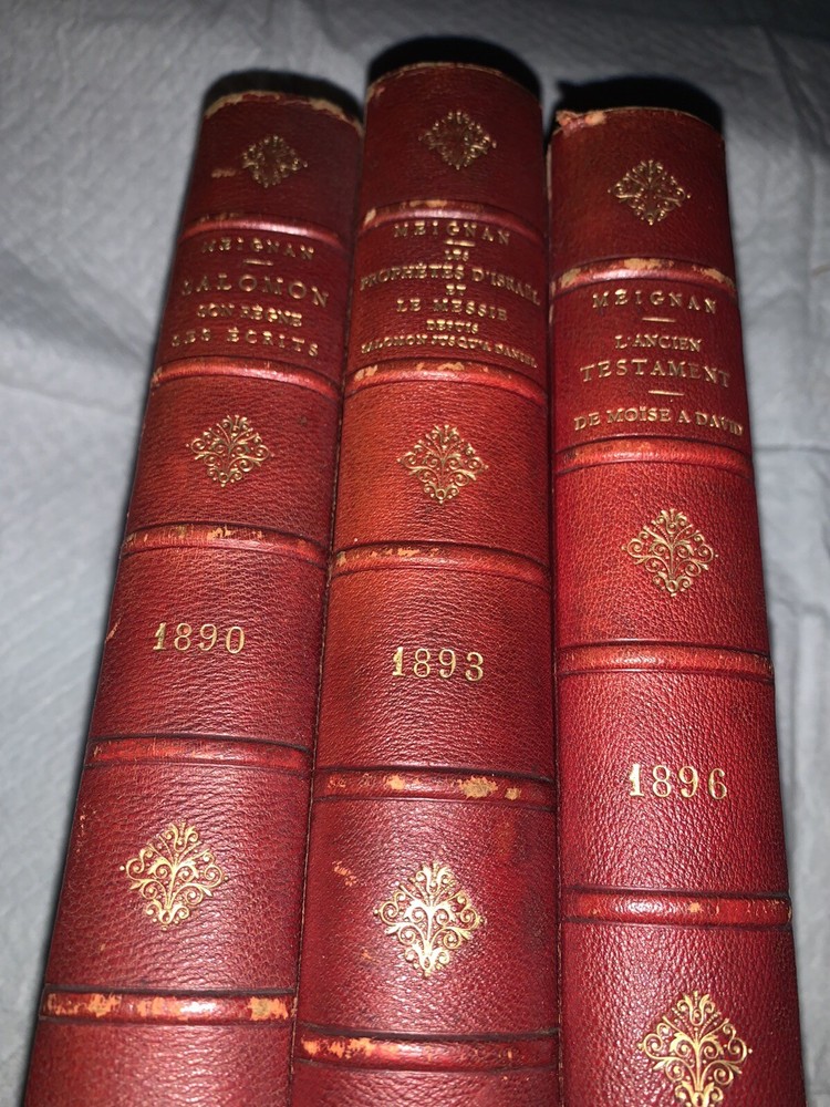 Les Propheties Messianiques De L'ancien Testament: Ou, - Leather Marbling-Meignan, 1896 VG+ Salomon, son règne, ses écrits" (Paris) 1890 VG+ Les prophètes d'Israël et le Messie, depuis Daniel jusqu'à Jean-Baptiste 1893 VG+ Immerse yourself in the world of antique French literature with this exquisite Cardinal Meignan book collection. This deluxe set features three rare leather-bound books published by Lecoffre in Paris, each containing insightful religious and spiritual writings by the esteemed author. With a focus on topics such as faith, morality, and human nature, these books are perfect for collectors and anyone interested in exploring the depths of spiritual philosophy. The bindings are in excellent vintage condition, adding to the charm and uniqueness of these books. The pages are crisp and clean, allowing for an enjoyable reading experience. Don't miss out on the opportunity to own a piece of history with this Cardinal Meignan Antiquarian Deluxe Book Collection.