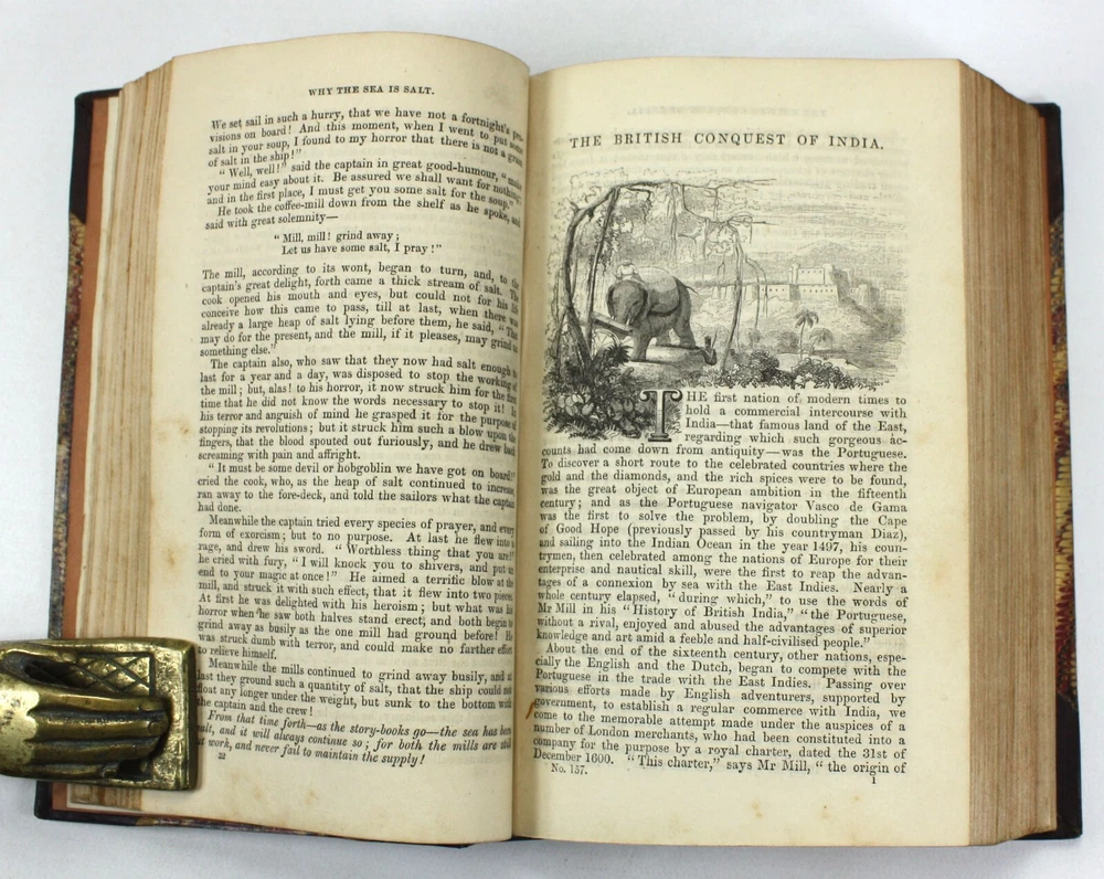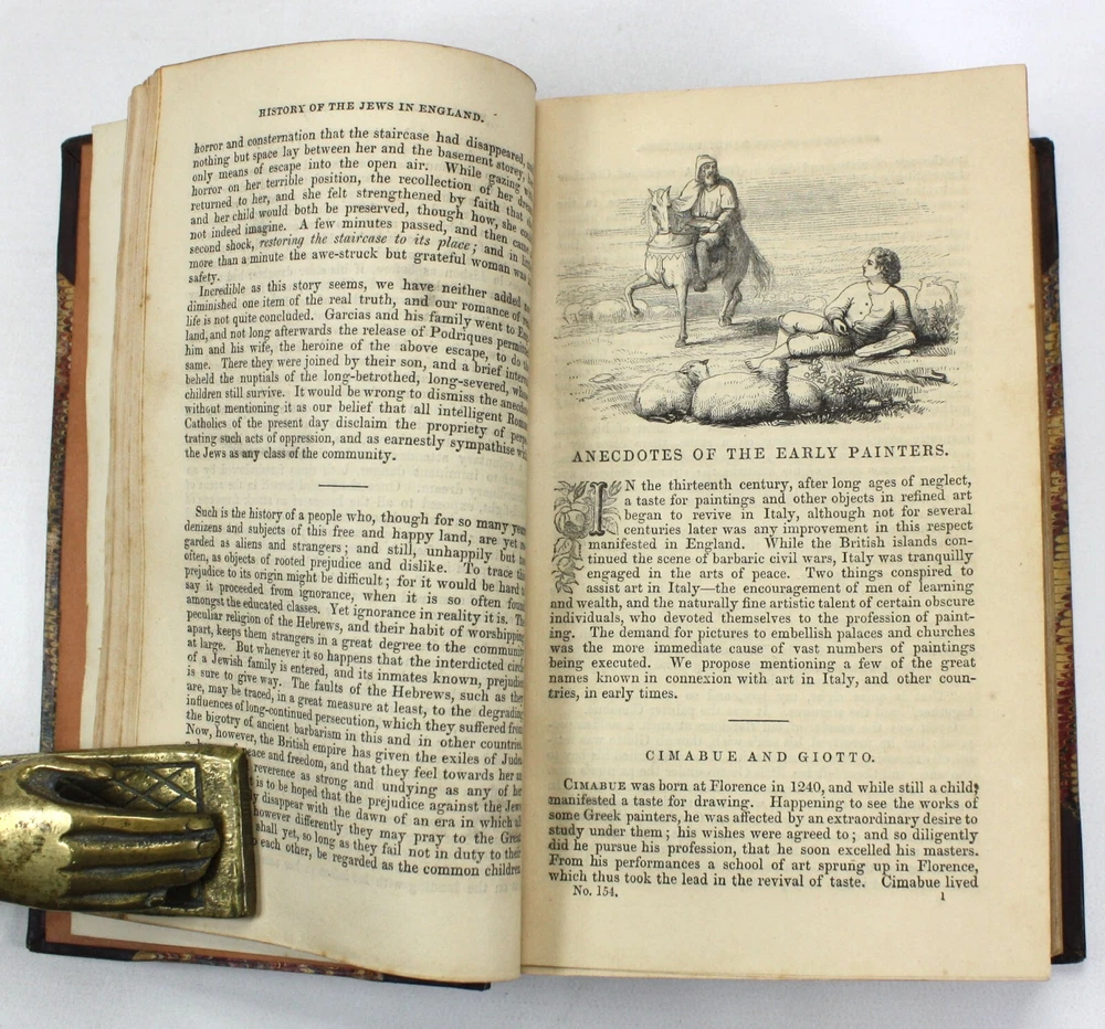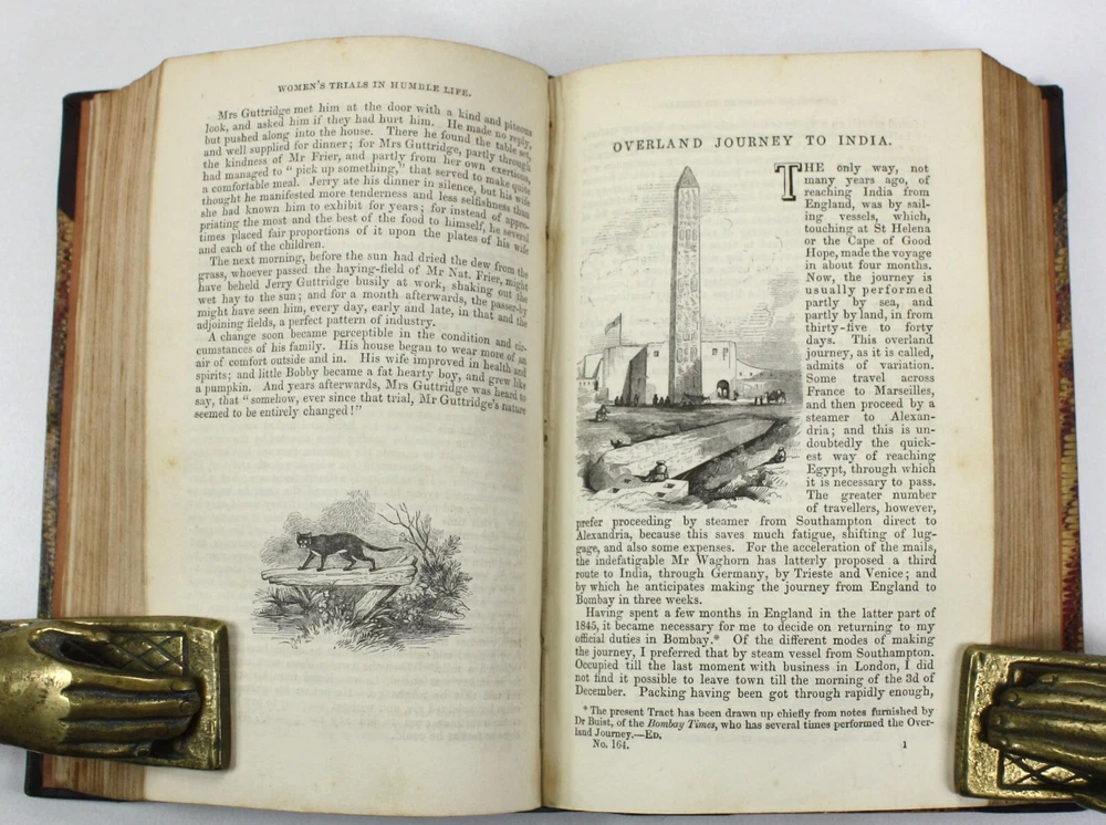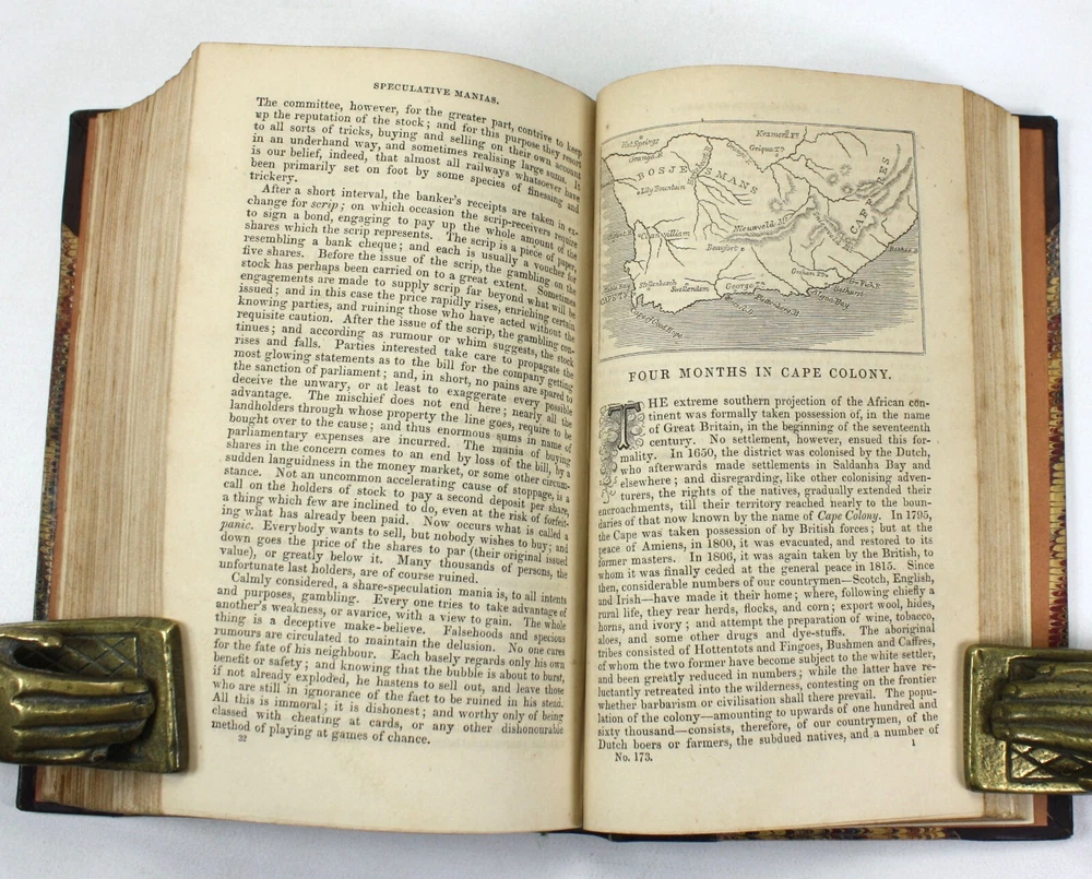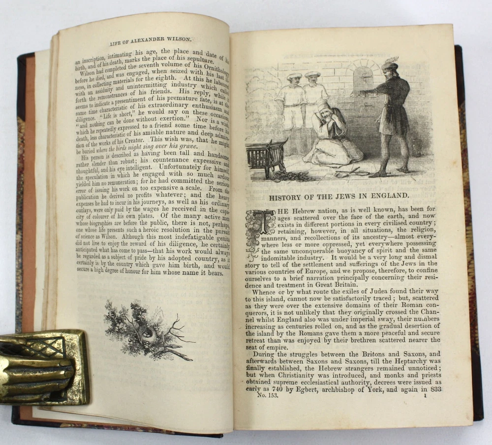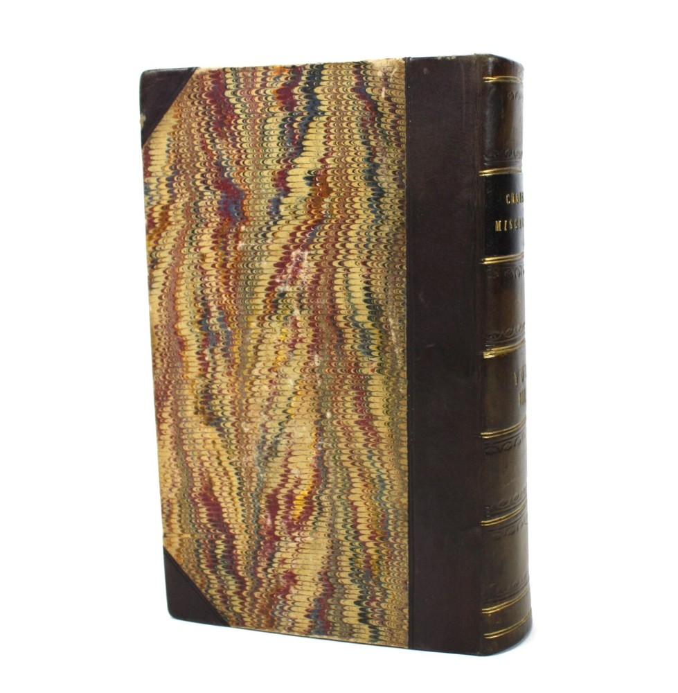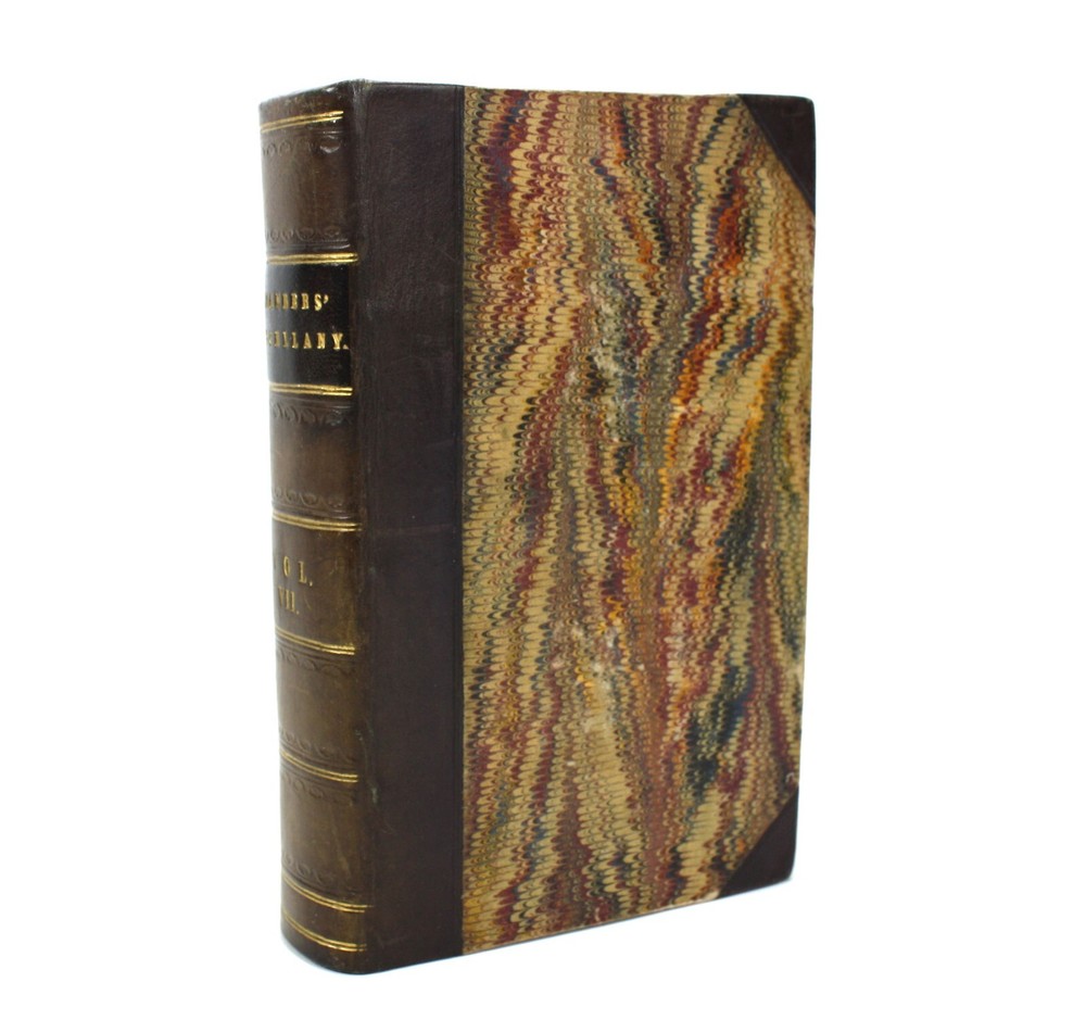 A charming bound copy of Chambers Miscellany containing a wealth of informative essays and features to interest Victorian readers. Still an entertaining read today. Chambers's Miscellany of Useful & Entertaining Tracts. This volume contains tracts 151-177. Features 27 Tracts in total on a diverse range of subjects including: Elizabethan Poets; Sir William Jones; History of the Jews in England; Anecdotes of the Early Painters; Treasures of the Earth; The Magic Flute; Why the Sea is Salt; British Conquest of India; Story of Jacquard; Fireside Education; Poems of Birds; Life of Count Rumford; The Crusades; Women's Trials in Humble Life; Overland Journey to India; Moral Tales, from the French; History of the Bastile; Pearls and Pearl-Fisheries; Poetical Selection; Newton (and other major Scientific figures); Hints to Workmen; The Guerilla; Speculative Manias; Four Months in Cape Colony; English Proverbs; Scotch Proverbs; Wonders of the Telescope; Jim Cronin, An Irish Tale; and; Songs of Home and Fatherland. Published by W. and R. Chambers, Edinburgh. Presumed first edition. Undated, but believed to have been published in 1847. The tracts have been bound in to the volume without any title page or contents list, but we have been able to date them from matching to another copy held by University of California library, Santa Barbara (considered as being Vol XIX for tracts 161-168, meaning that this collection can be considered to span volumes XVIII - XX. A very good hardback, smartly bound with leather spine and corners, and marbled paper over boards. Gilt decoration to spine, with black morocco title label. Light scuffing and bumping. Soundly bound. Illustrated. Text is clean and bright throughout with light scattered spotting. A handsome volume. Text in English. No overall numbering system, but with features numbered individually. Dimensions: Each volume approximately 181mm x 118mm x 40mm. Weight approximately 610g (unpacked).