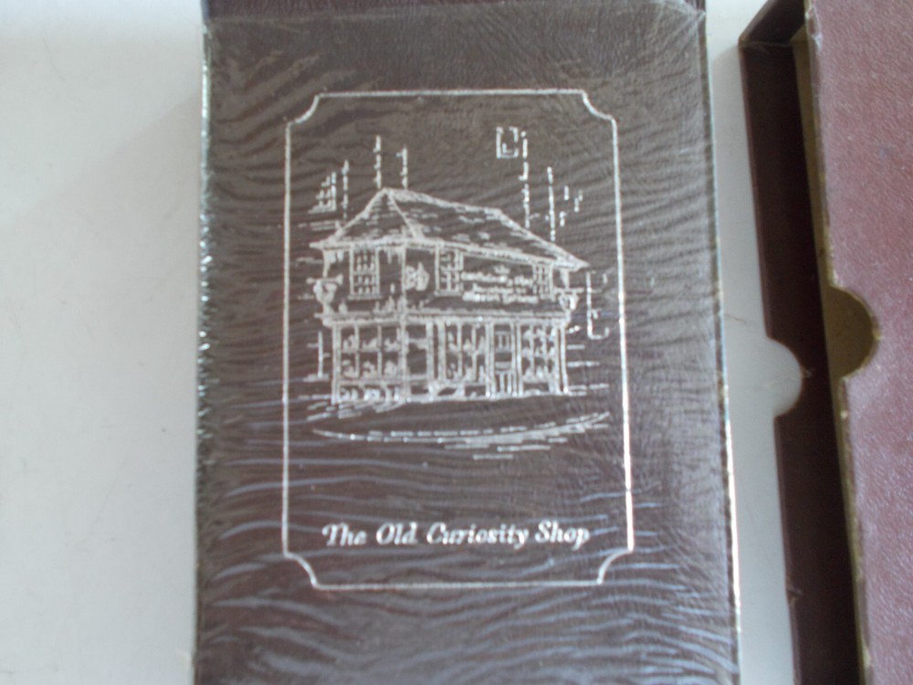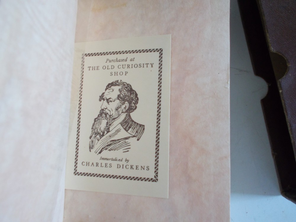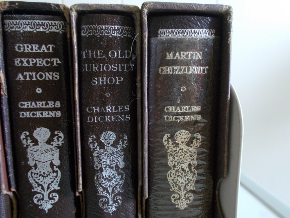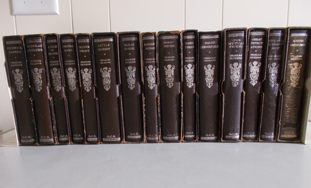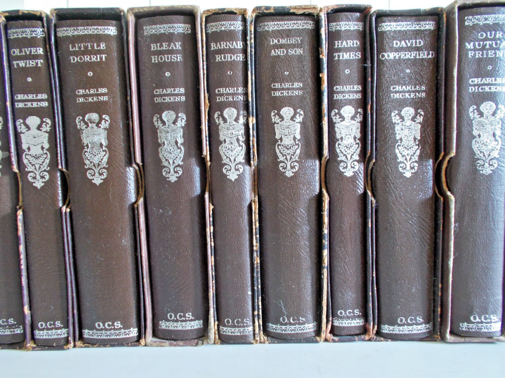 15 Charles Dickens classics - London and Glasgow Clear Type Press. Appears to be a complete set. All books appear to have never been read - they all have the original card on the inside cover - as new (see photo). They all come with the original slip cases, though the slip cases do have some shelf wear - probably from being moved to dust them for almost 100 years. One of the books even has the original celluloid wrapper still on it. The back is out of one of the slip cases - see photos. The books appear to be leather bound (not sure if it is real leather ?). Not sure of the date of publication - I don't see it anywhere. They measure 4 inches by 6 inches, which places them somewhere between 1903 and 1945. Each slip case is stamped "British Made". All have the same design on the front cover, done in vermeil (silver-gilt). Spine designs are also vermeil. Very rare to see a complete set in such remarkably good condition.