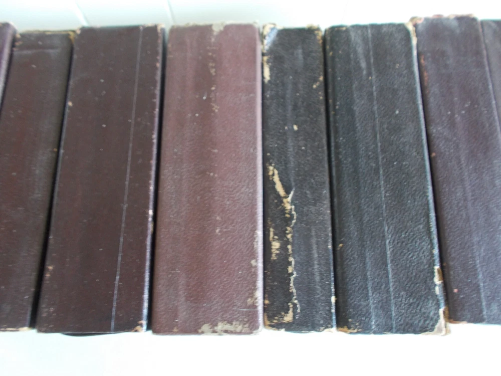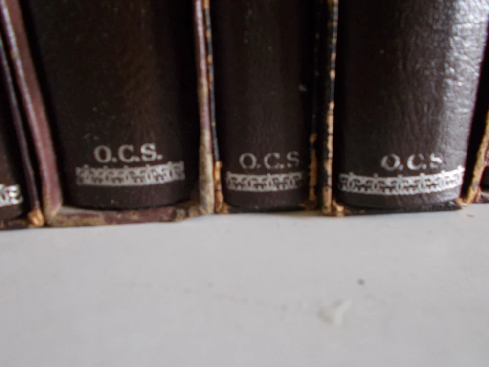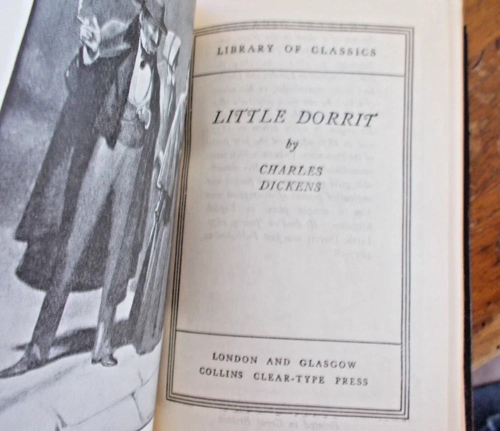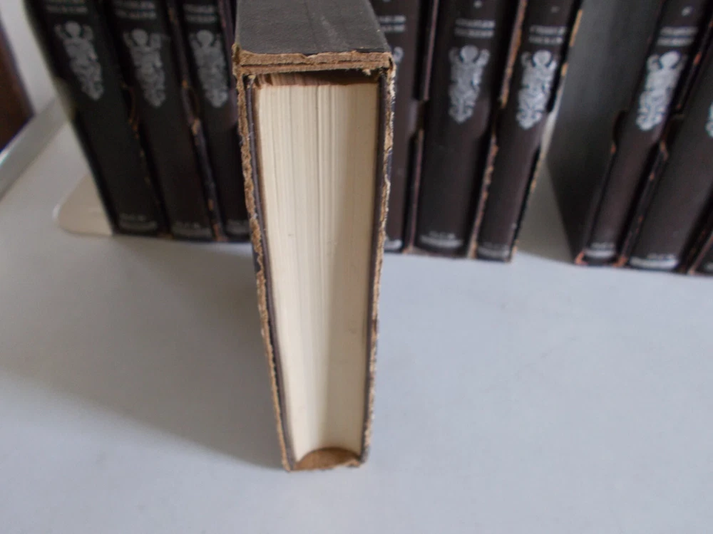 15 Charles Dickens classics - London and Glasgow Clear Type Press. Appears to be a complete set. All books appear to have never been read - they all have the original card on the inside cover - as new (see photo). They all come with the original slip cases, though the slip cases do have some shelf wear - probably from being moved to dust them for almost 100 years. One of the books even has the original celluloid wrapper still on it. The back is out of one of the slip cases - see photos. The books appear to be leather bound (not sure if it is real leather ?). Not sure of the date of publication - I don't see it anywhere. They measure 4 inches by 6 inches, which places them somewhere between 1903 and 1945. Each slip case is stamped "British Made". All have the same design on the front cover, done in vermeil (silver-gilt). Spine designs are also vermeil. Very rare to see a complete set in such remarkably good condition.