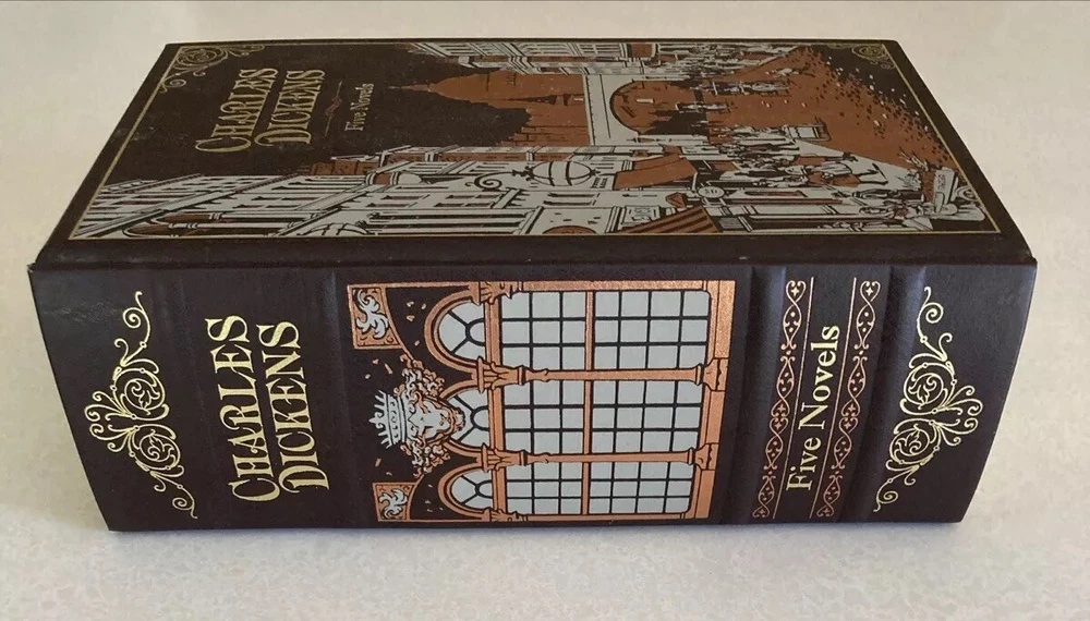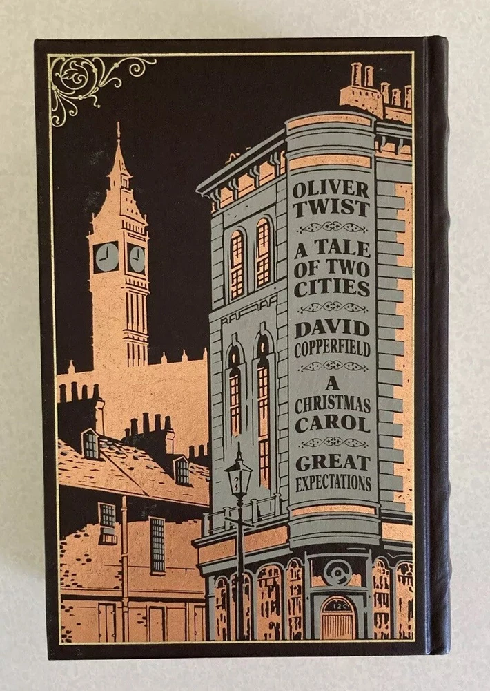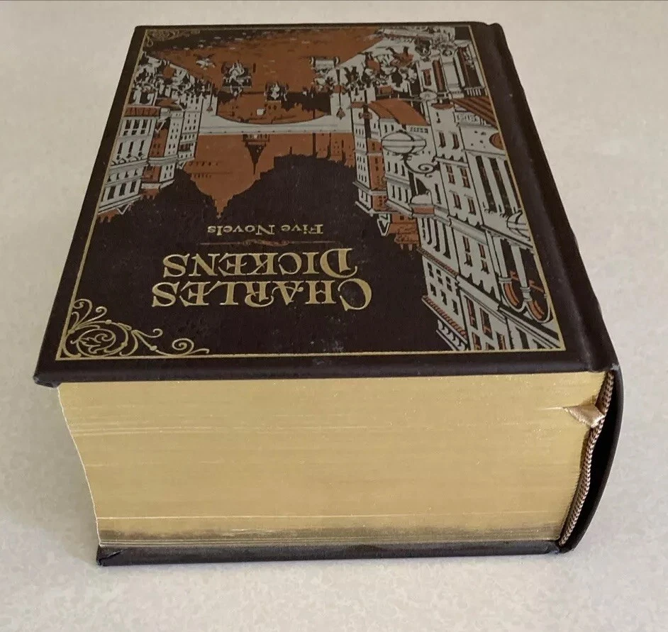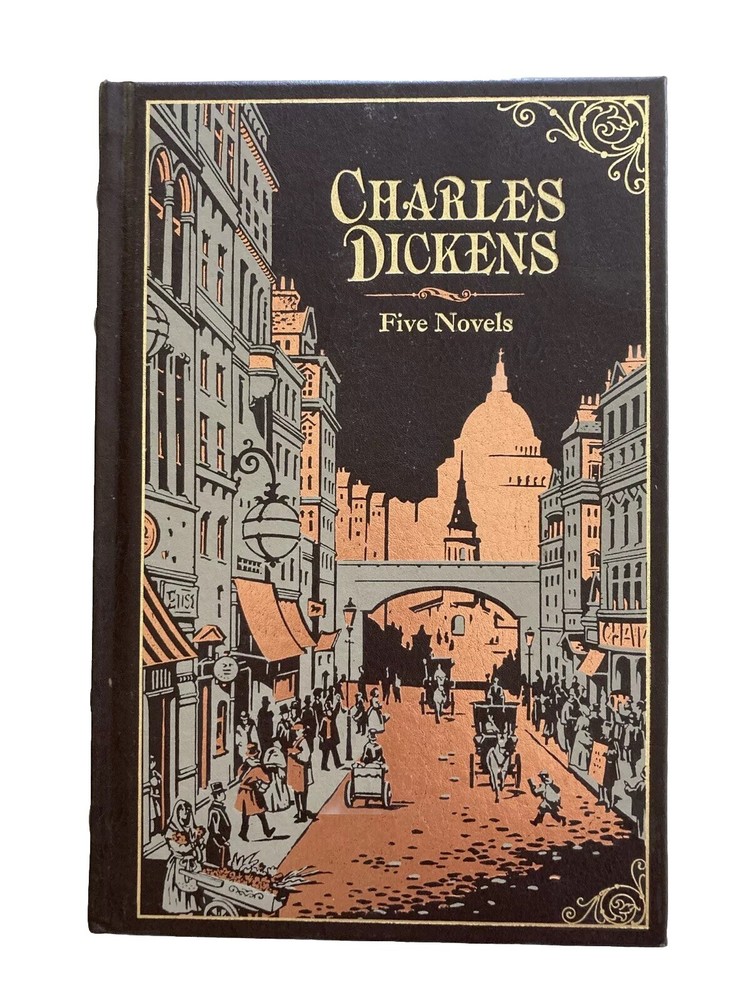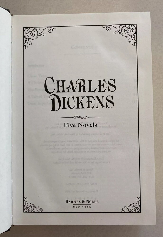 Charles Dickens: Five Novels, a 2010 Barnes & Noble deluxe edition leather hardcover book with colorful impressions. Book is in very good condition. Covers and spine are solid and tight. Some light handling wear to the covers. Pages are clean with no marks or writing found inside. Book edges are gilt; some shelving scuffs and marks to the gold gilt. Book includes a ribbon marker (intact). See photos. Shipped with USPS Media Mail. Includes: Oliver Twist, A Christmas Carol, The Personal History of David Copperfield, A Tale of Two Cities, Great Expectations.