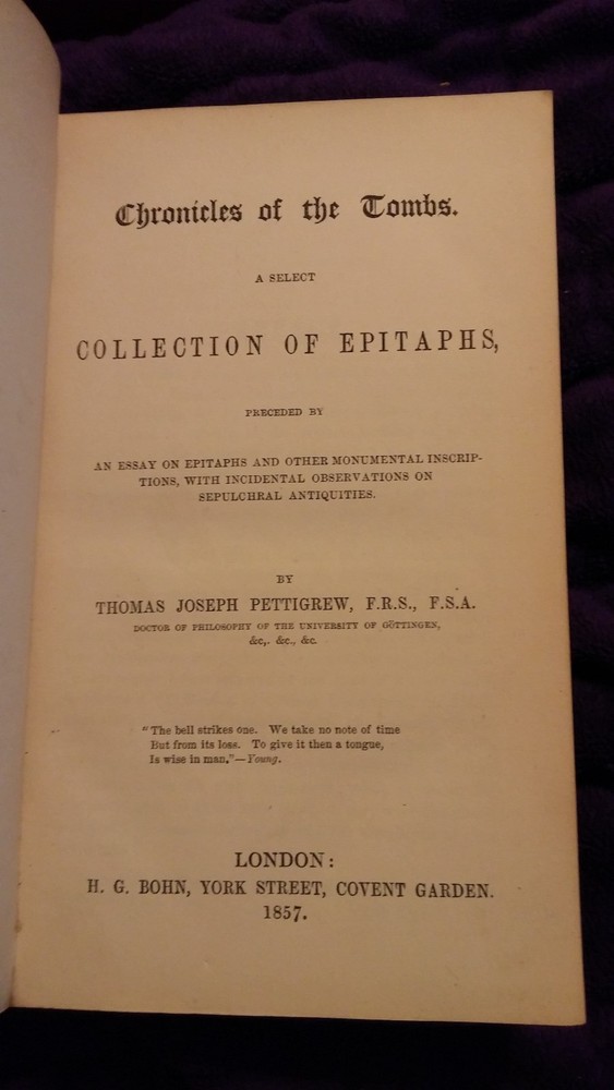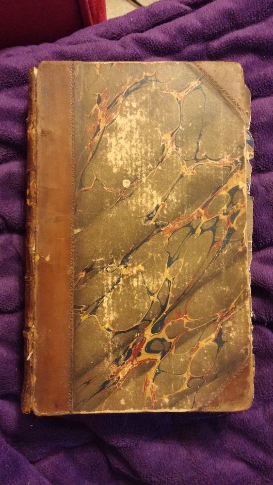 This auction is for a volume of "Chronicles of the Tombs - A Select Collection of Epitaphs" by Thomas Joseph Pettigrew. Published in 1857. Pettigrew was also known as "Mummy" Pettigrew for his interest in mummification; he is said to have thrown parties where he would open and dissect mummies for his guests. Quarter leather with marbled boards, and marbled page edges all around. Faults listed above, pages are generally quite clean and binding is holding well despite the board issues. Purchased at auction. Feel free to ask any questions. Good luck and thanks for bidding! You can bid with confidence. I have been an eBay member in good standing since the 1990's, and continue to receive terrific feedback both as a buyer and a seller. I am not a professional dealer; just a regular guy who buys and sells stuff on eBay when I have something to sell or find something to buy. If you need more photos of an item please just ask.