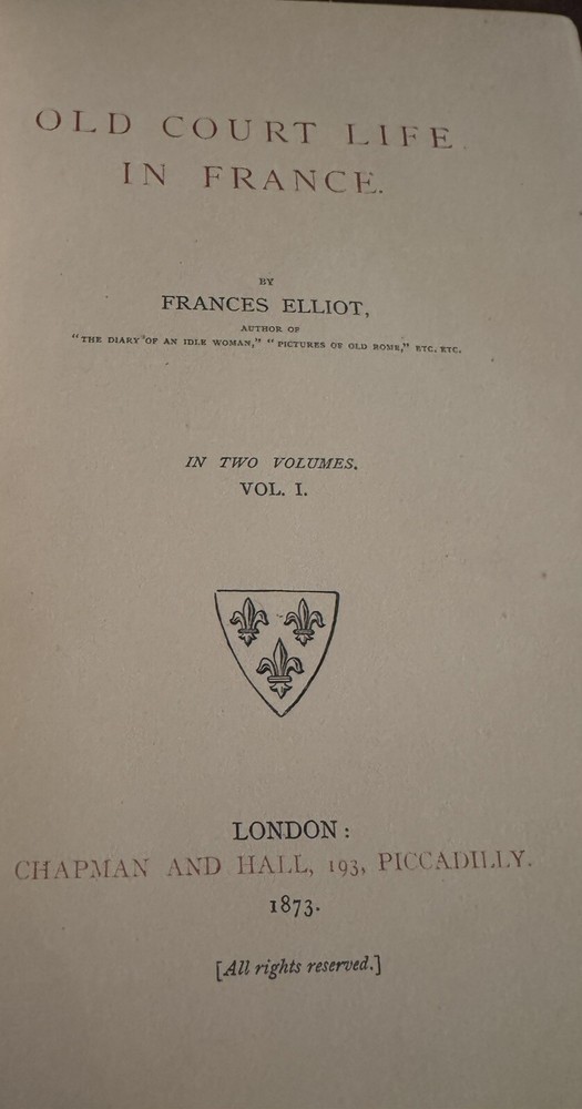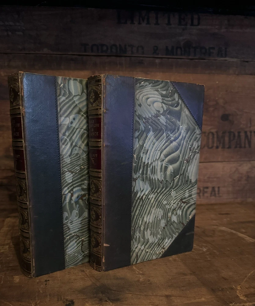 Item : Leather Book Set OLD COURT LIFE IN FRANCE Age : c. 1873 Author : Frances Elliot Publisher : Chapman & Hall; Piccadilly, London. Printed : Virtue & Co.; City Road, London. Condition : Good Dimensions : 8 3/4” x 6” x 1 3/8” Notes : Complete two volume book set. Leather spine and corners. Gilded spine lettering and design. Close to a 900 page volume set. Wear commensurate to age. Estate lot purchase, San Marino, CA. Come well packaged in sealed acid free clear sleeve.