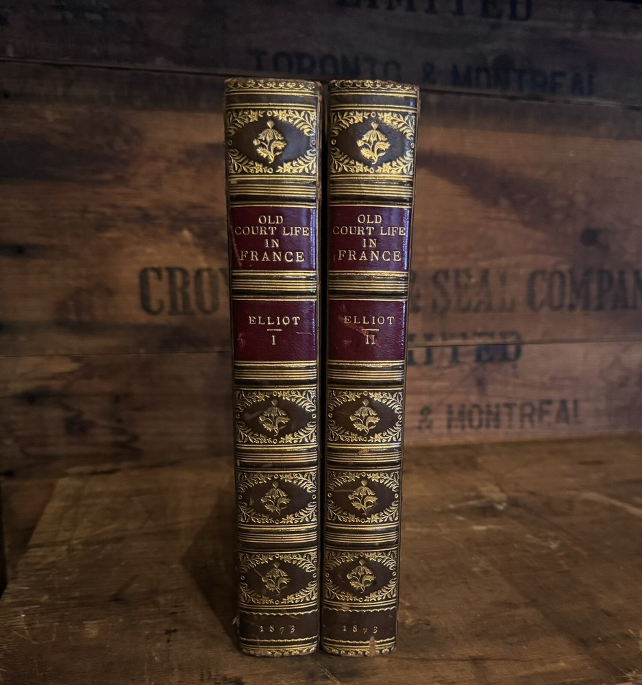 This stunning 1873 leather-bound set of *Old Court Life in France* by Frances Elliot is a true collector's gem! The gilded detailing and aged leather give it a regal charm, while the near-900 pages offer a fascinating historical journey. Despite its age, the set remains in solid condition, with only minor wear. The acid-free packaging ensures it stays preserved. A gorgeous addition to any antique book lover’s shelf—history and elegance in one!