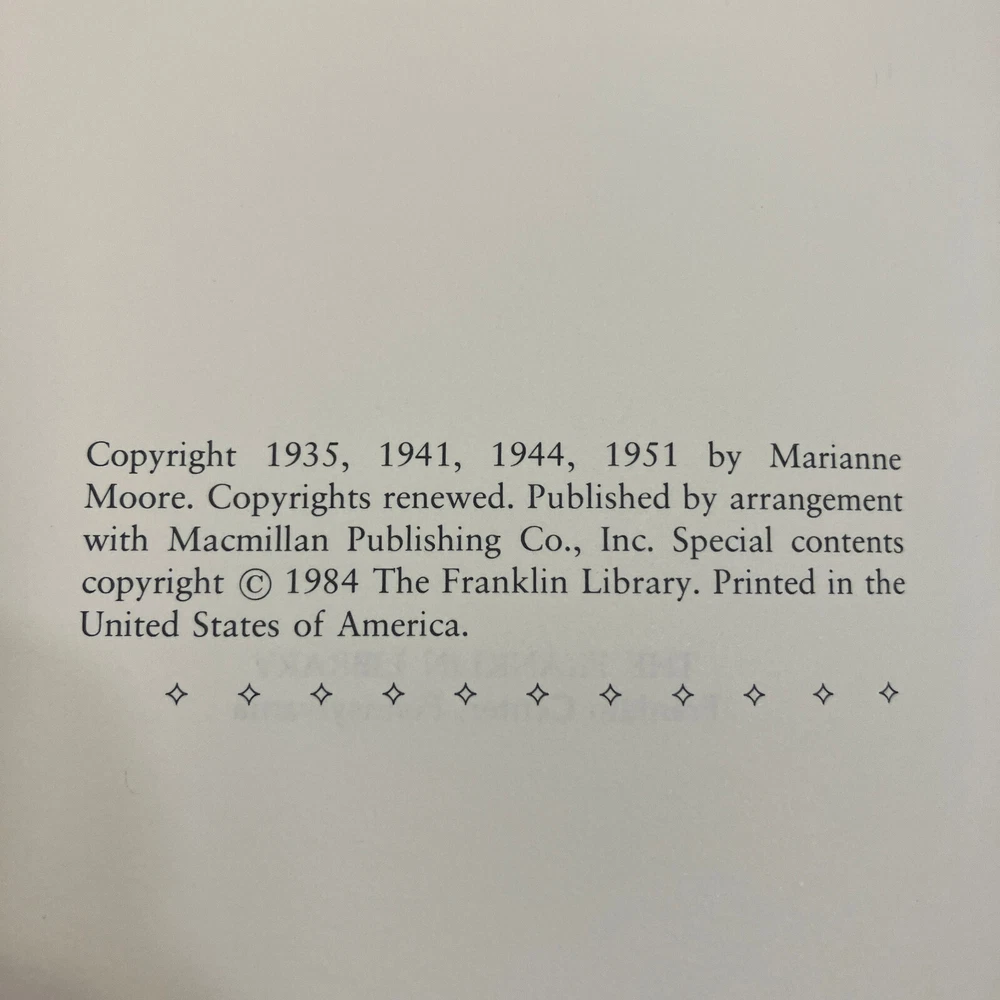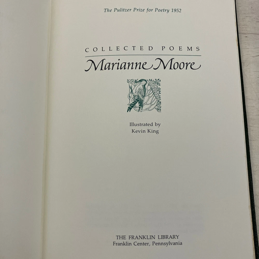 Collected Poems Marianne Moore Franklin Library 1984 Special Edition Leather This is a used book with general edge and shelf wear. Some spotting and foxing to page edges, and damage to the gilded design on the cover. Moderate unidentified smell. Binding is intact, no writing. See pictures for overview of condition. We are BrightLight Books. We have sold tens of thousands of items online since 1998. Money Back Guaranteed! For Local Pickup in our Fern Park, FL store, please message us! 34-14 (5010680) 11/13/24 JW