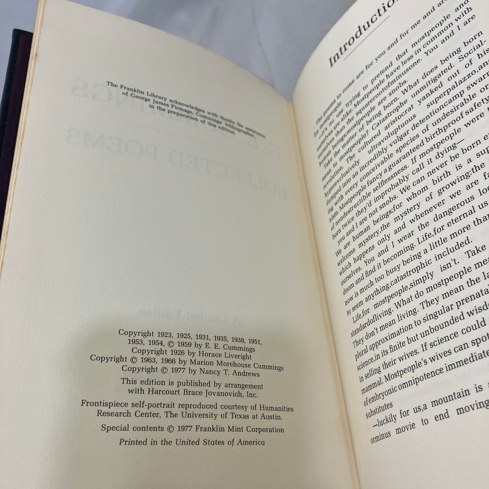 Collected Poems of E.E. Cummings Franklin Library Limited Edition 1977 HC This is a used book with general edge and shelf wear, some fading to the covers/front page and spotting on gilded page edges. Binding is intact, no writing, stains, or unusual smells. See pictures for overview of condition. We are BrightLight Books. We have sold tens of thousands of items online since 1998. Money Back Guaranteed! For Local Pickup in our Fern Park, FL store, please message us! 10-45 (5010651) 11/11/2024 AH
